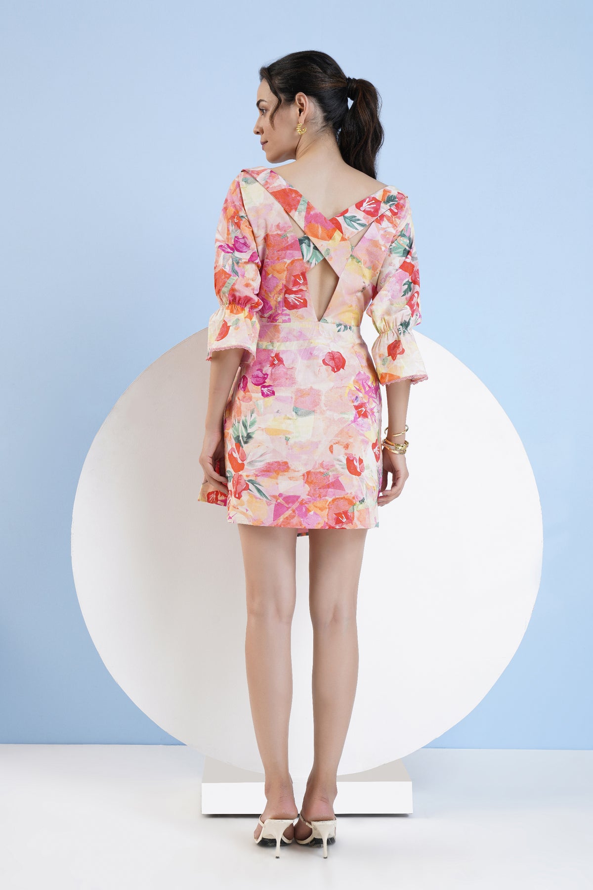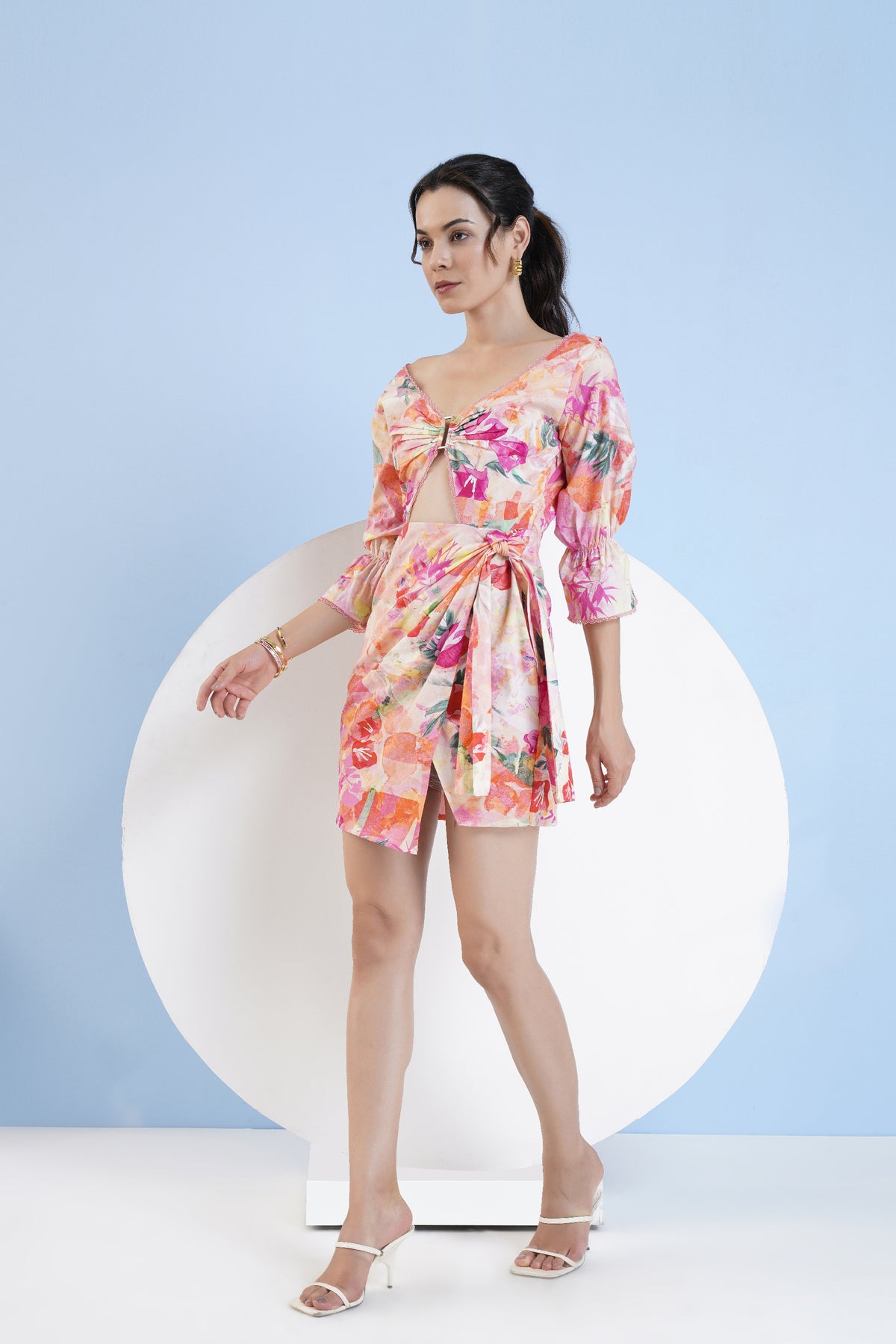 Printed short cotton dress featuring buckle detail, cutout and puff sleeves