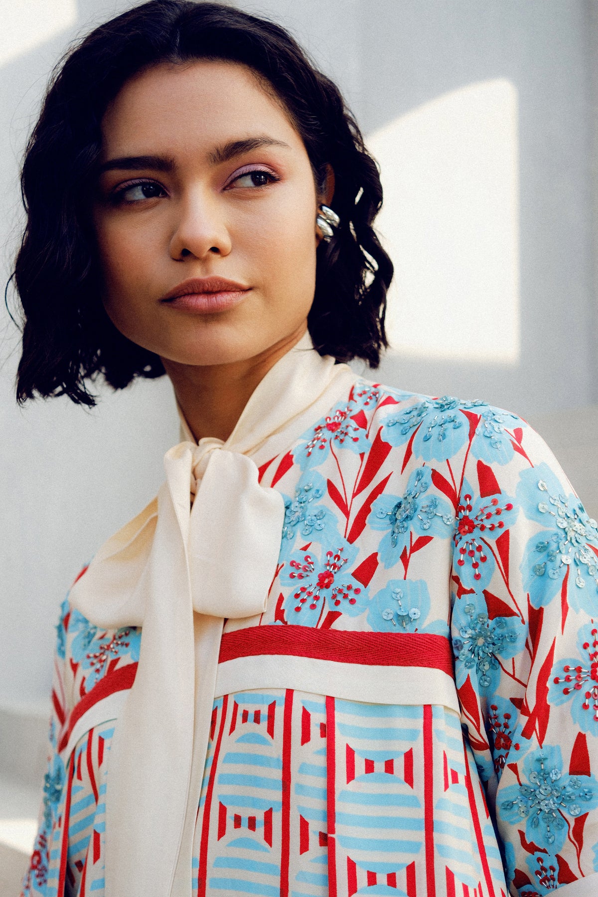 The white illusion dress is made of double georgette. It features geometric and floral print play with a contrasting white tie-up detailing around the neck.