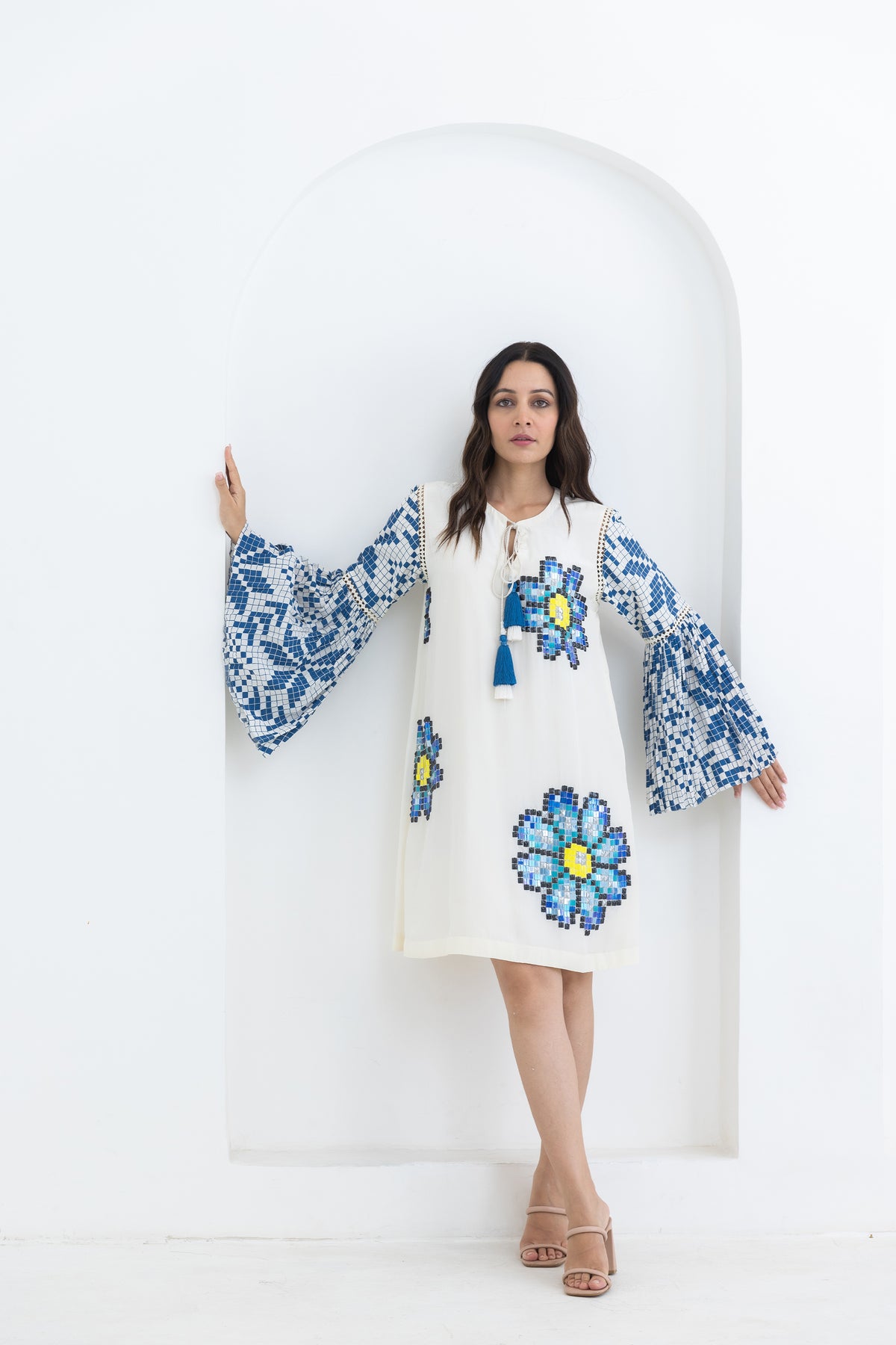 This shift dress has floating flowers on the front , sleeves are detailed with cutwork lace and gathers. Neck has interesting tassel detail