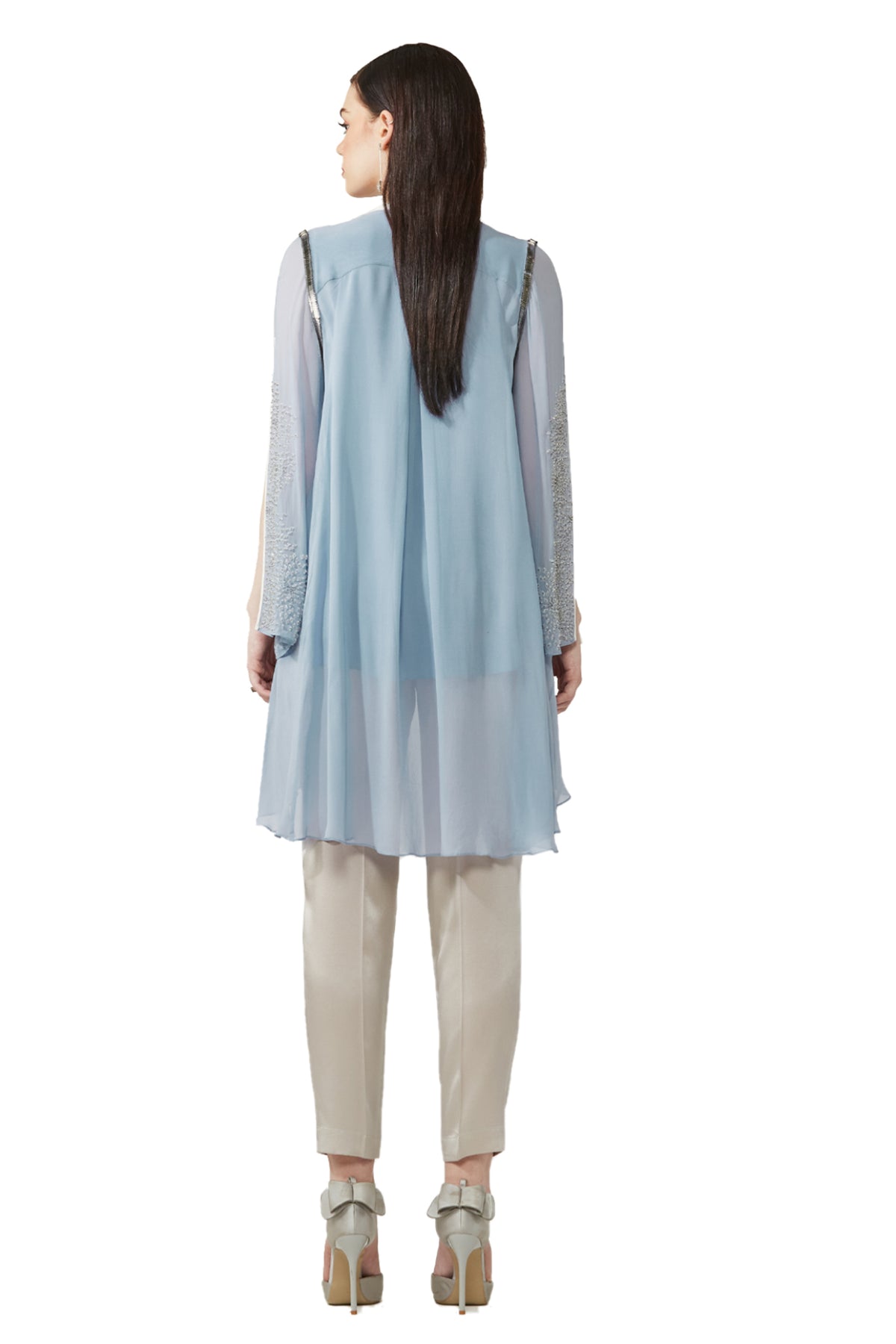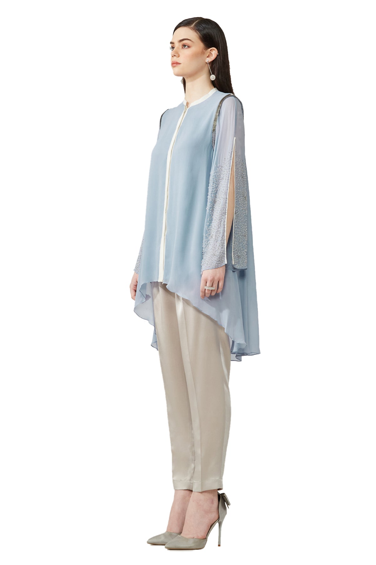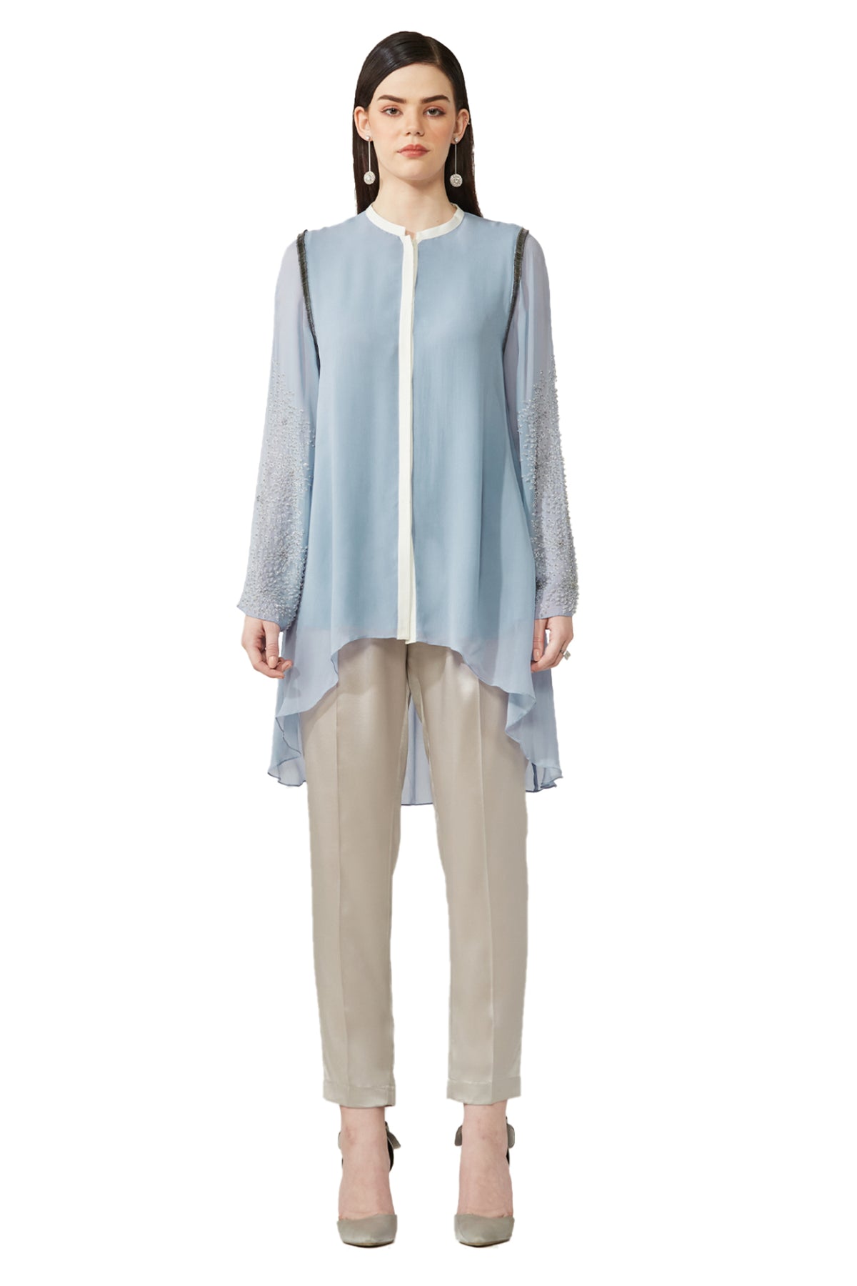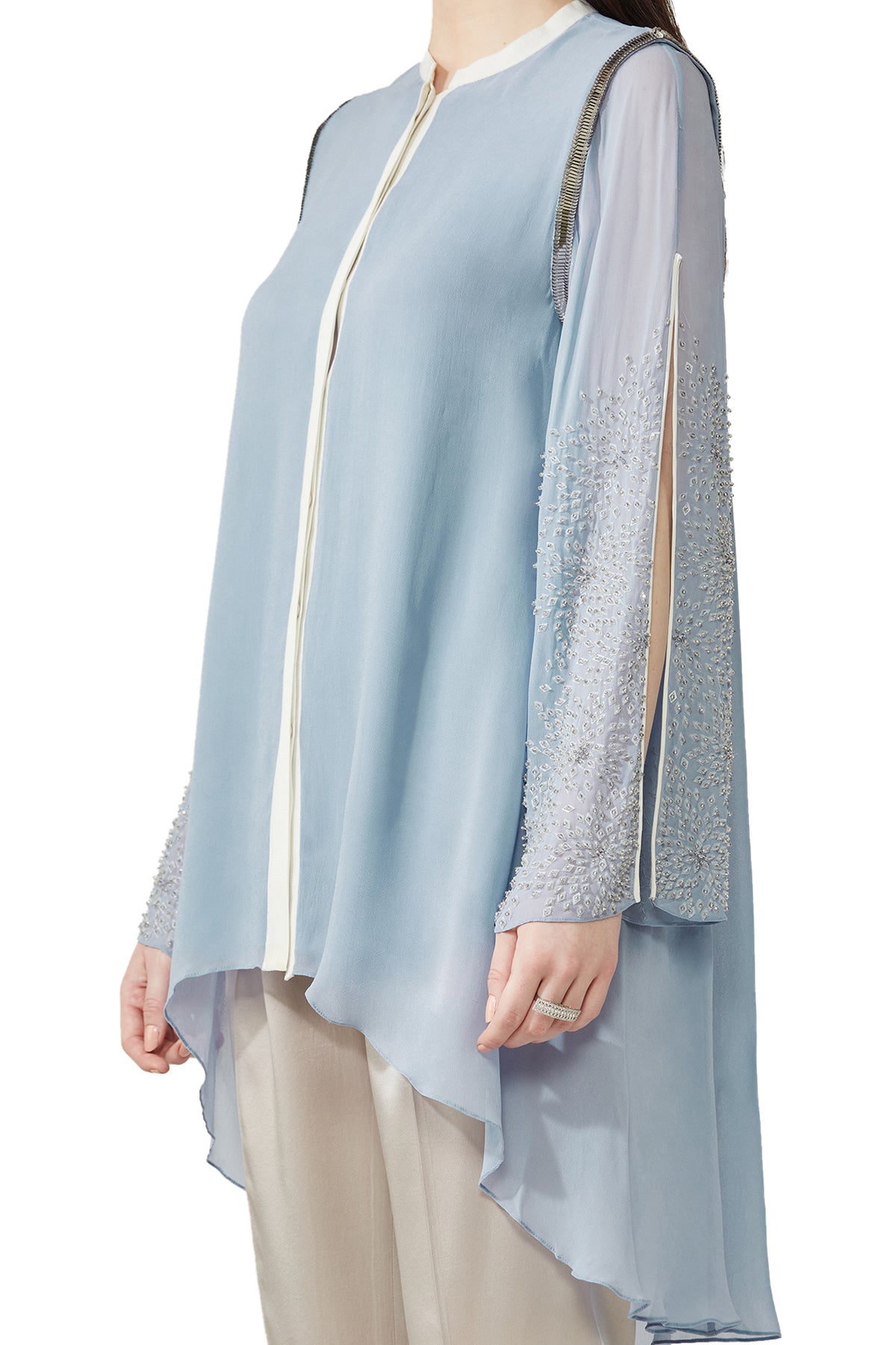 This georgette asymmetrical swing top with long sleeves features metallic channeled embroidery on its armholes.