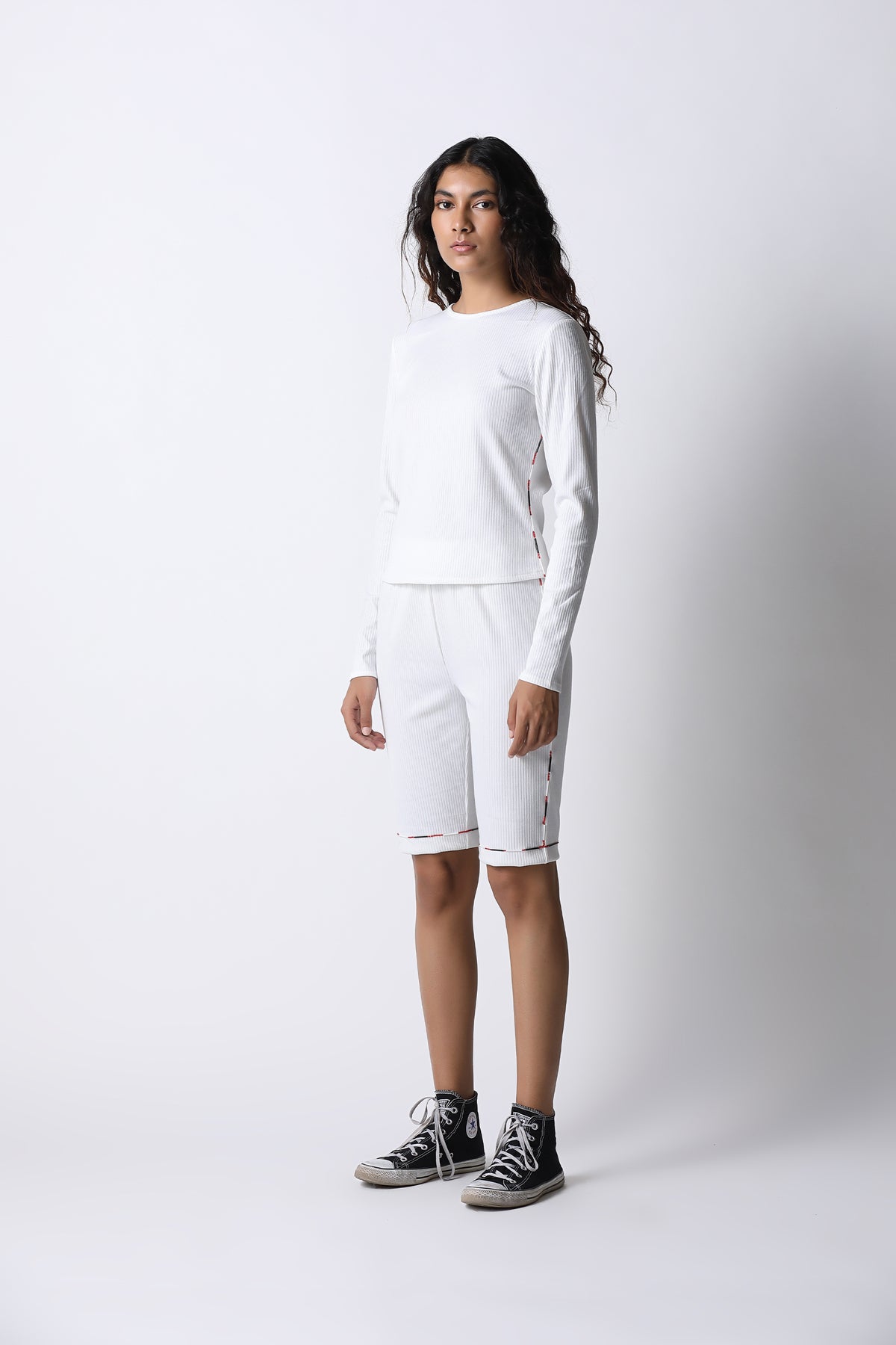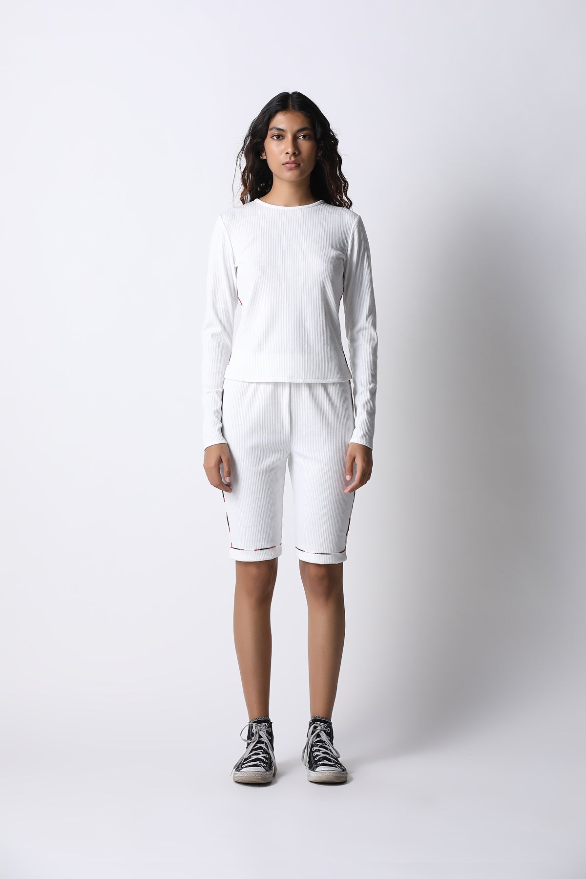 Your basic tee elevated. The base o.1 cut in a ribbed lycra features a long sleeved fitted tee with an interesting teardrop shaped cut out at the back. It is further enchanced with stringed beads hand embroidered on the side seams. Wear it with your jeans and layer it up with jackets for the cold.  Seen here with the ribbed shorts