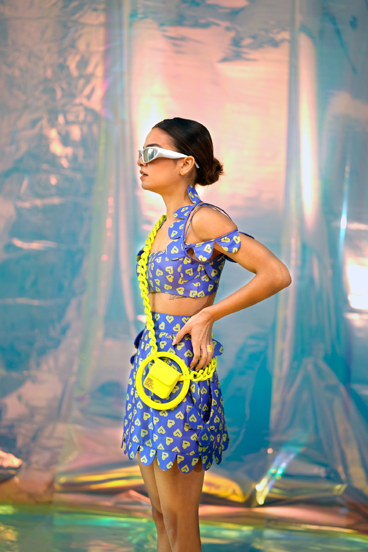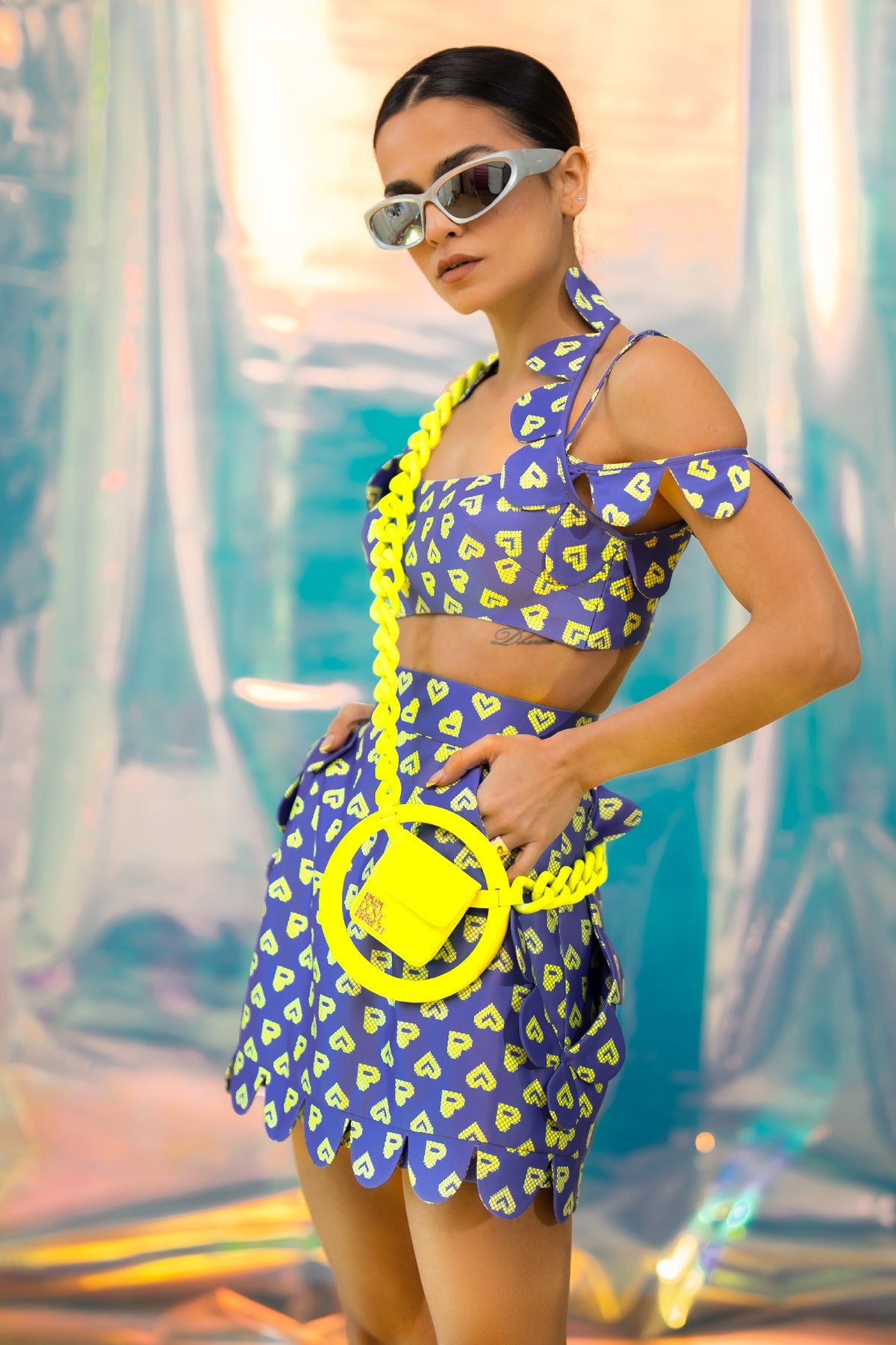 A satin bralette with a halter neckline with scallop detailing, in our blue pac street girl print and contrast neon green satin lining.