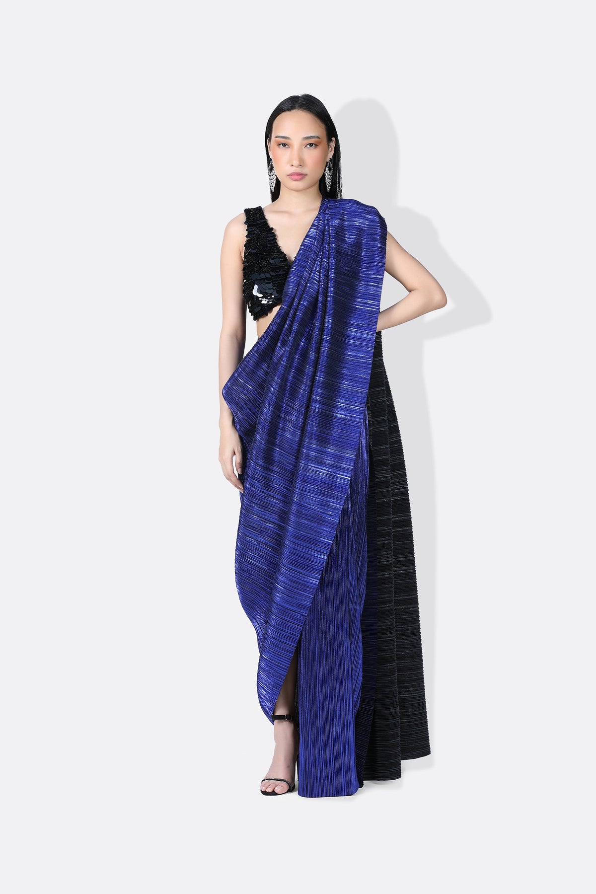 The gill blouse is that classic sexy blouse you need in your wardrobe. It is hand embroidered with round sequins of different sizes. Designed with a deep v neck and a curved shaped hemline. Closes at the back with hooks, it works as a great option to either wear with your saris or with pants for a cool modern look.