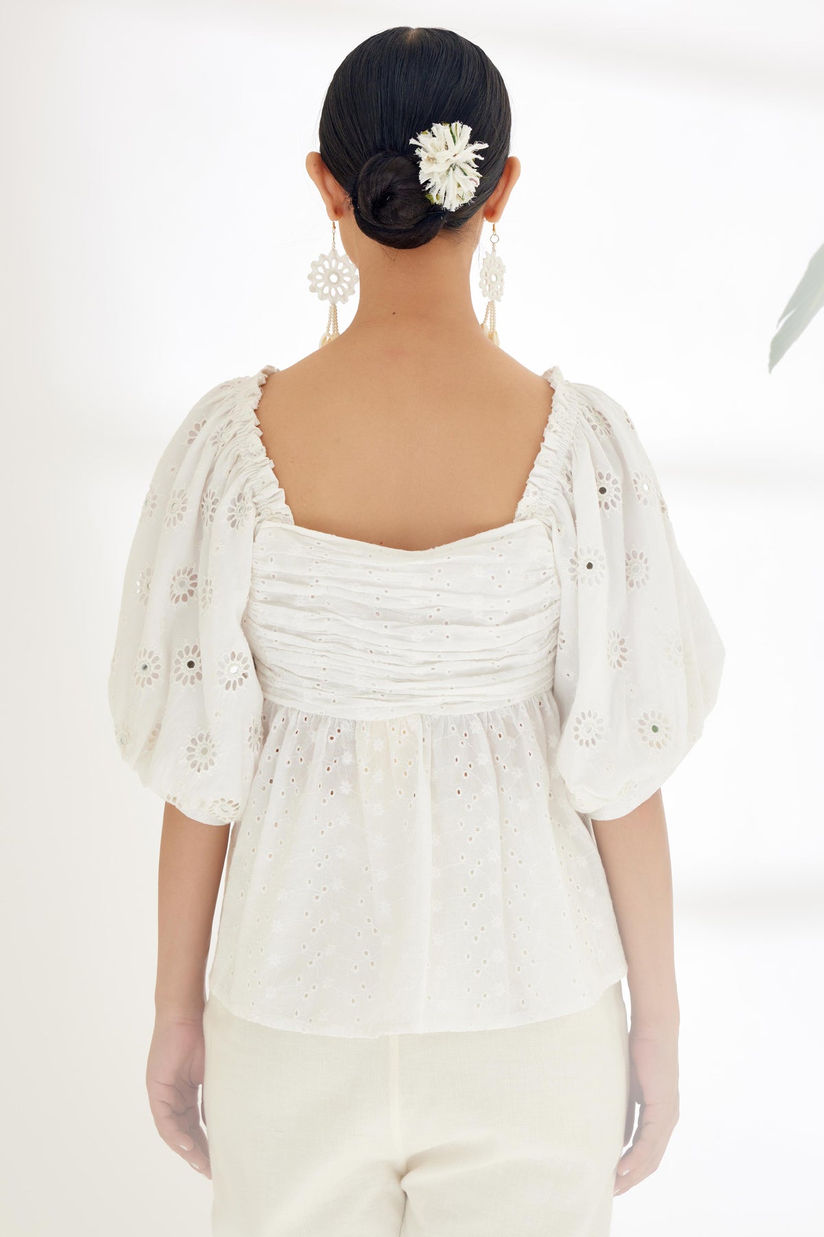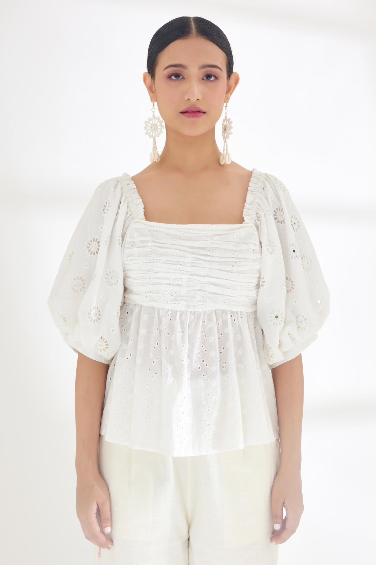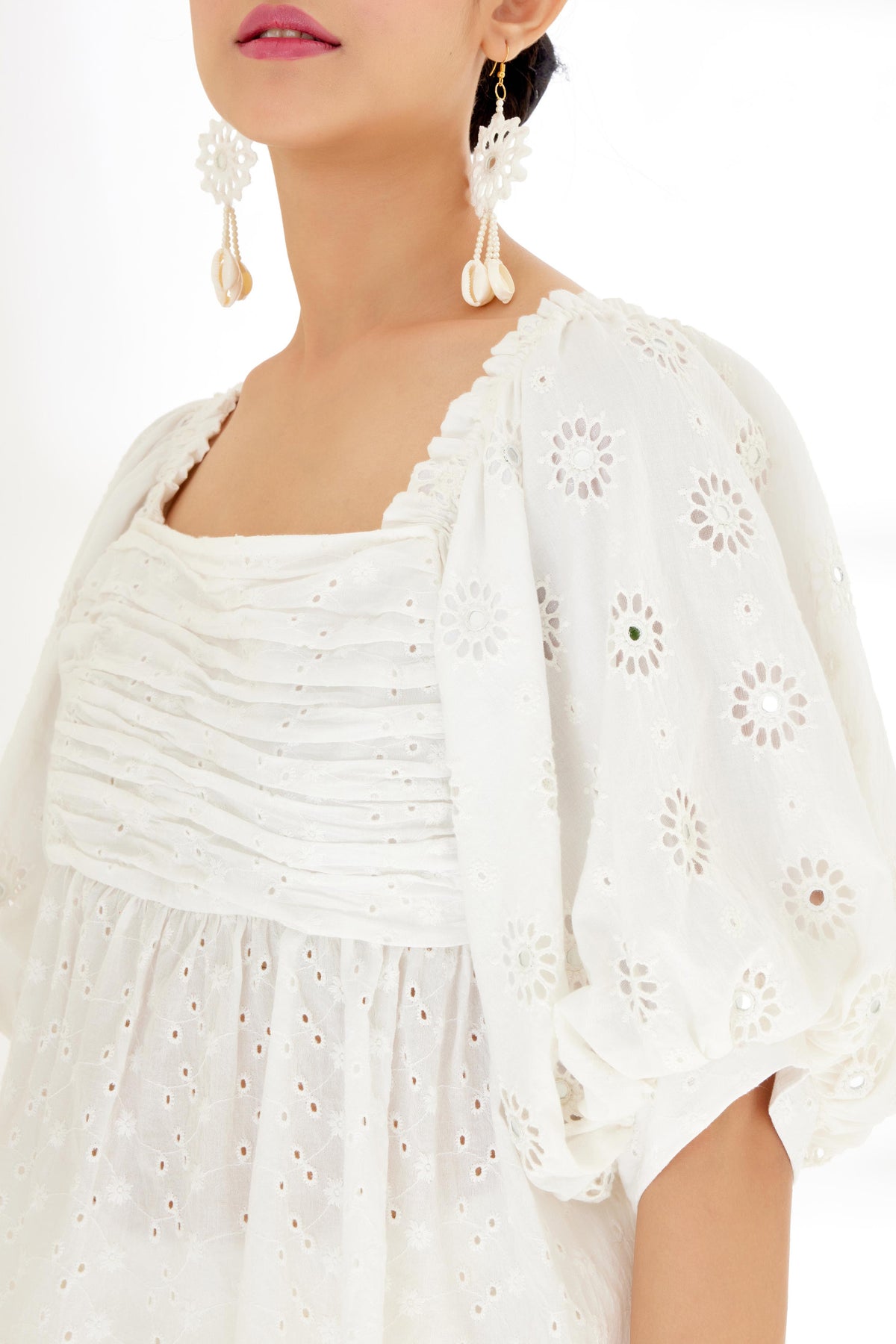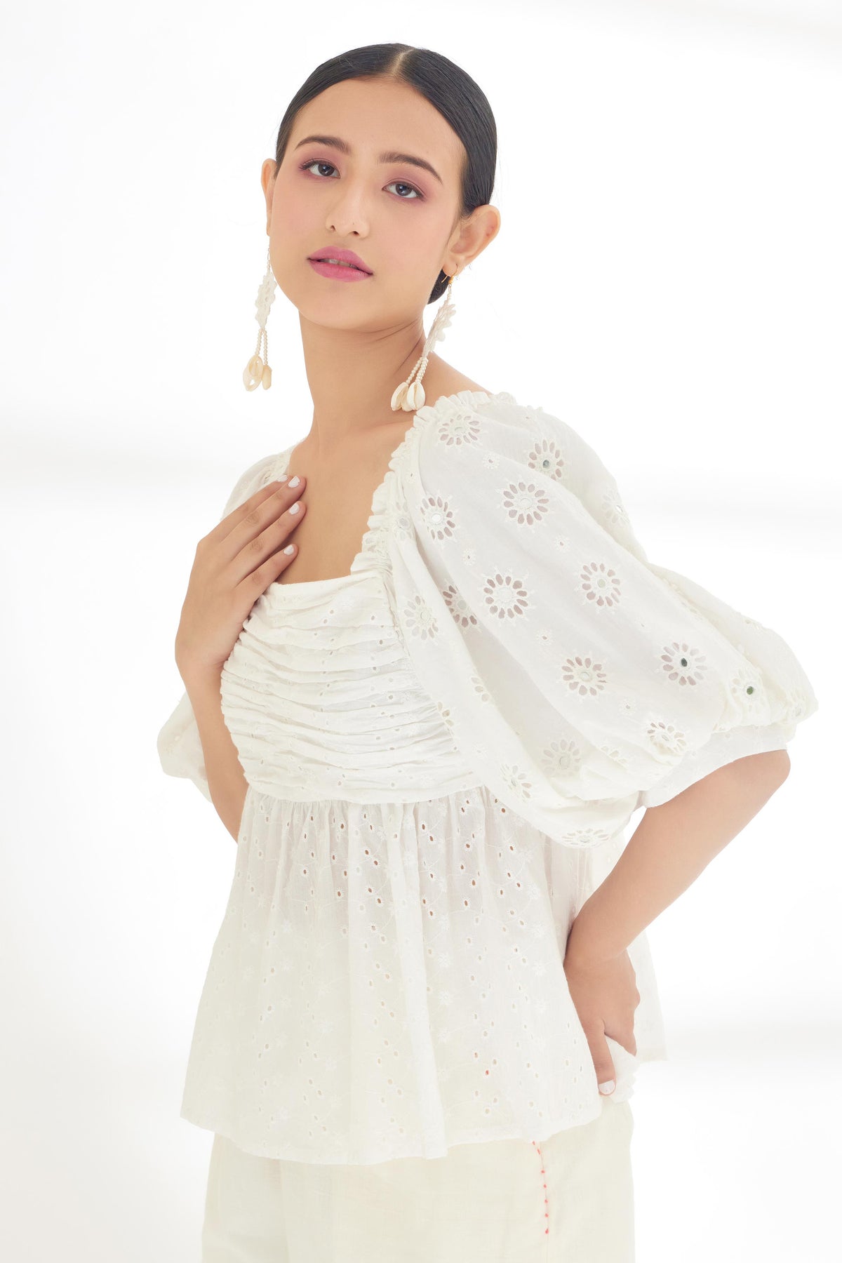 Ivory hand embroidered mirror work with rouching yoke and bubble sleeve top in 100% cotton.