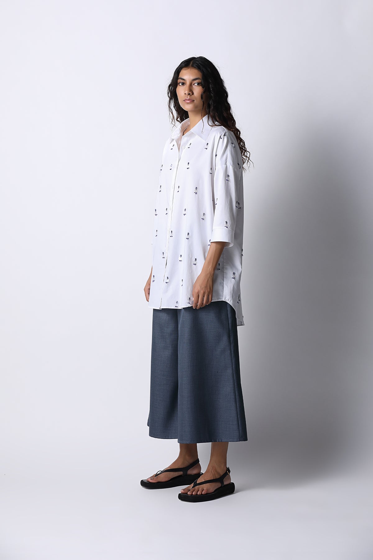 The jam shirt is cut in a lightweight silk that makes it a staple for everyday wear. It is a slightly oversized fit with dropped shoulders and 3/4th sleeves. The shirt is elevated with hand embroidered beads and sequins. Wear yours with smart pants or jeans, depending on your day ahead.