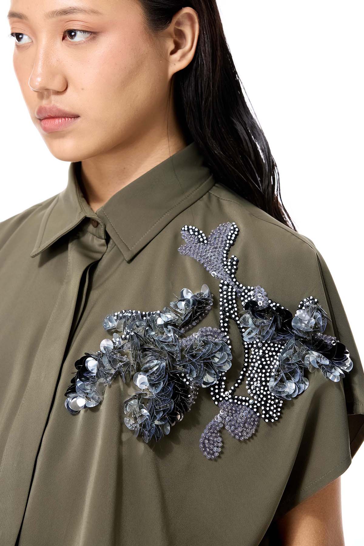 Drop shoulder embellished top with concealed placket.