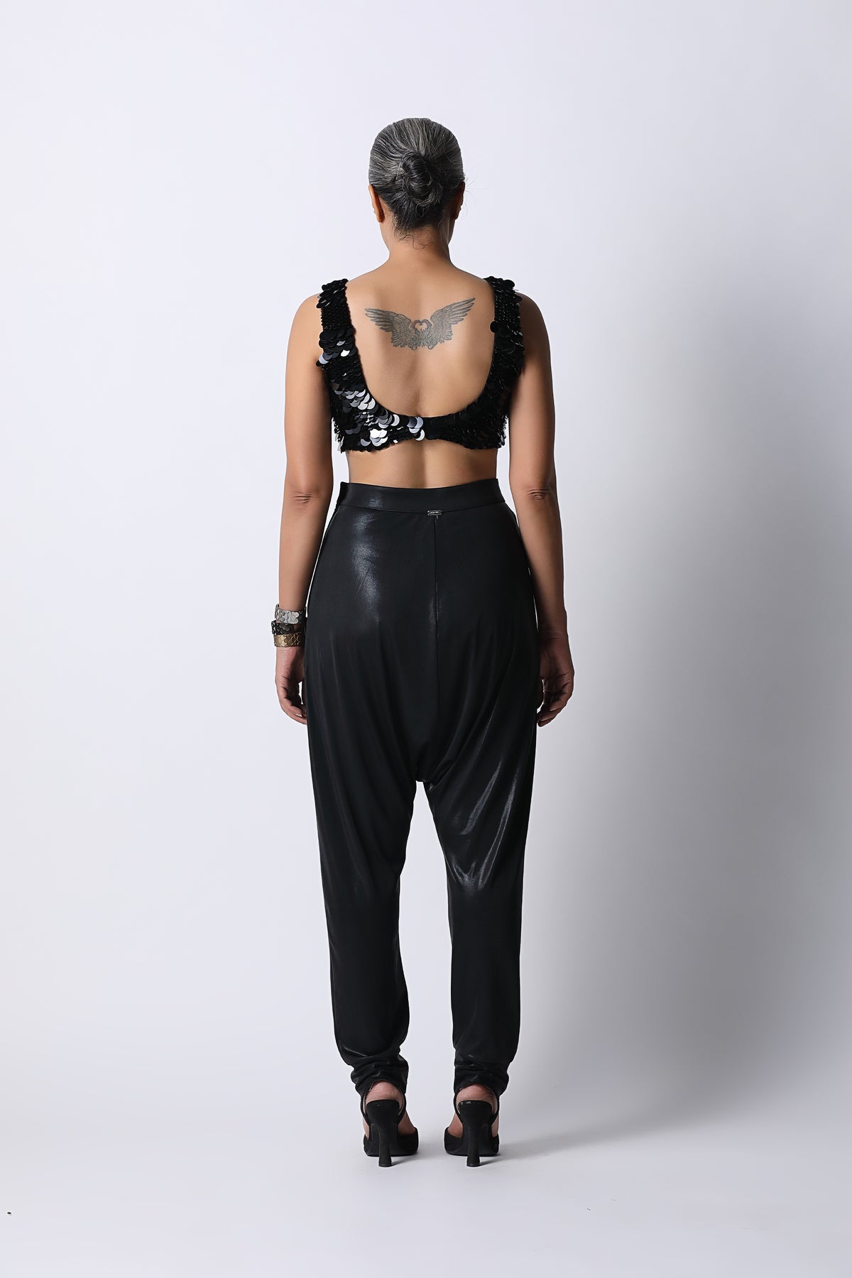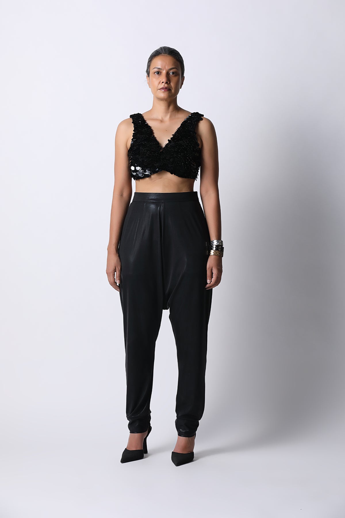 The gill blouse is that classic sexy blouse you need in your wardrobe. It is hand embroidered with round sequins of different sizes. Designed with a deep v neck and a curved shaped hemline. Closes at the back with hooks, it works as a great option to either wear with your saris or with pants for a cool modern look. Seen here with the jamilah pants