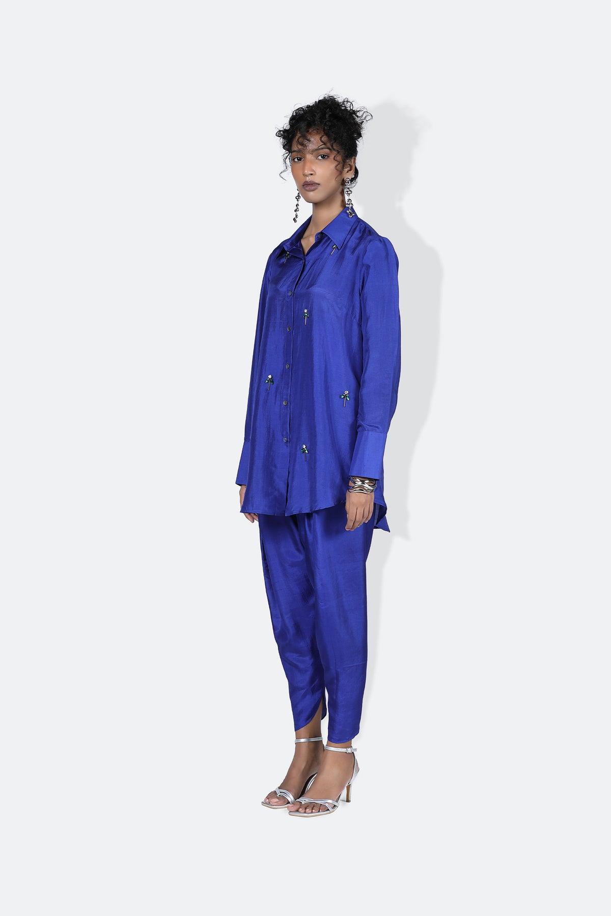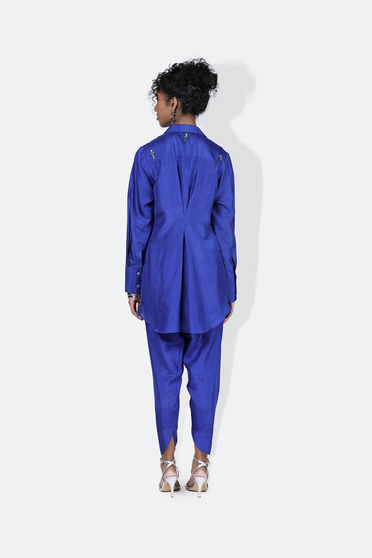 An exemplary shirt, the samar shirt is number one effortlessly. Scattered with hand embroidered rhinestone all over with unique placement , the shirt is mid thigh length and has full sleeves with a very minimal pleat detail on the back. Its our definition of a seasonless shirt.