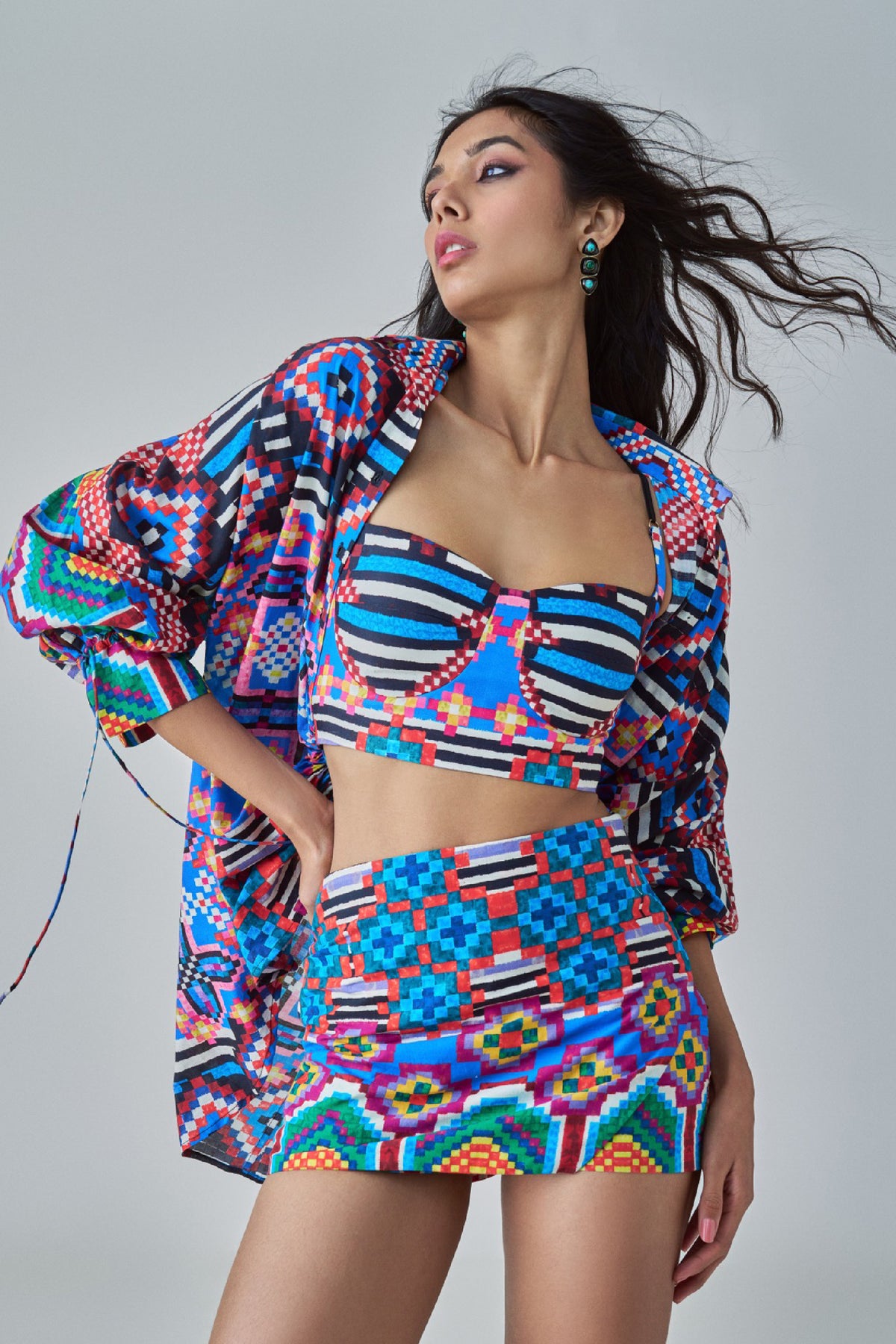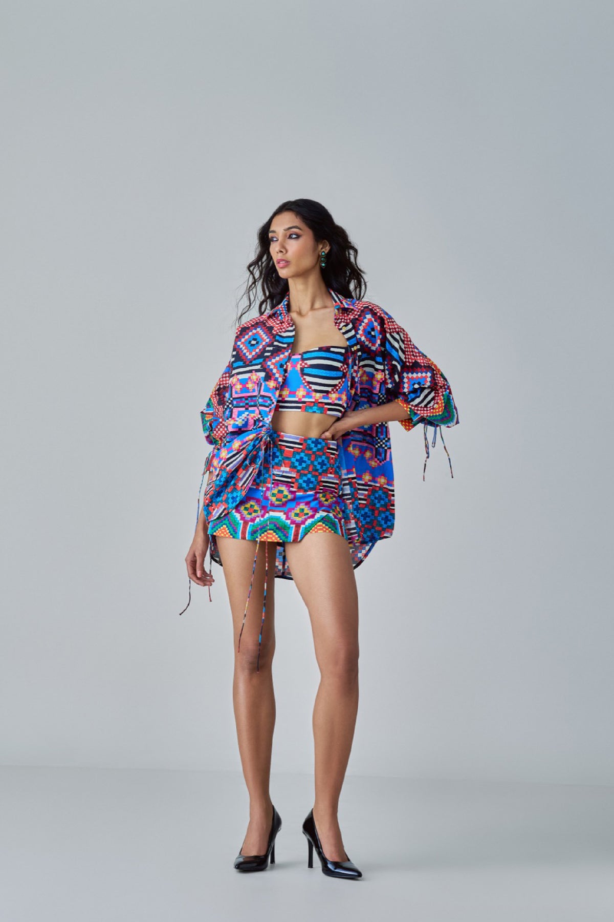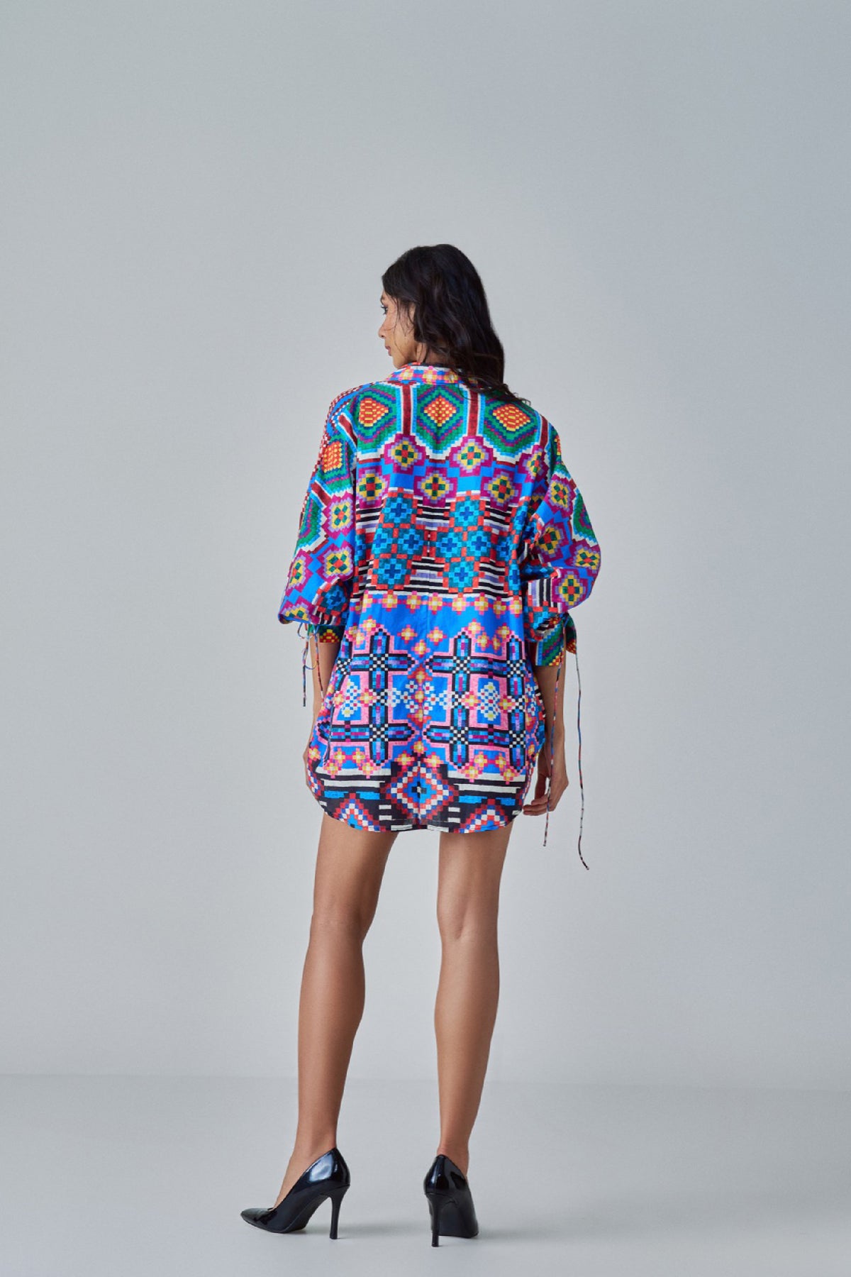 Ikat inspired collared batwing shirt with sleeve and waist tie ups
