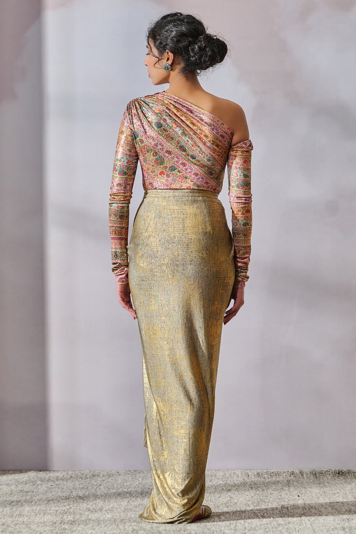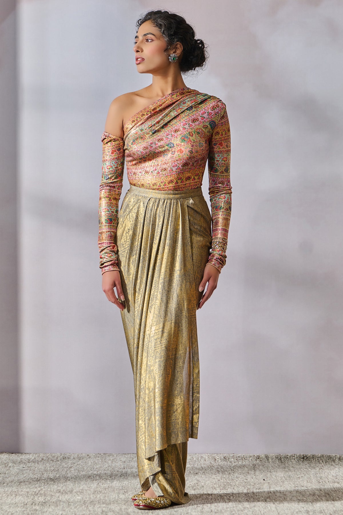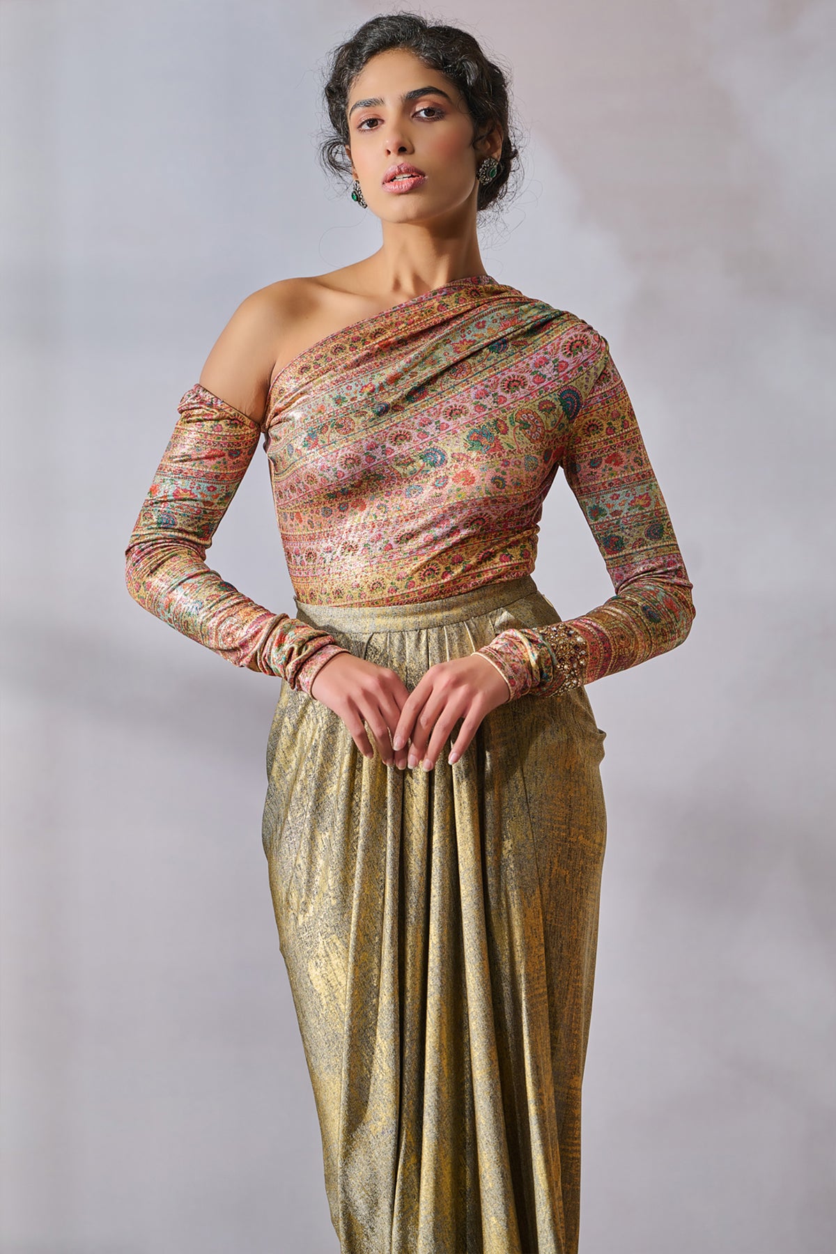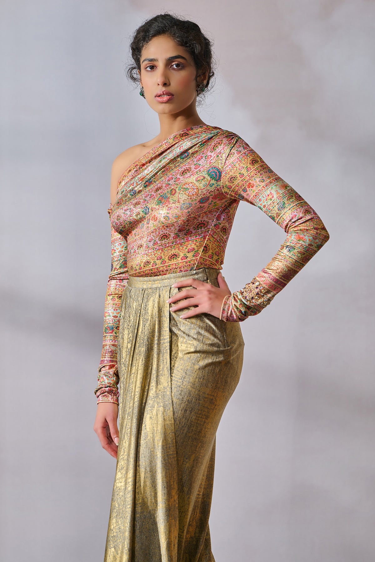 Abstract floral motif printed on a one-shouldered T-shirt.