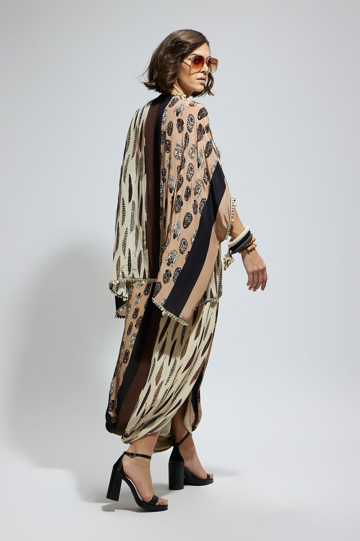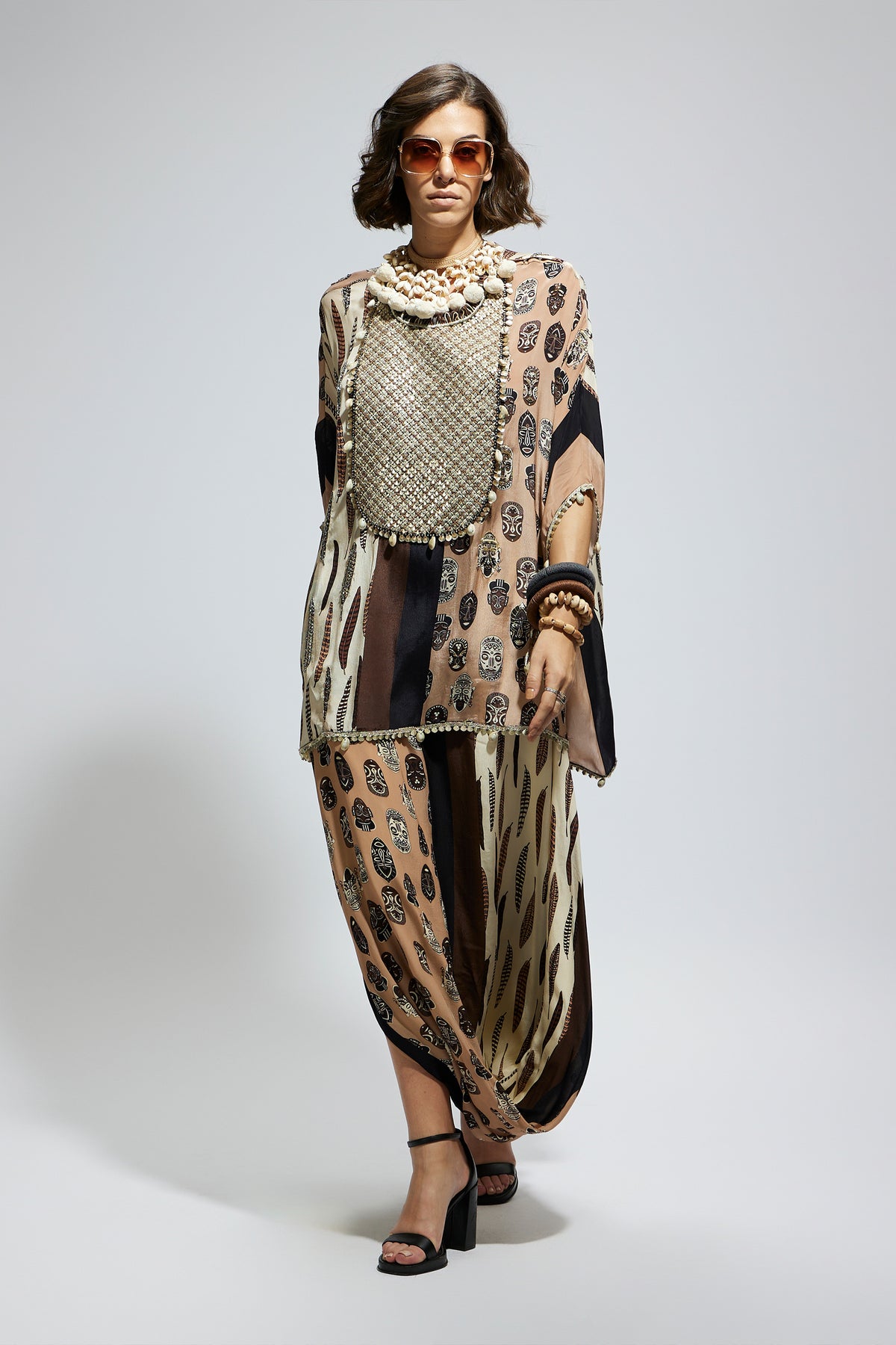 Mask and feather metallic embroidered yoke short kaftan paired with drape skirt