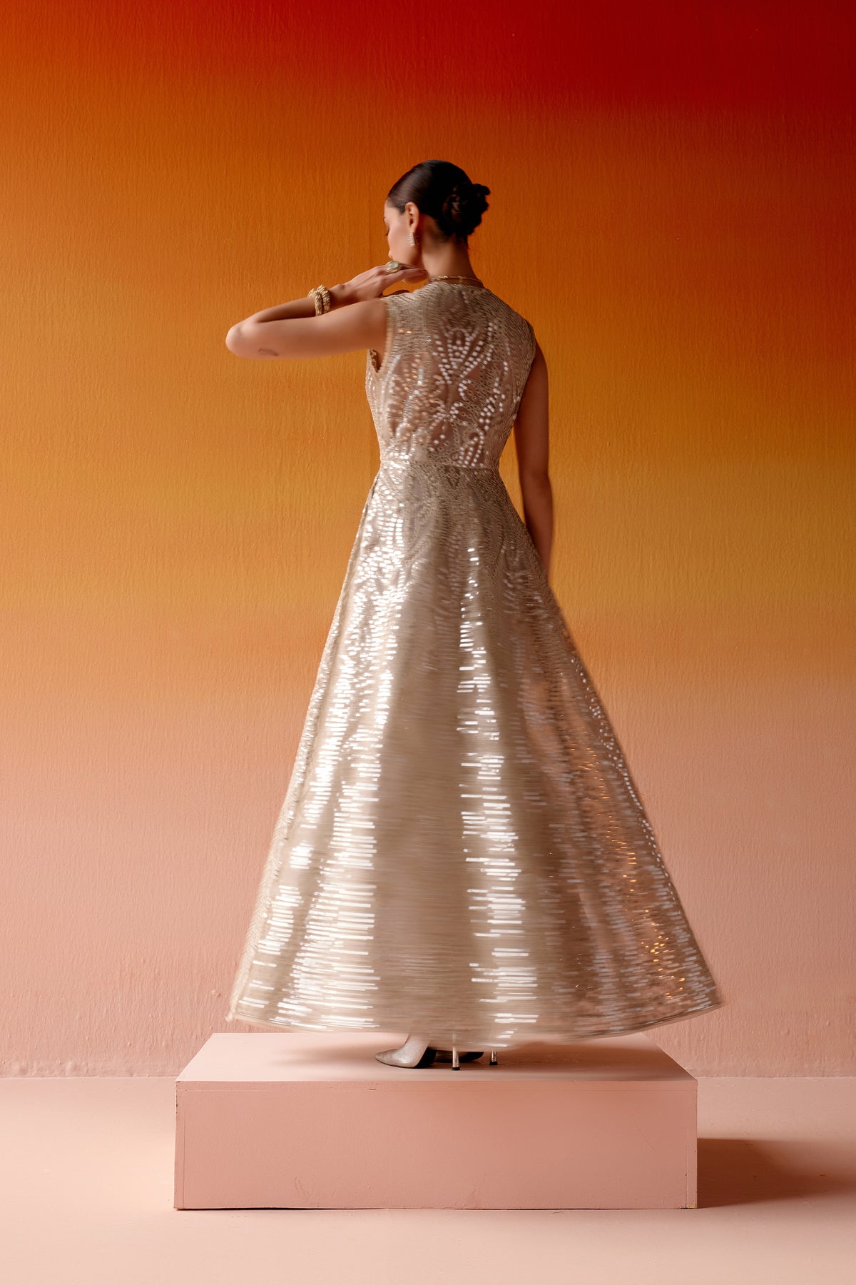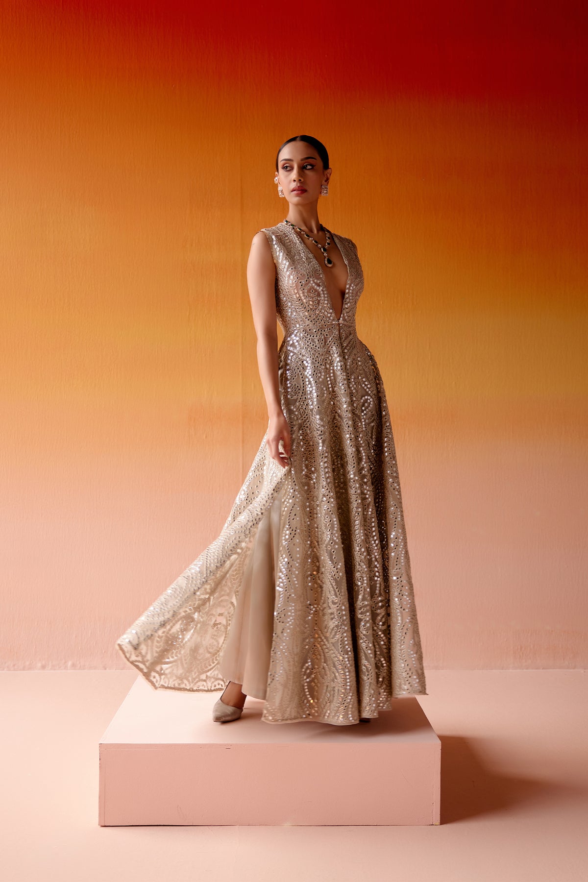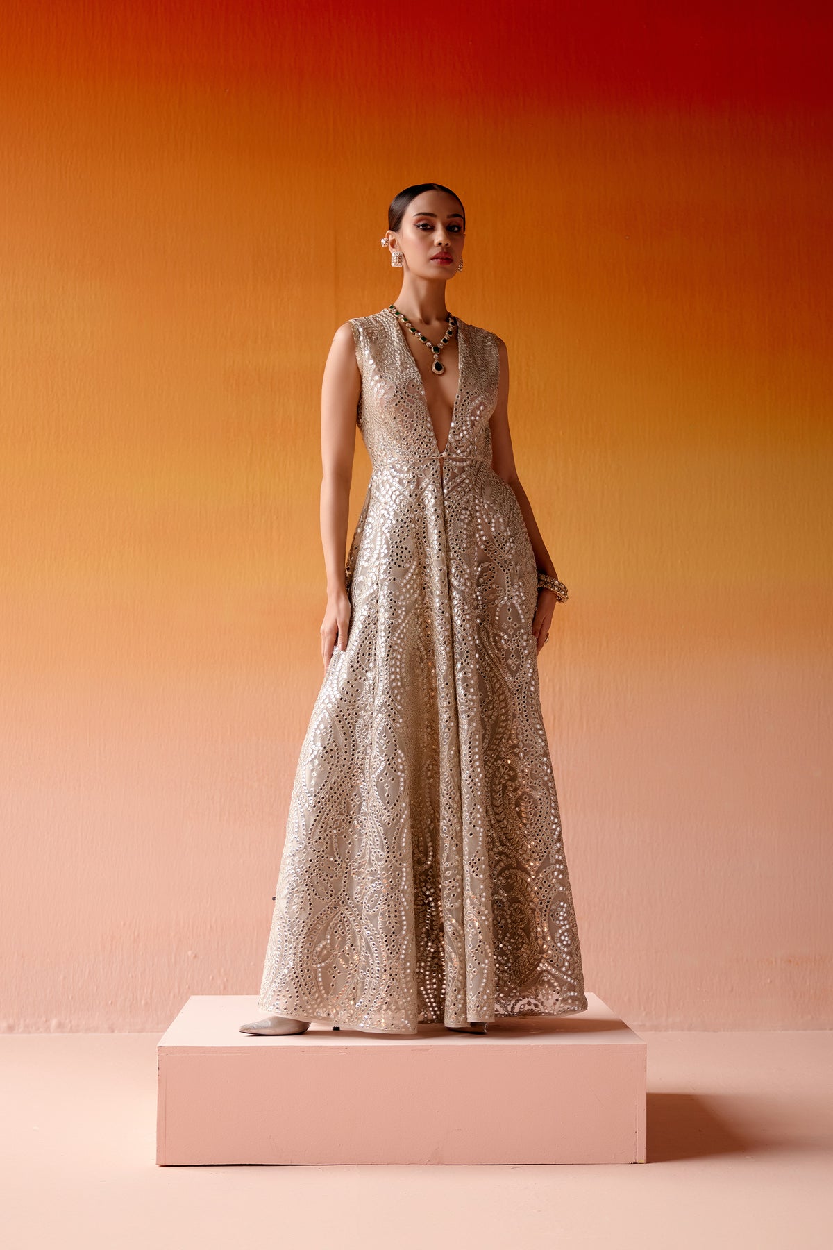 The long jacket features a plunging neckline and long slits. It is fully embellished with intricate mirrorwork.