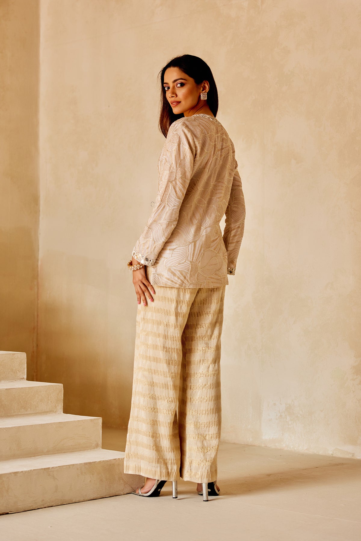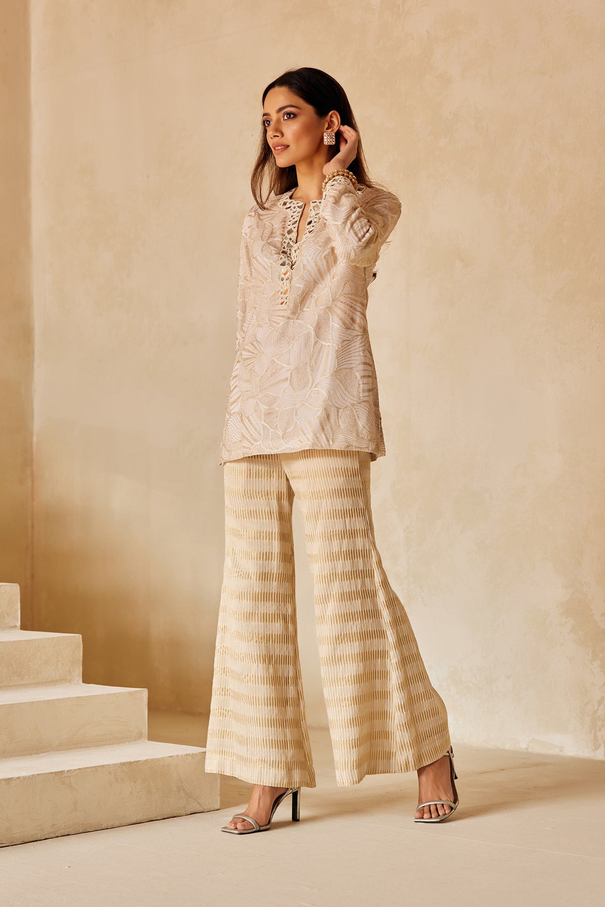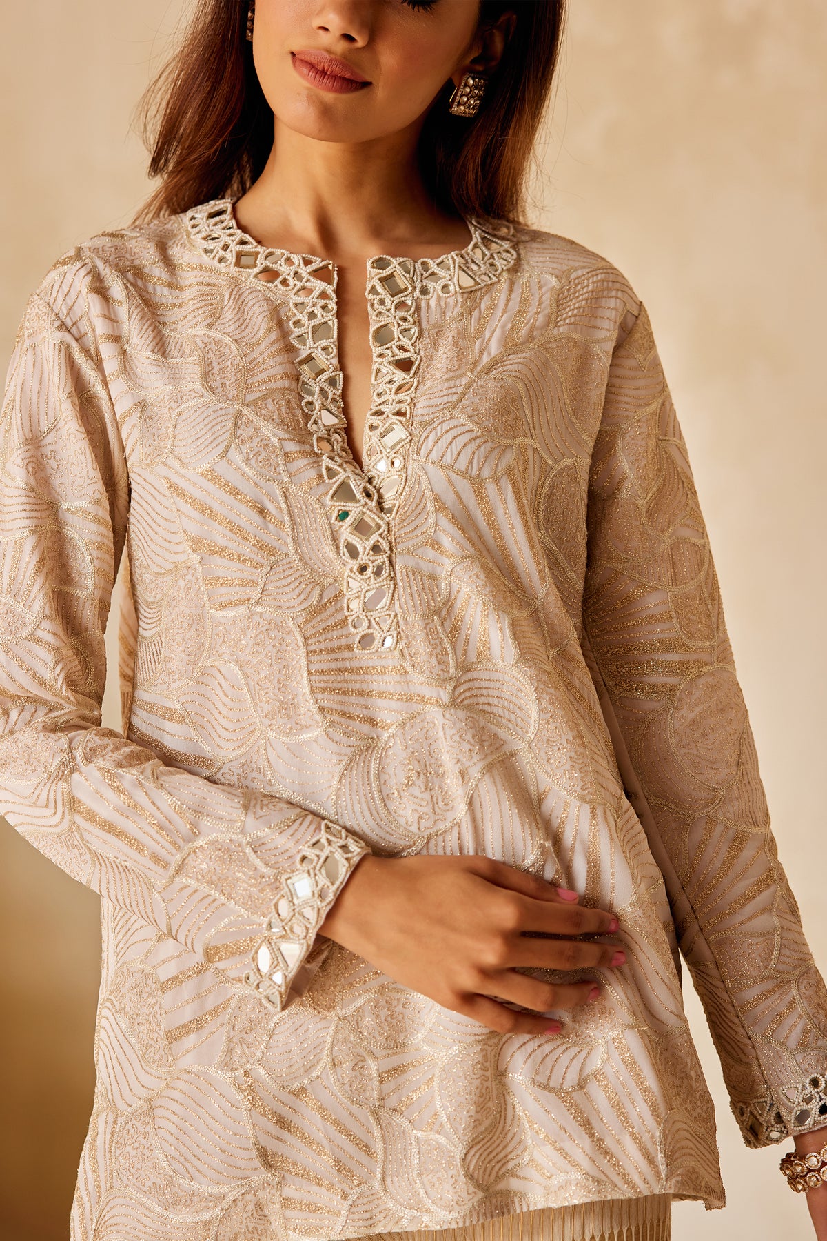 The tunic embodies a relaxed fit top with a plunging neckline with detailed mirrorwork and beadwork.