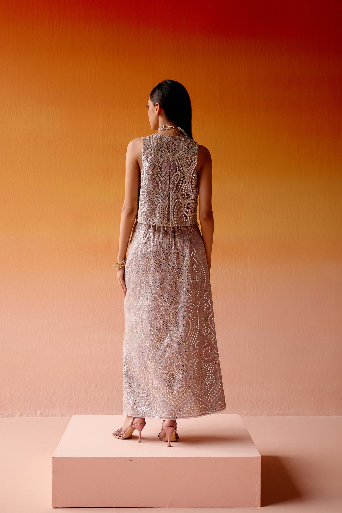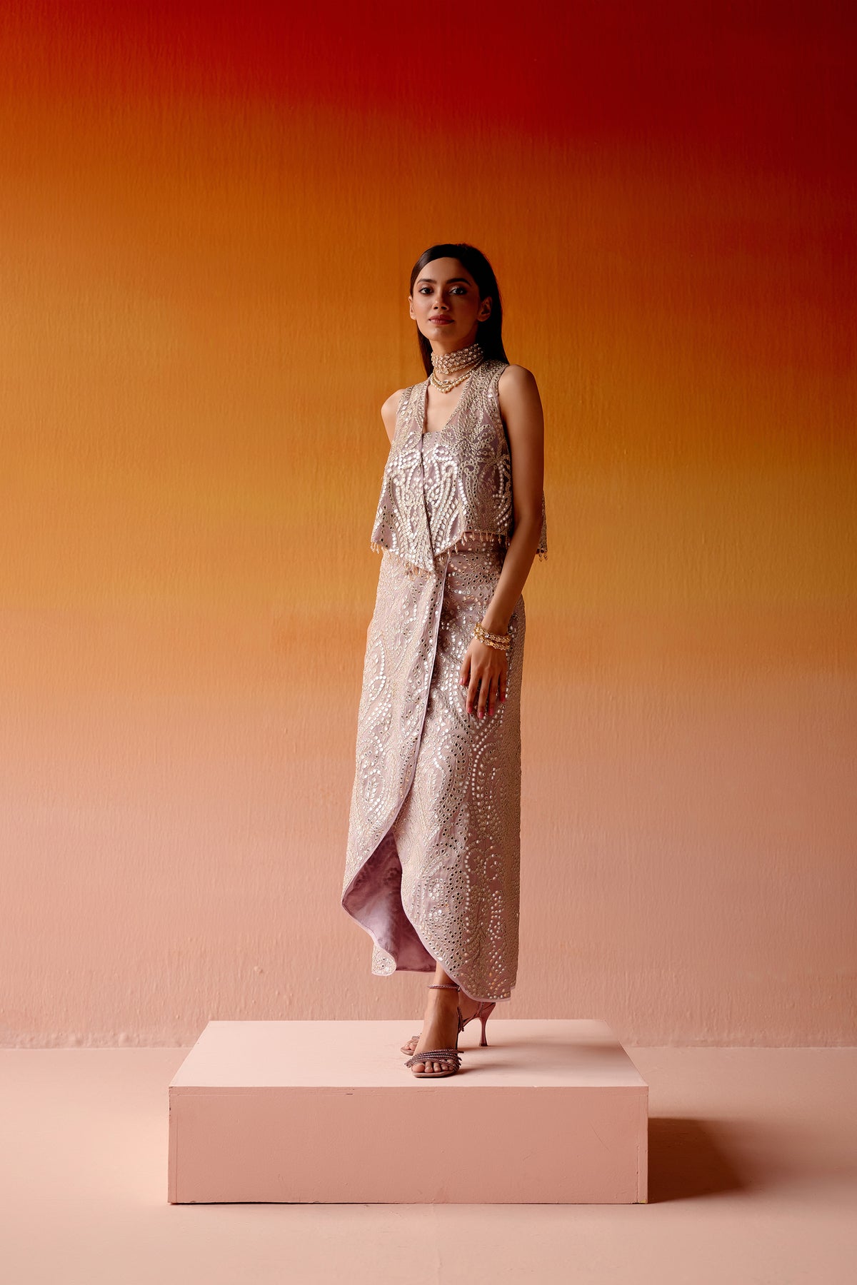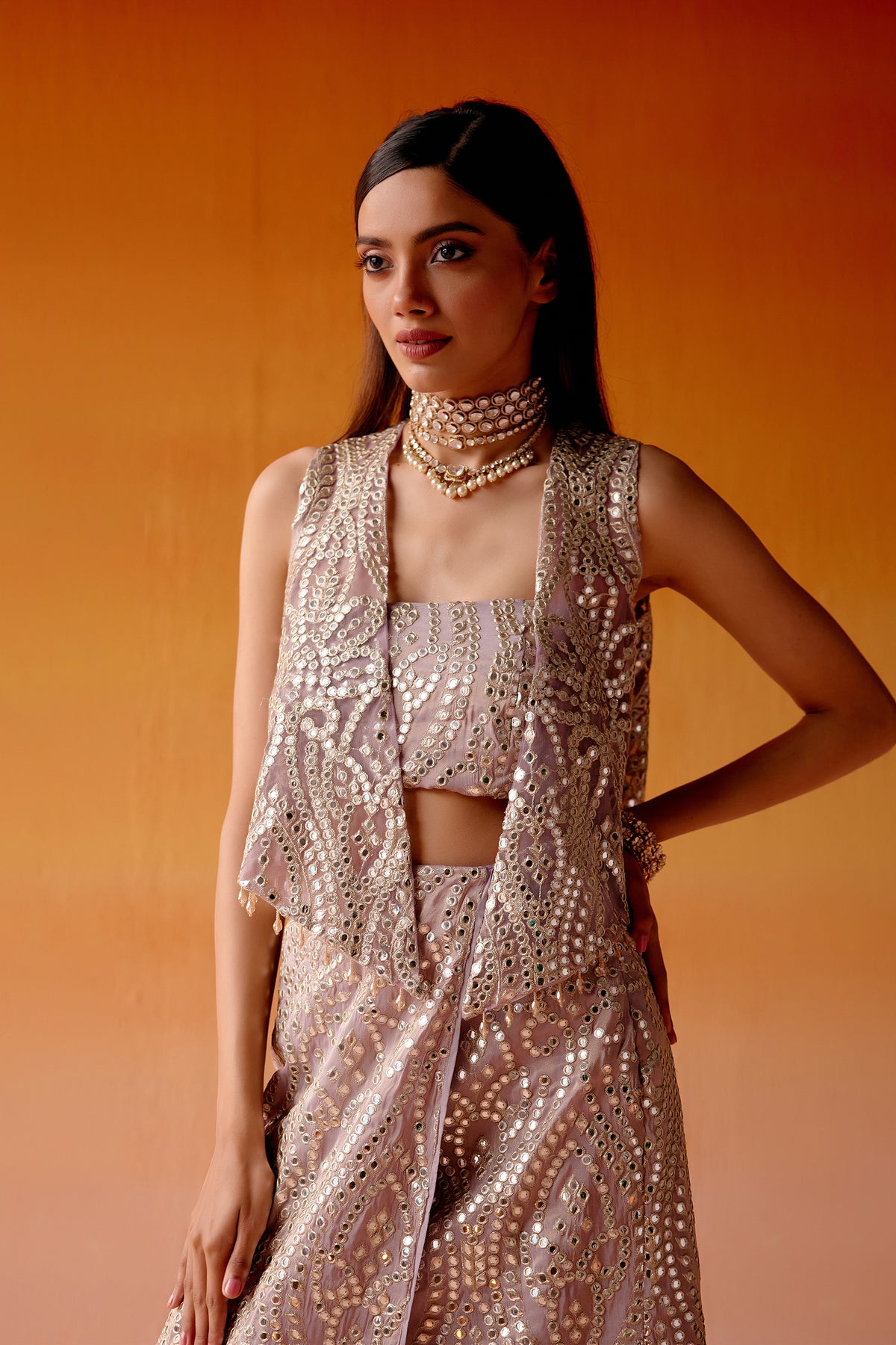 The set consists of 3 mirrorwork pieces - an asymmetrical sleeveless jacket, a bandeau top and an overlapping skirt. All our pieces can be styled separately bringing versatility to your wardrobe.