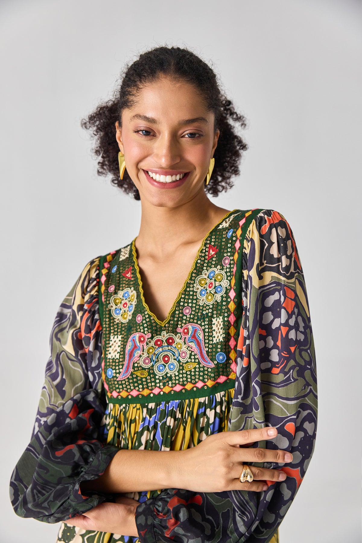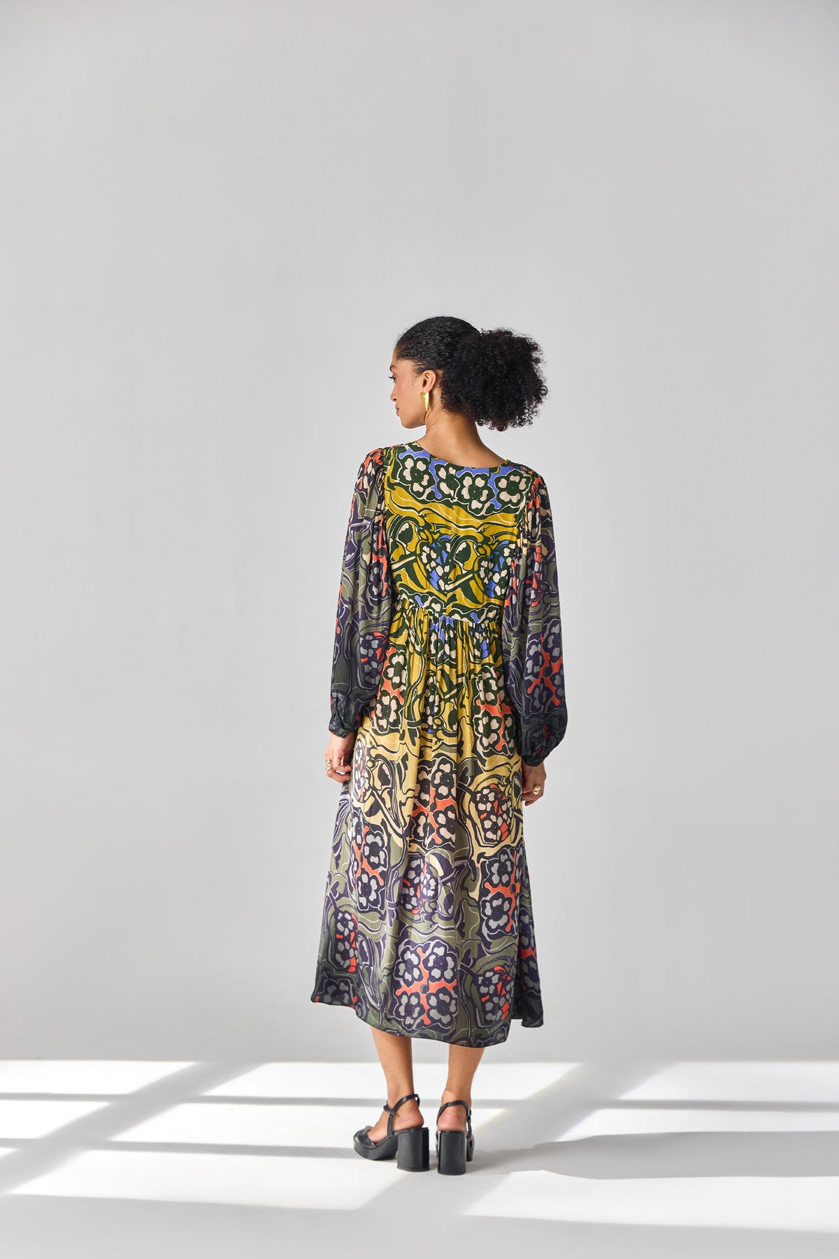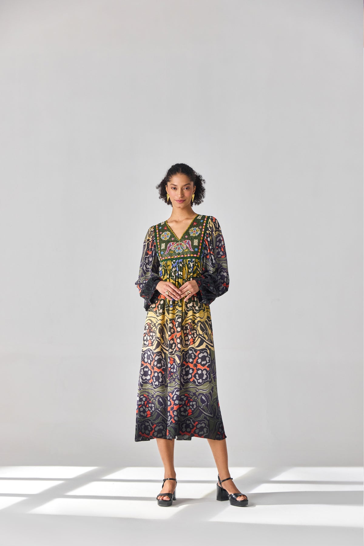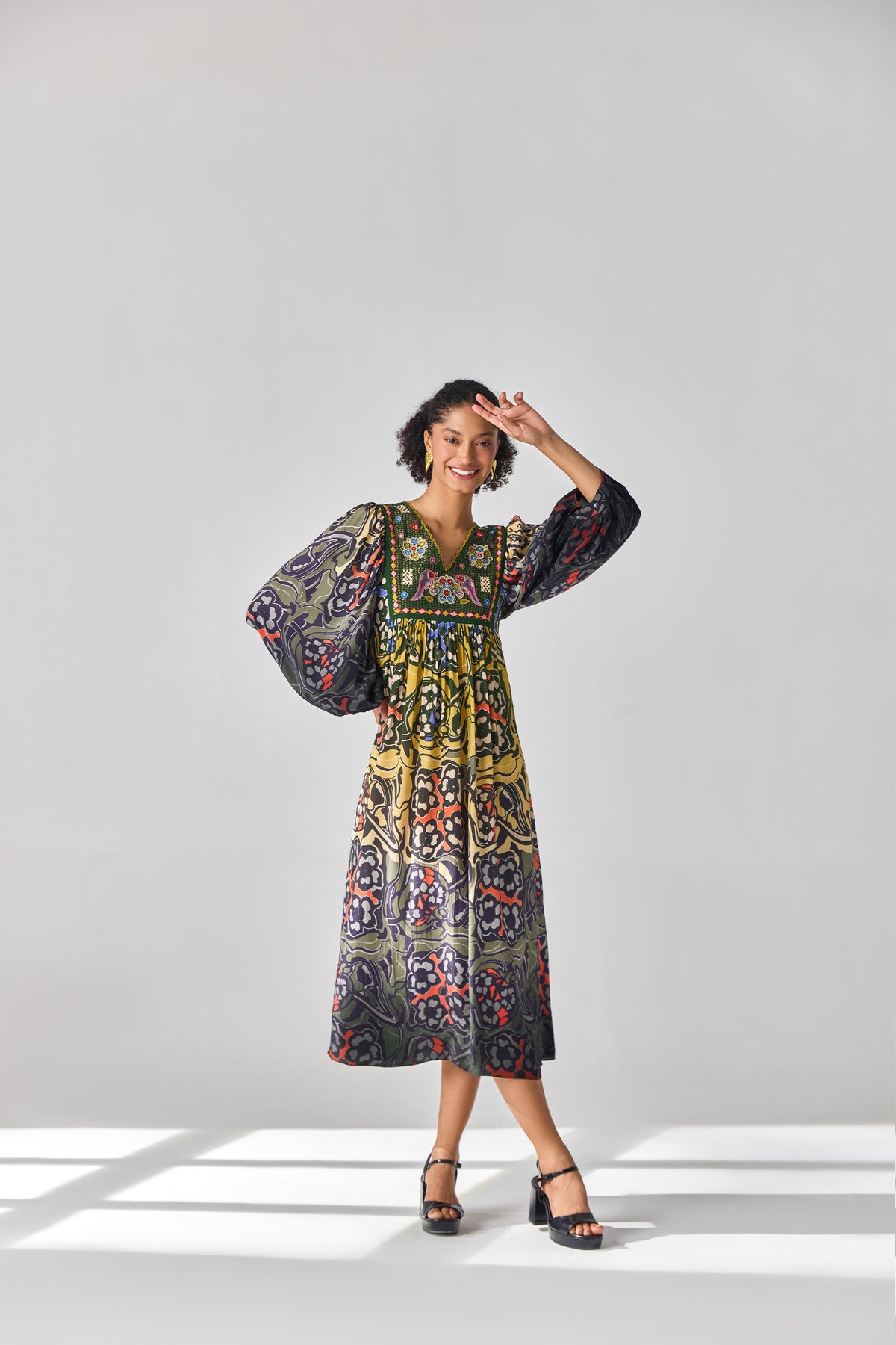 Ombre printed lado dress, thread & sequence detailing in yoke