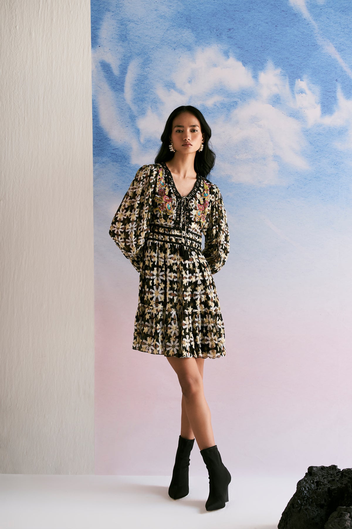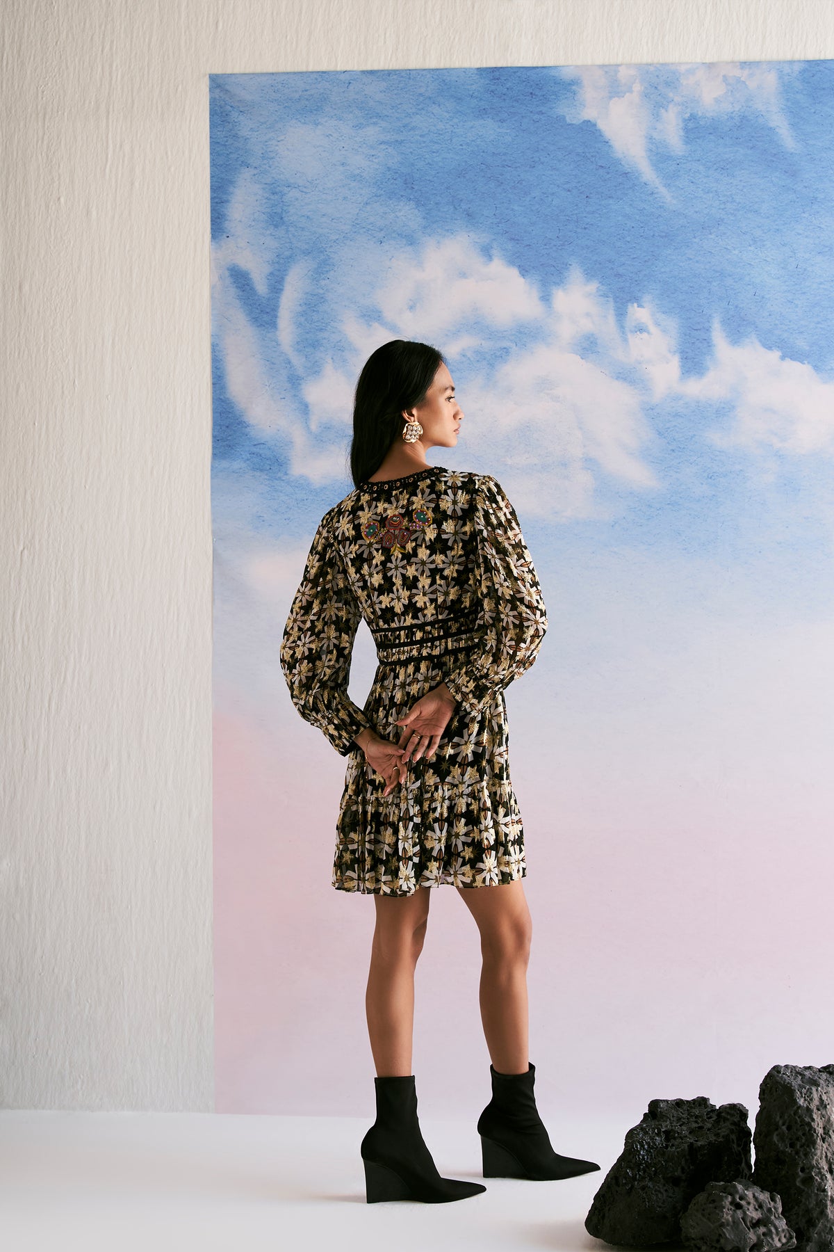 Waisted mini dress with an embroidered beaded yolk in lurex star print
