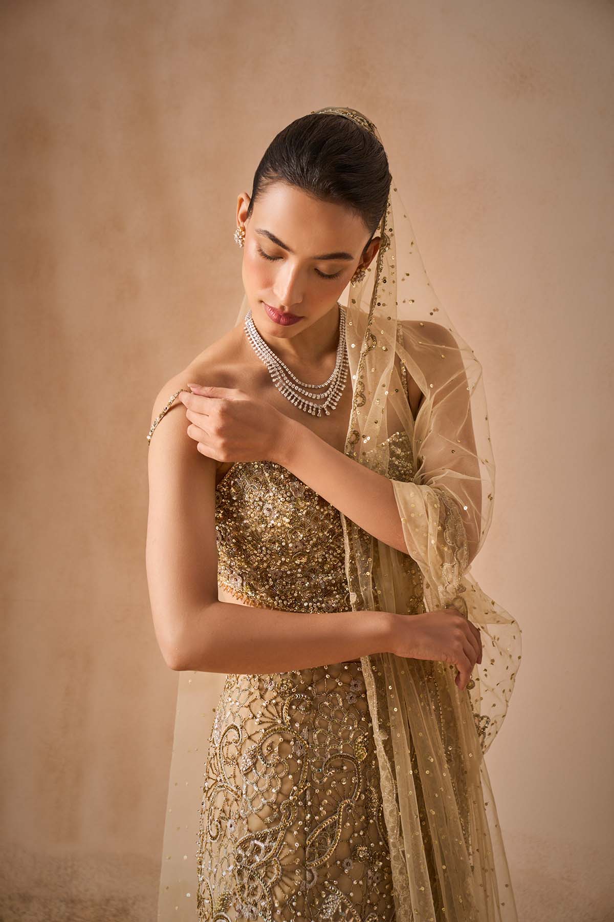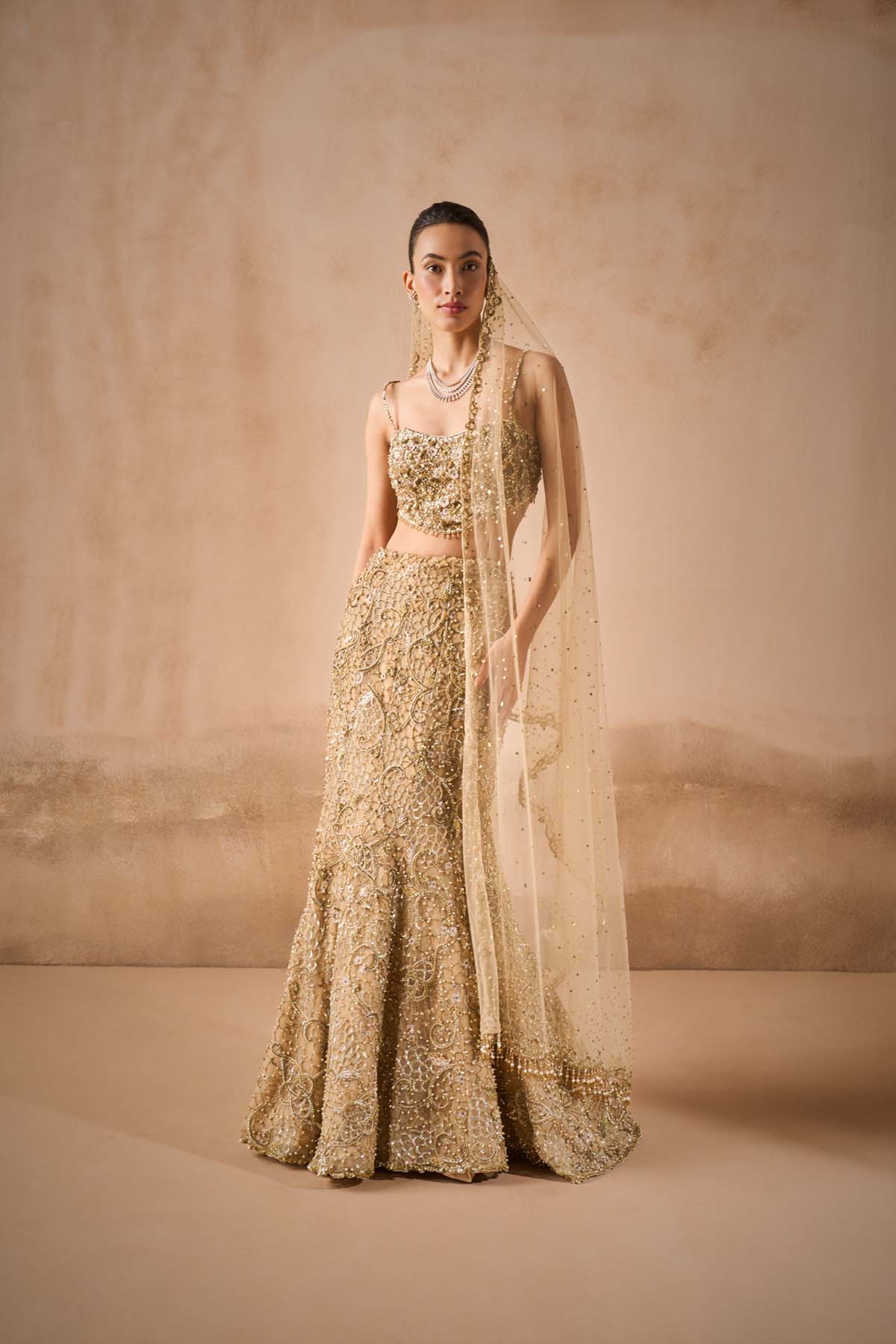 Beige gold fit and flared lehenga set with a strappy blouse and tulle dupatta with sequin,cutdana,pearls and beads