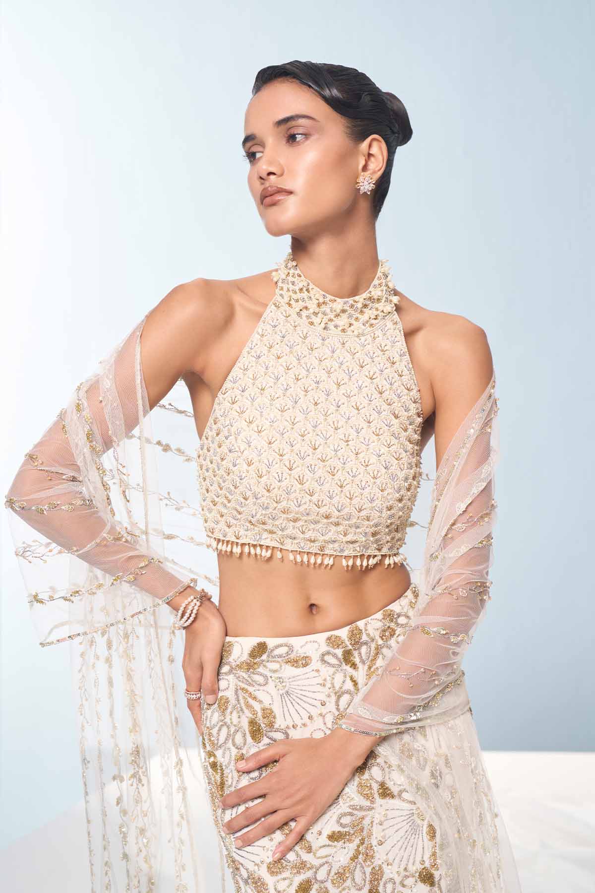 Ivory fit and flare lehenga set with sequin, beads, cutdana, pearl and resham embroidery .The blouse is a high neck incut style, the lehenga has a fit and flare style paired with a tulle stole