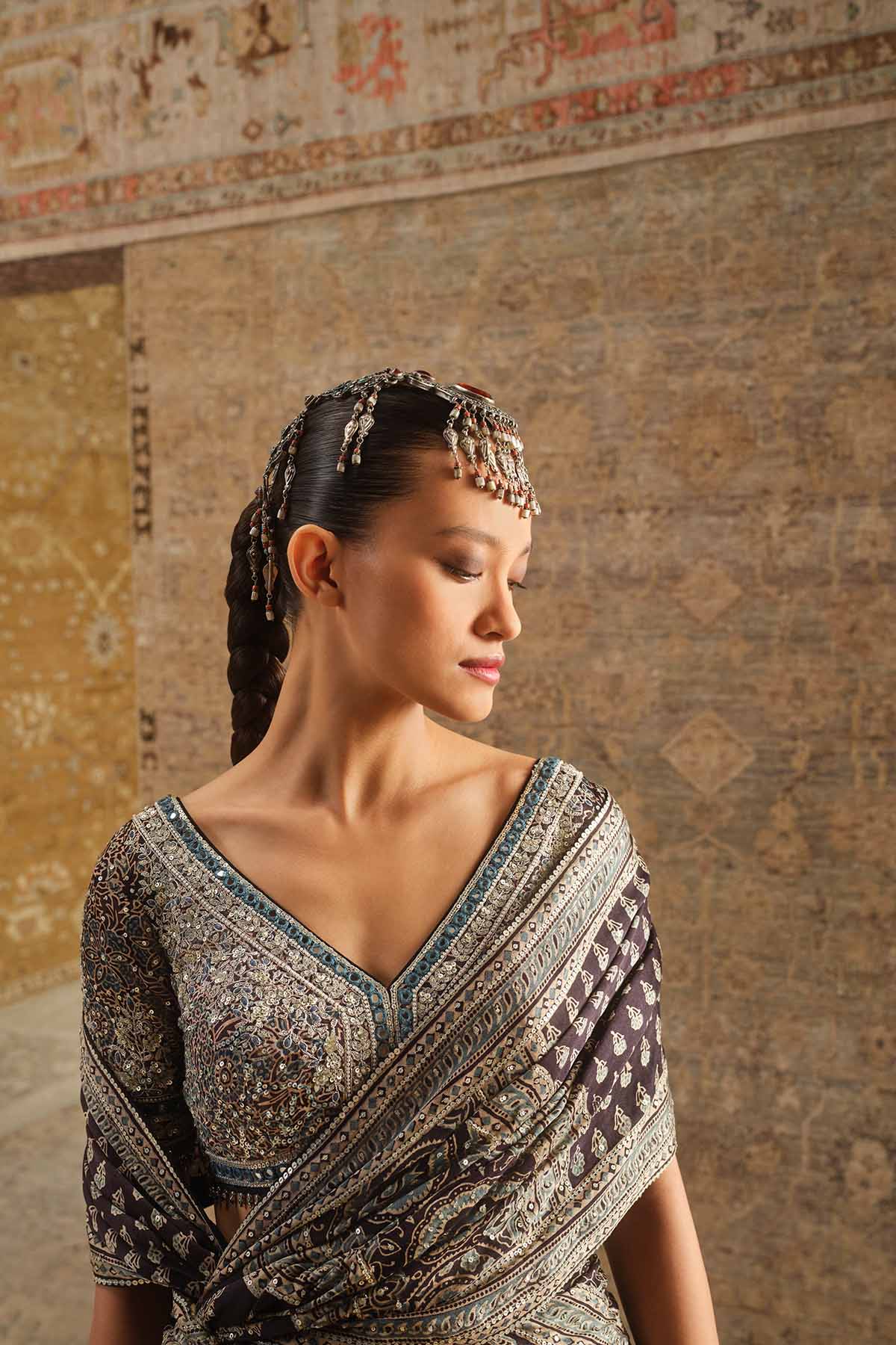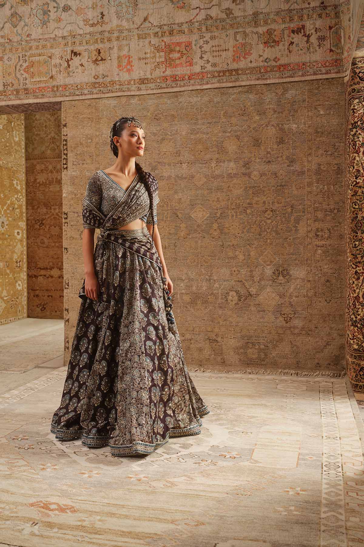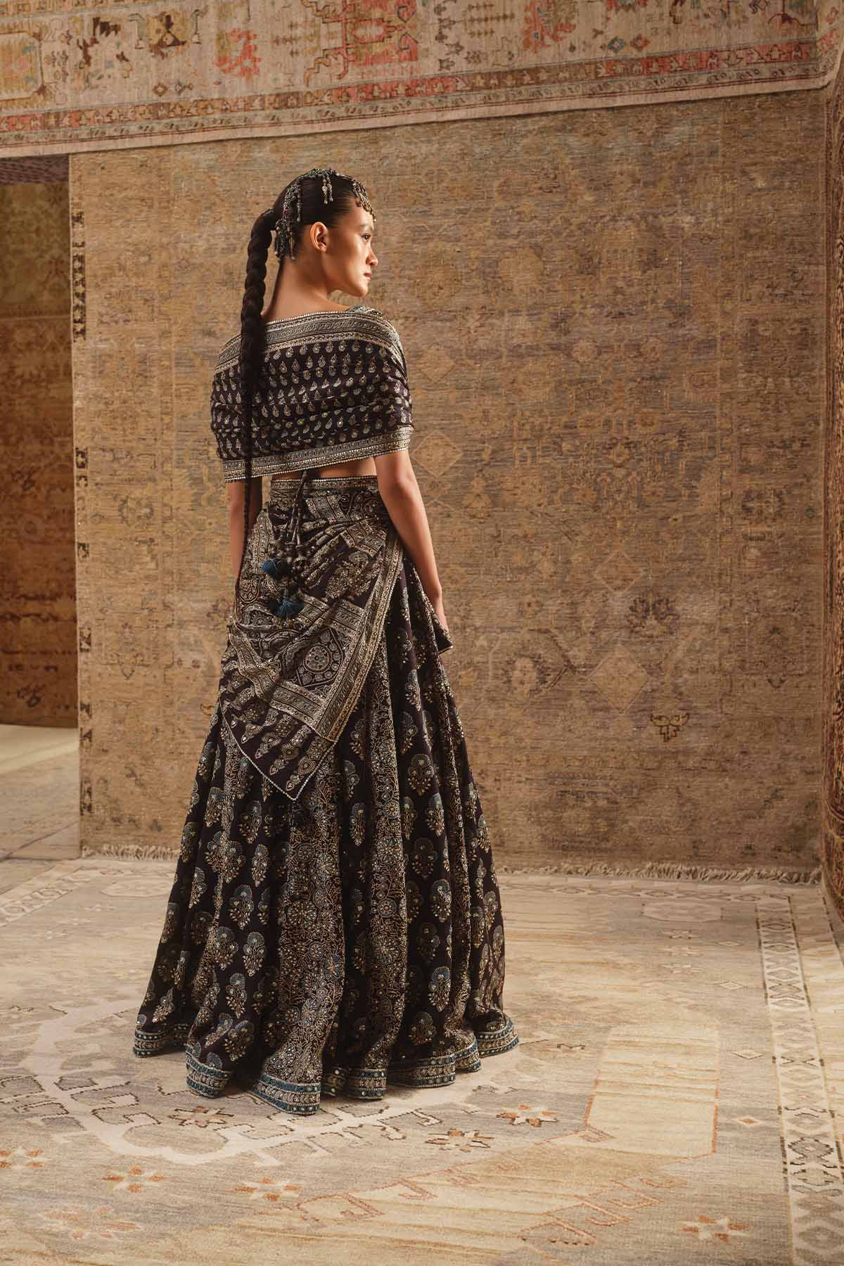 Inspired by history & crafted for the woman of today, our Koyyaro Lehenga Set features hand-block printed Ajrakh. Crafted by the indigenous communities of Gujarat, this craft involves an intensive sixteen-step process of washing, dyeing, printing, and drying. Created using intricate hand-block prints & eco-friendly dyes, it is an ancient craft passed down from generations. Made from silk, this eclectic ensemble is elevated in mirror, threadwork, metallic beads & sequins.