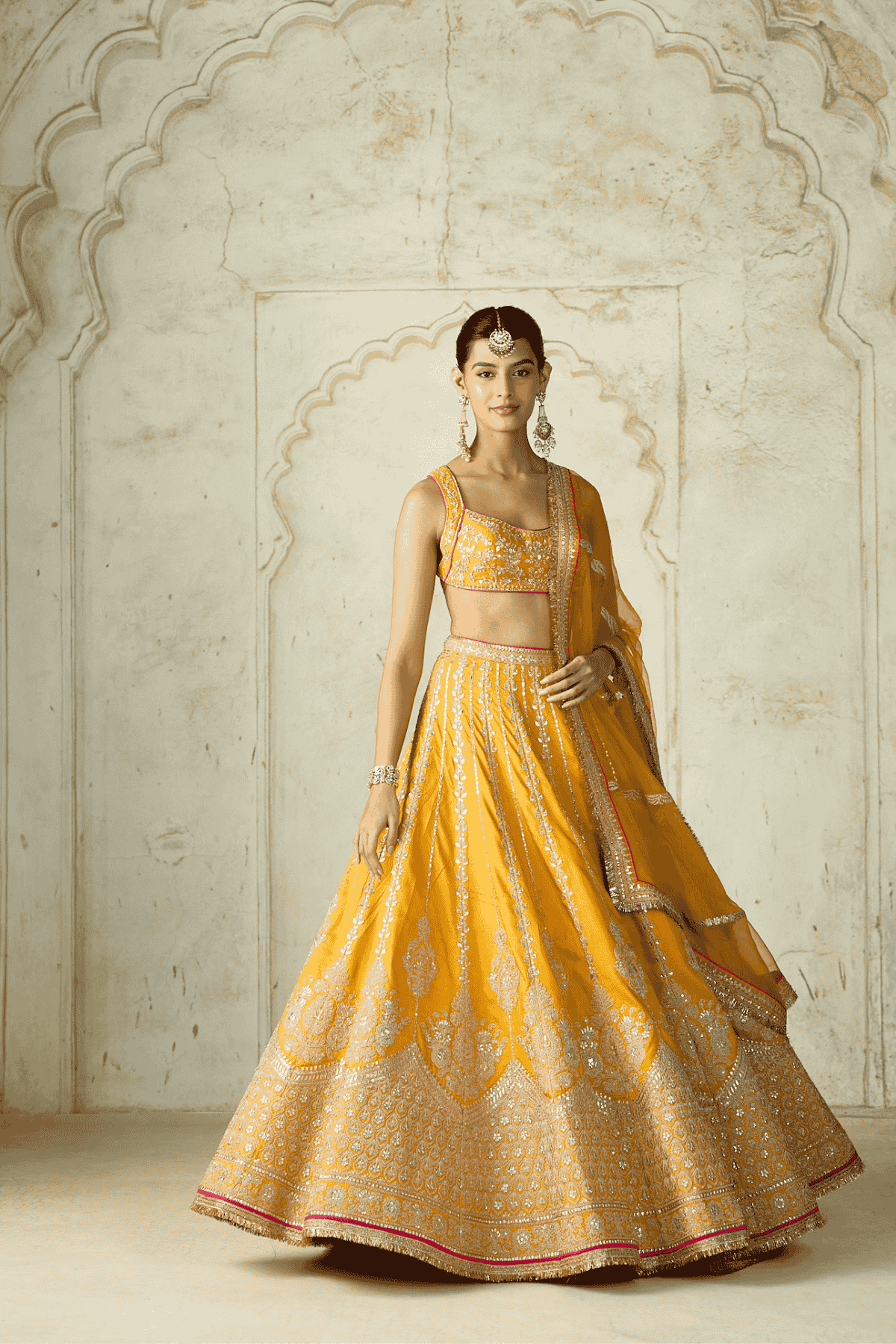 The flared lehenga is beautifully adorned with elaborate motifs, ornate patterns along the hemline, blouse featuring delicate   contemporary sleeveless design. A sheer matching dupatta with embroidered borders and delicate detailing completes the ensemble.