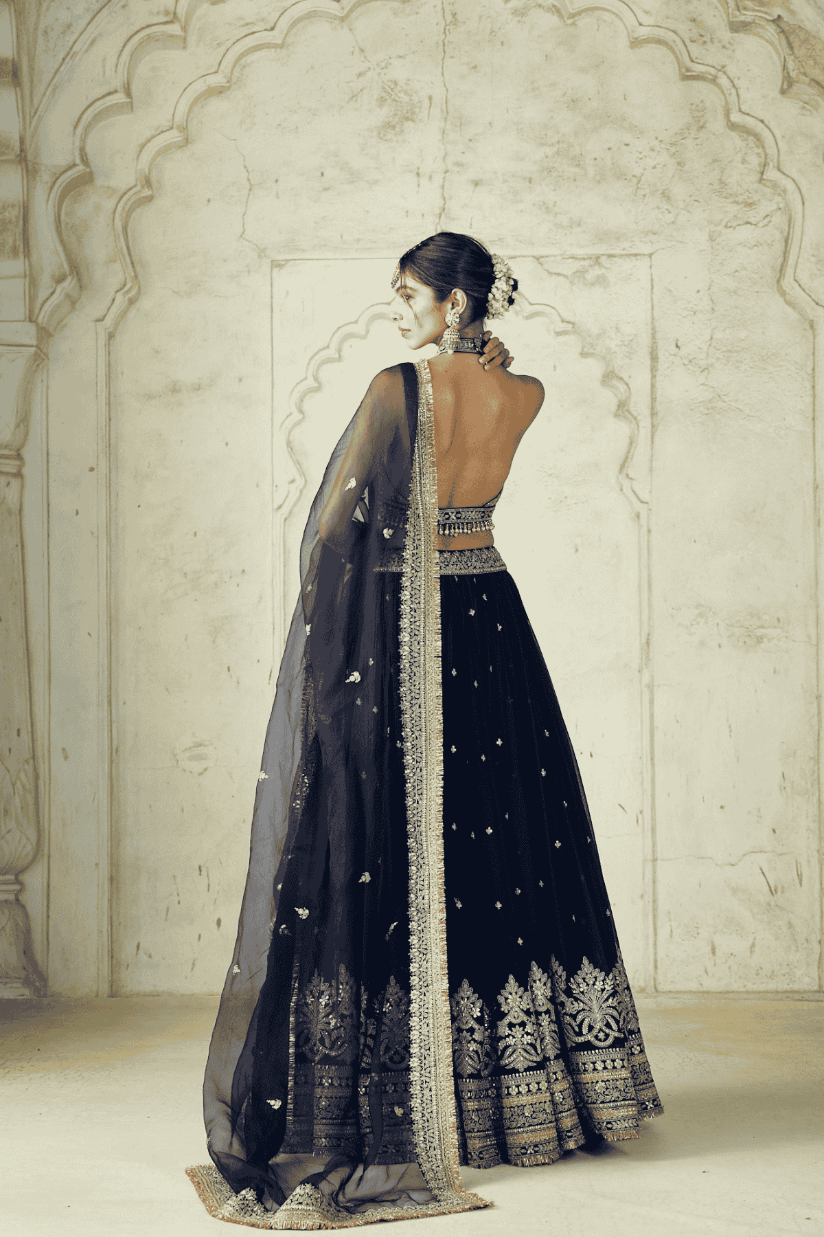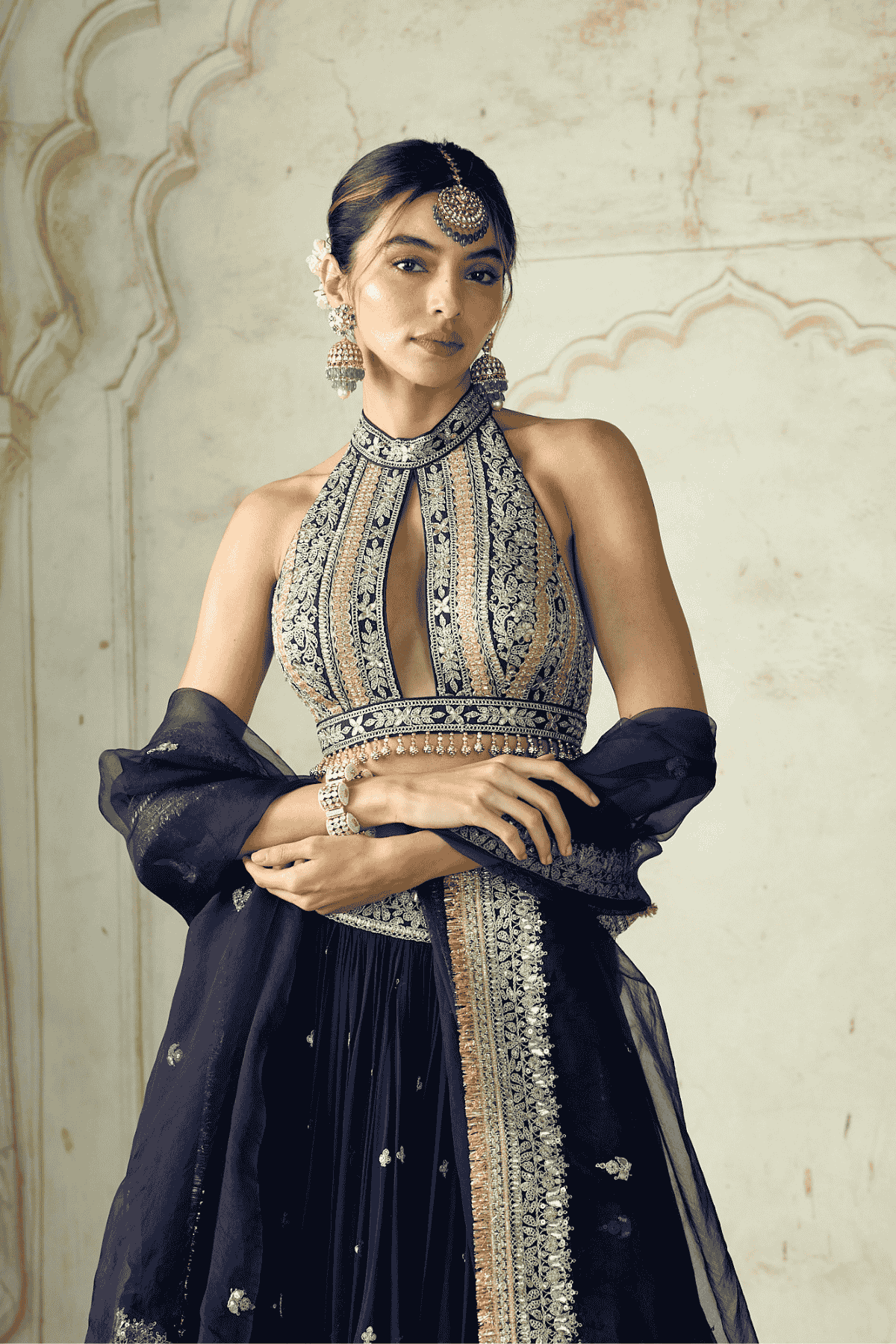 The ensemble features a heavily embroidered halter-neck blouse adorned with intricate work, giving it a contemporary edge. The voluminous lehenga is richly embellished with ornate motifs and a detailed embroidered border, adding grandeur to the look. Paired with a sheer matching dupatta.