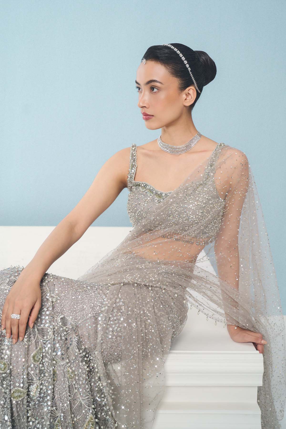 Silver grey tulle drape lehenga set with an attached drape dupatta and sleeveless blouse .The embroidery used in this lovely set has sequin, beads, cutdana, pearls, resham and stone