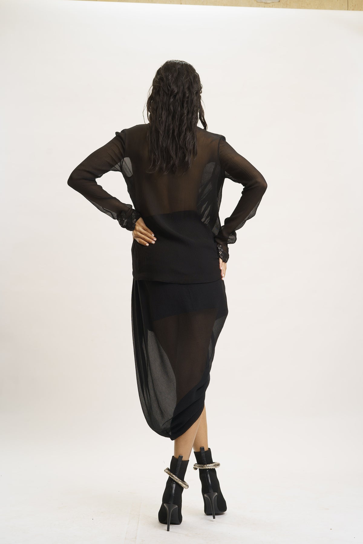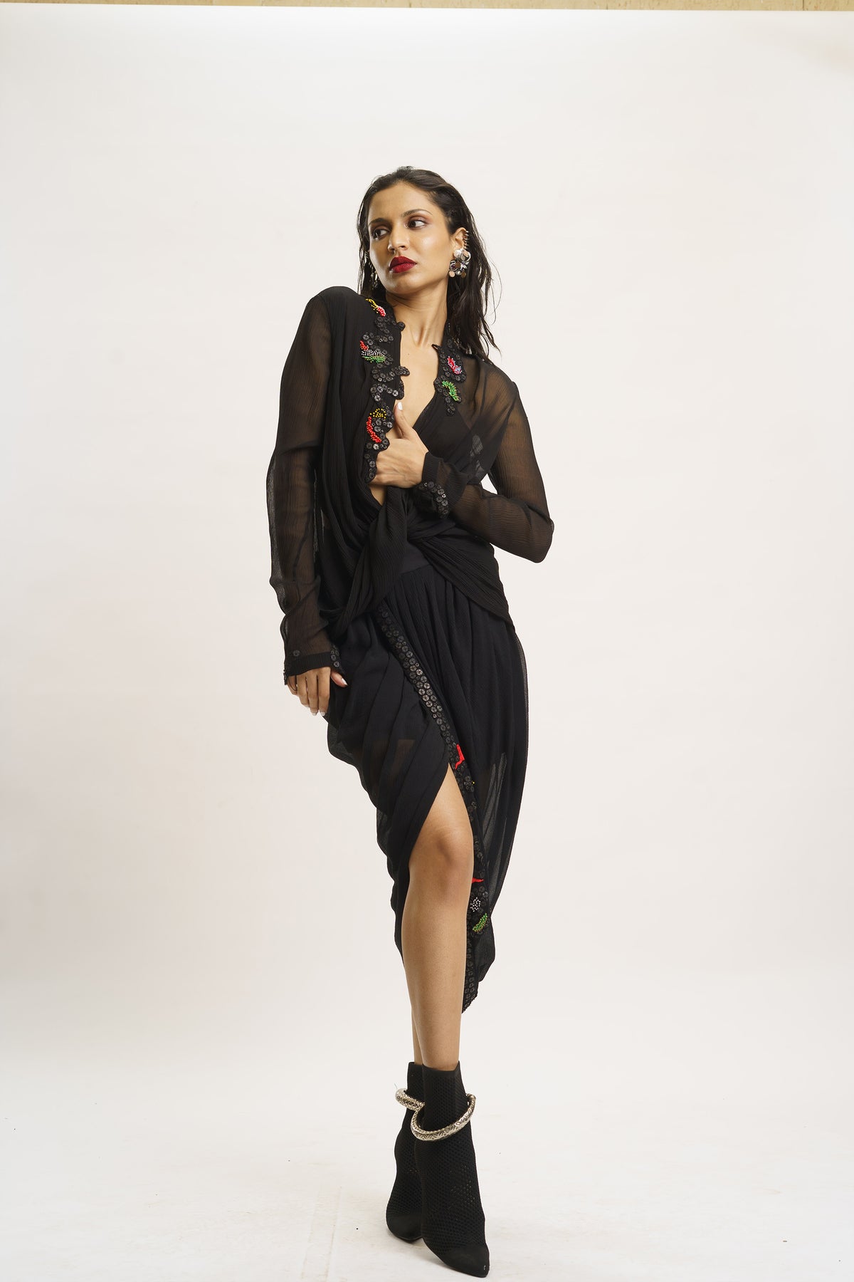 The draped detail sets this blazer apart from traditional tailored jacket,adding a unique and sophisticated twist to the outfit.The softness of the draped fabric contrast with the edginess of the embroidery detail resulting in a viasually dynamic and statement making piece of wearable art.