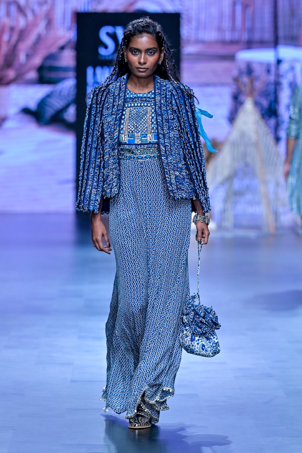 Blue geometric print yoke style jumpsuit with textured noor jacket