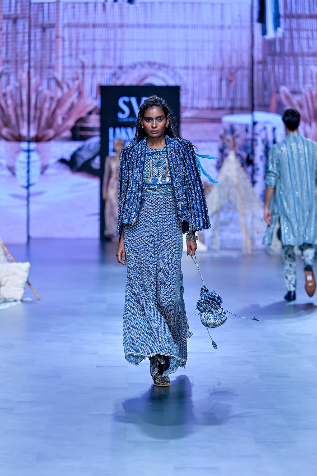 SVA Blue Geometric Print Yoke Style Jumpsuit Indian designer wear online shopping melange singapore
