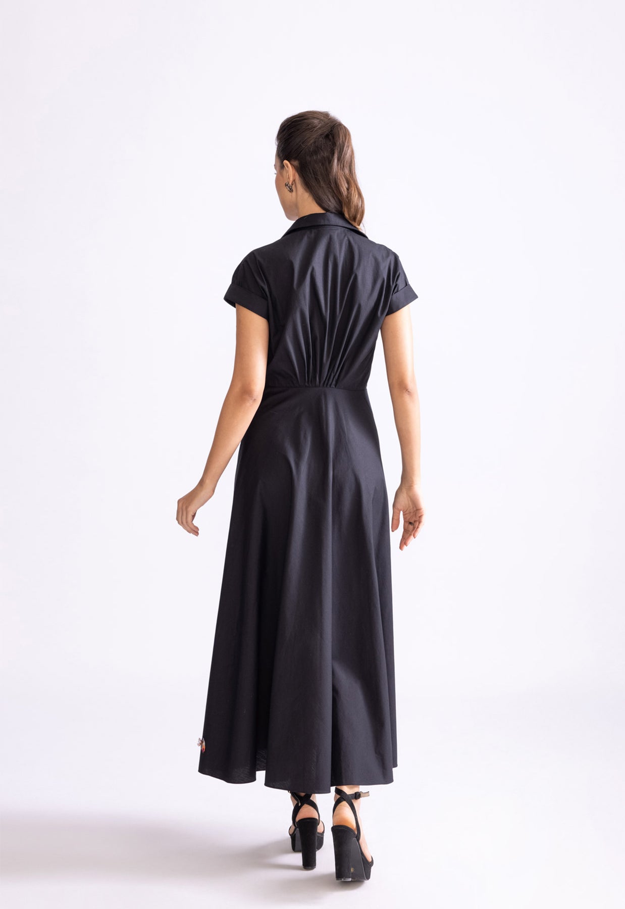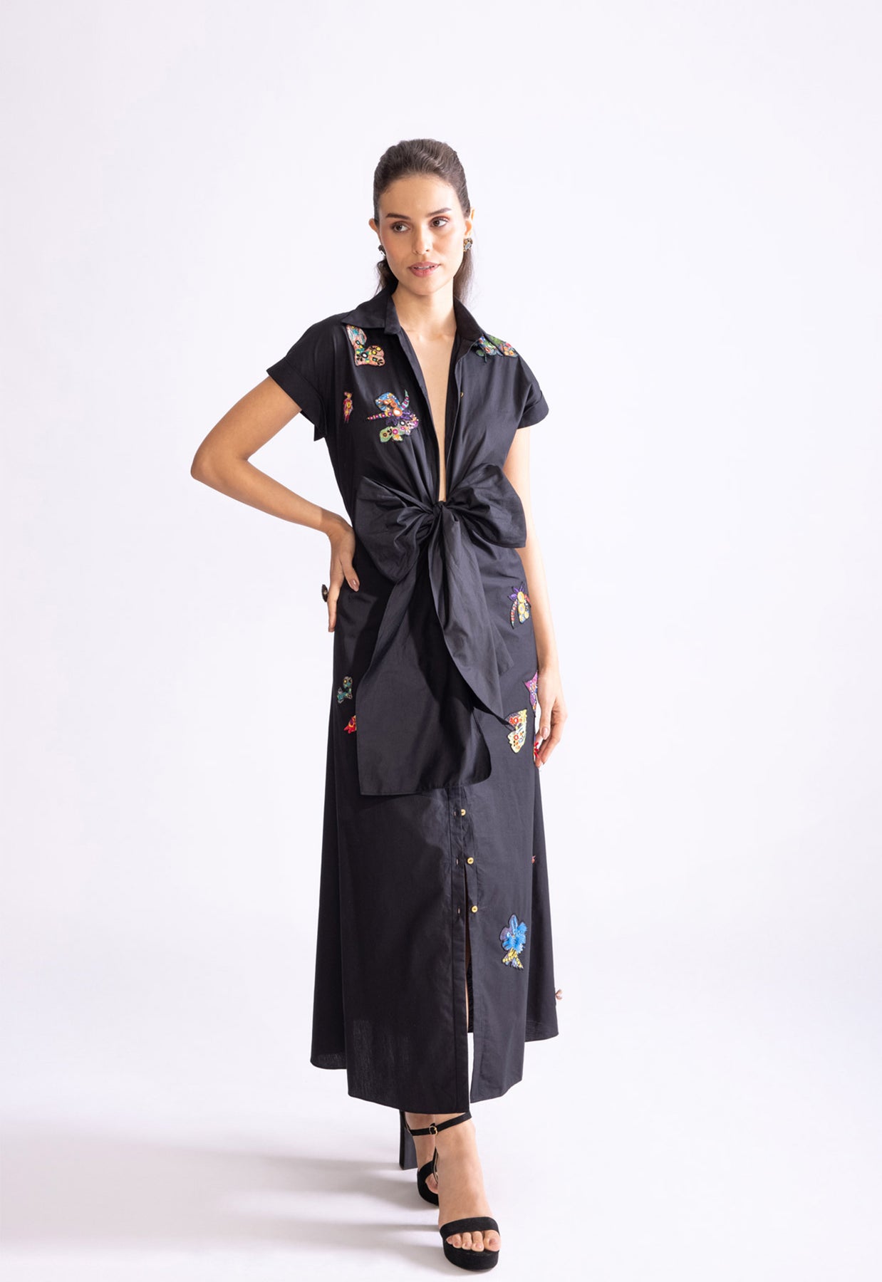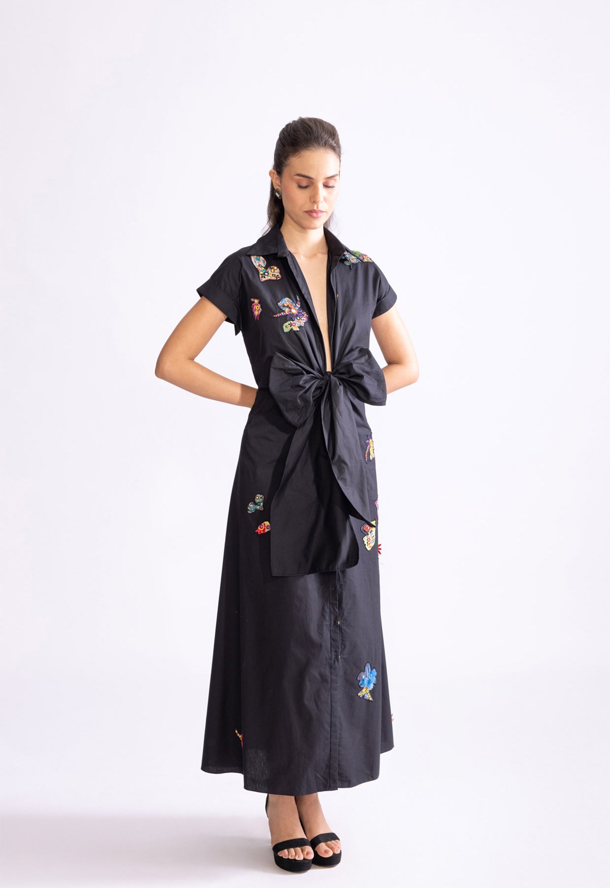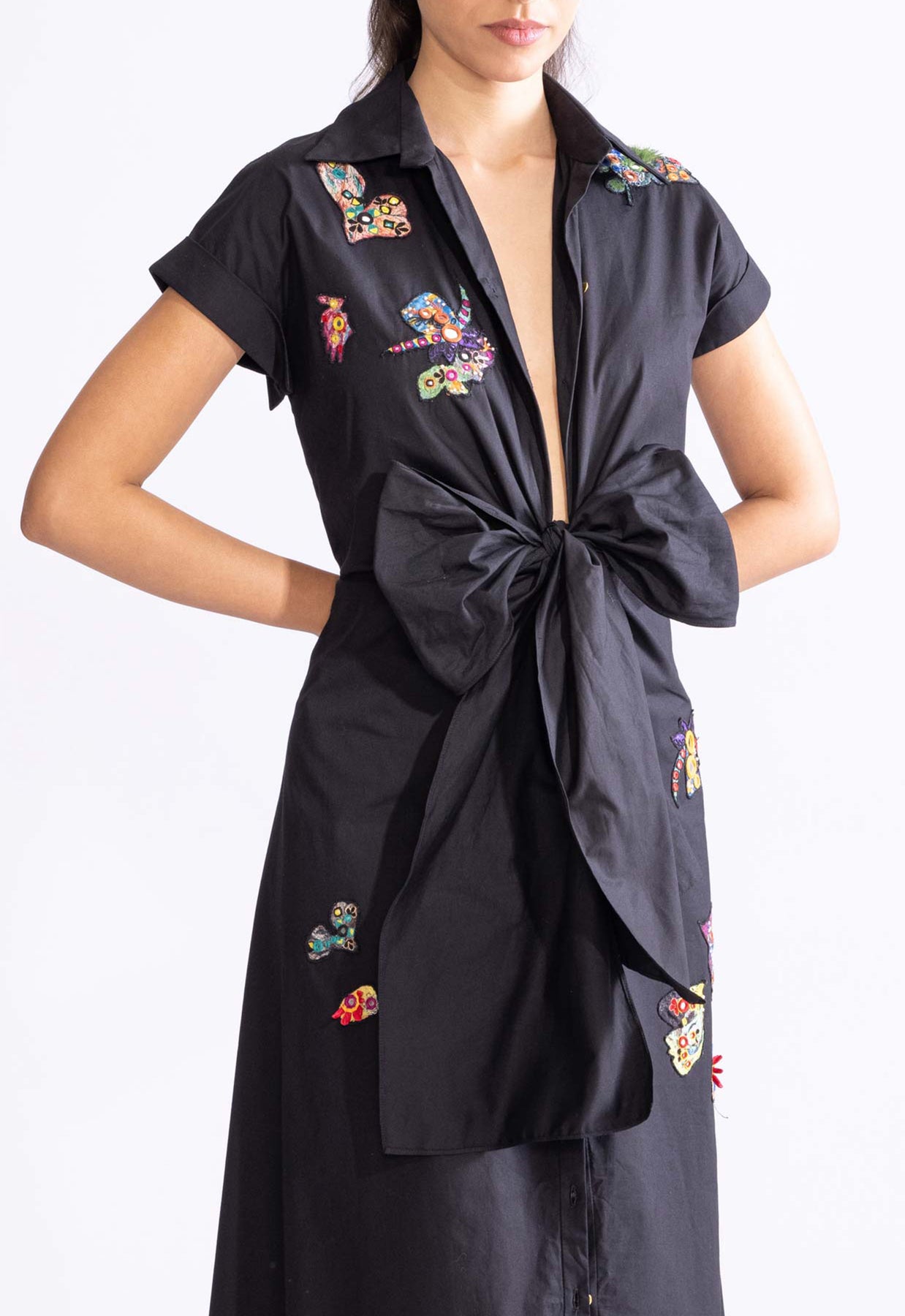 Collared shirt dress with intricate mirror and thread work hand embroidered scattered motifs, exaggerated bow detailing and deep neckline