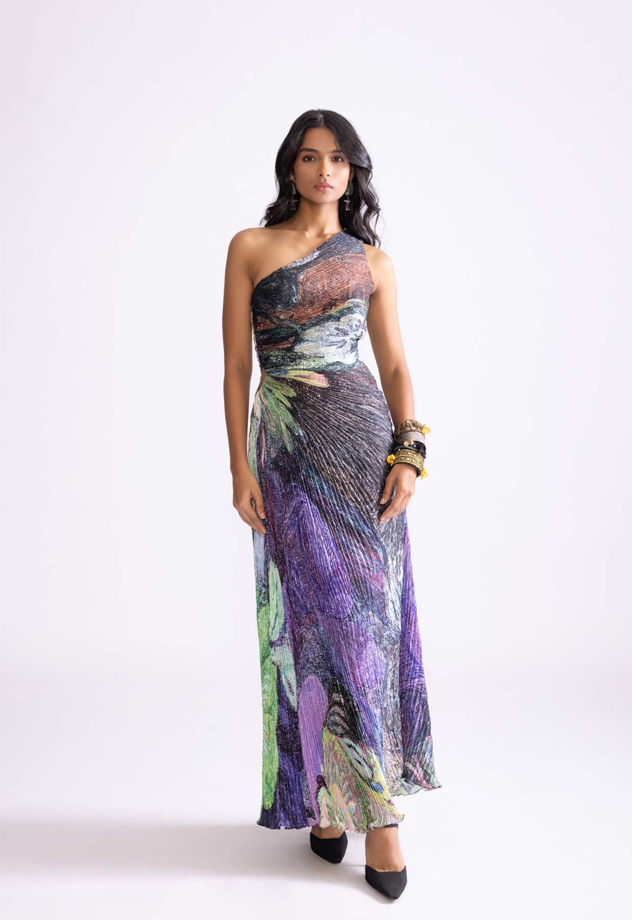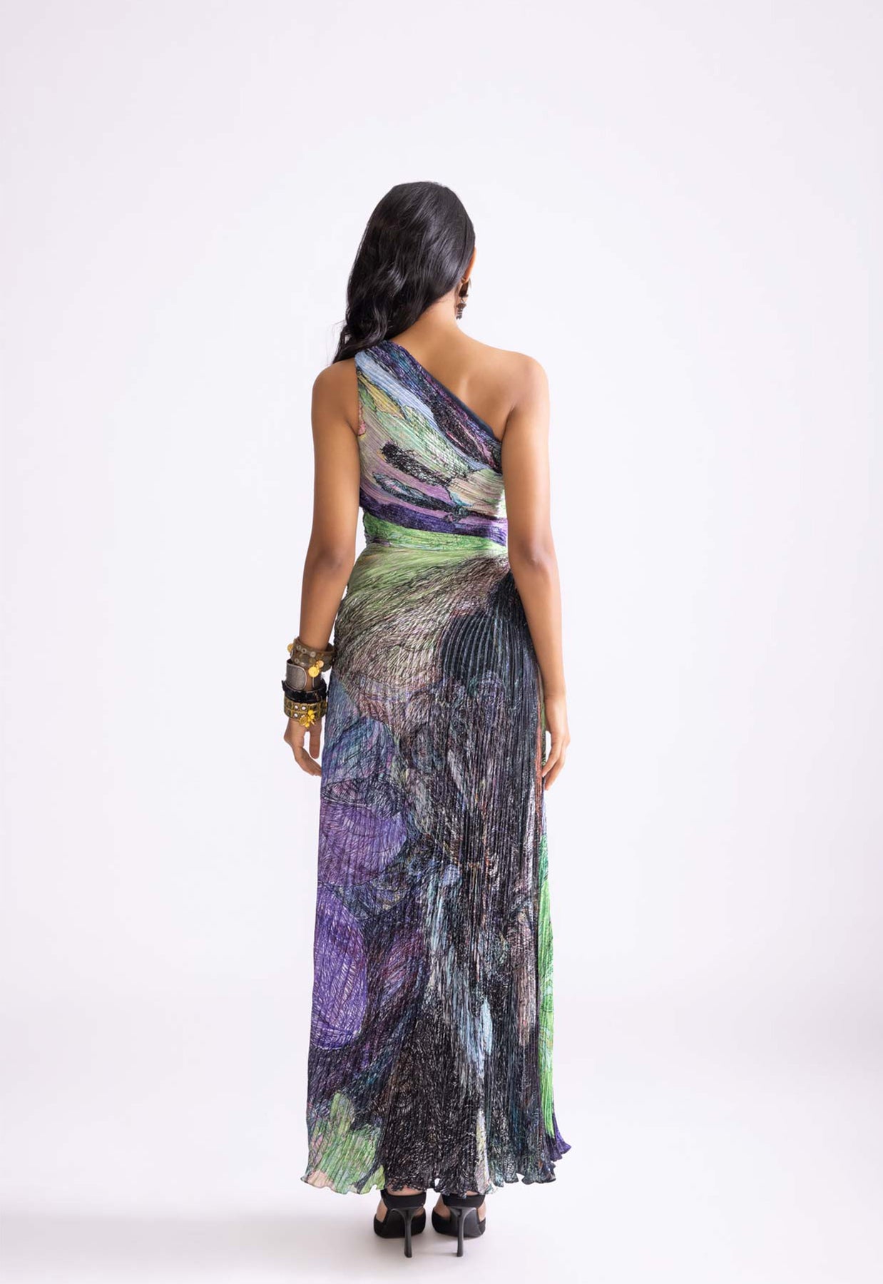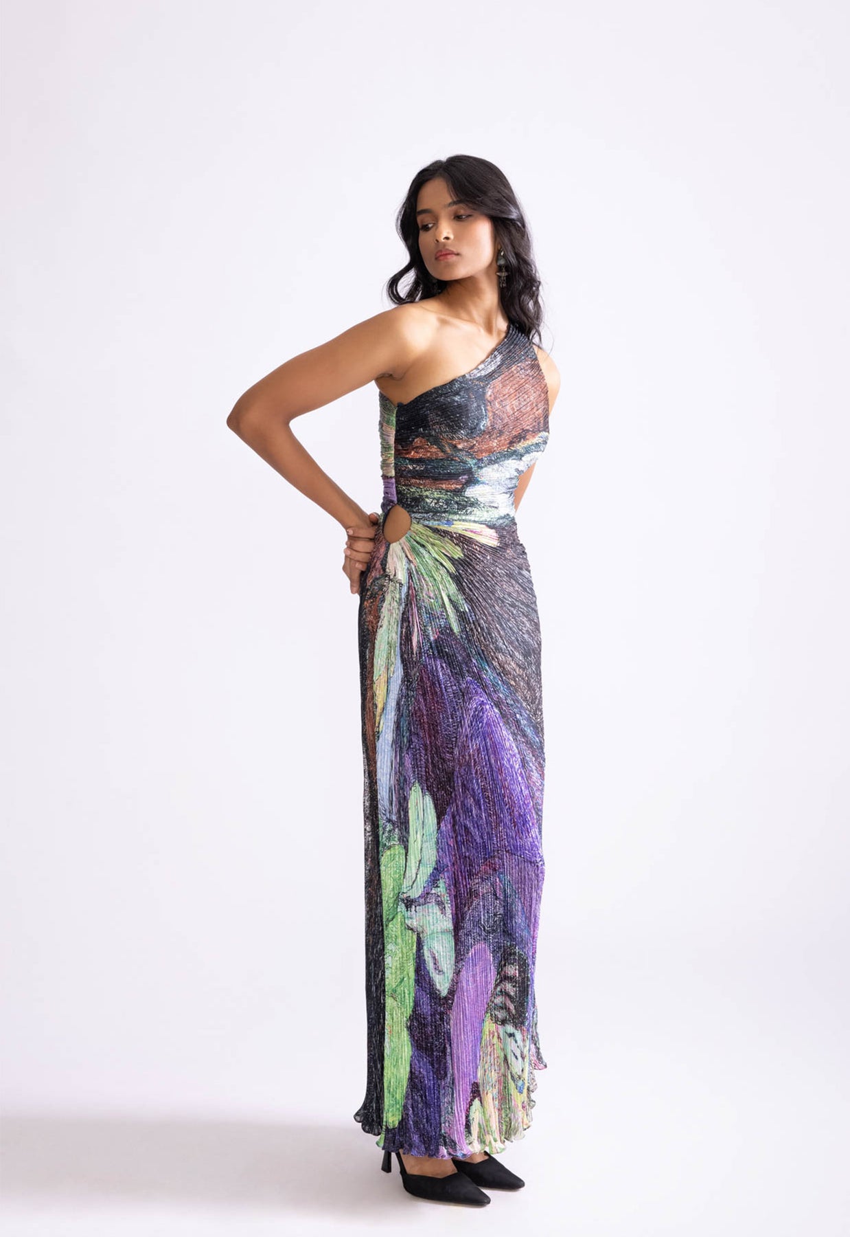 Daisy print one shoulder hand micro pleat maxi dress with side keyhole detailing