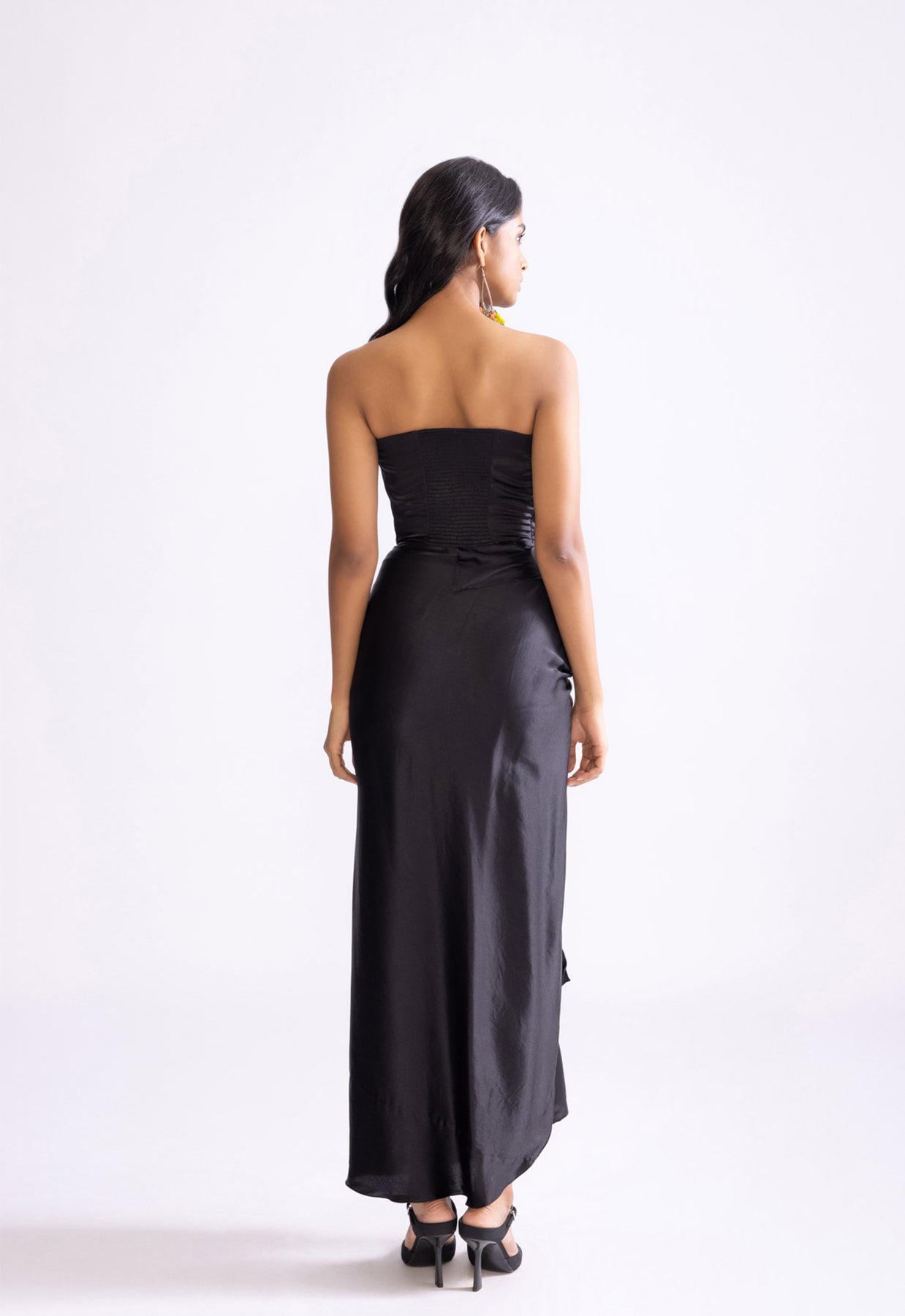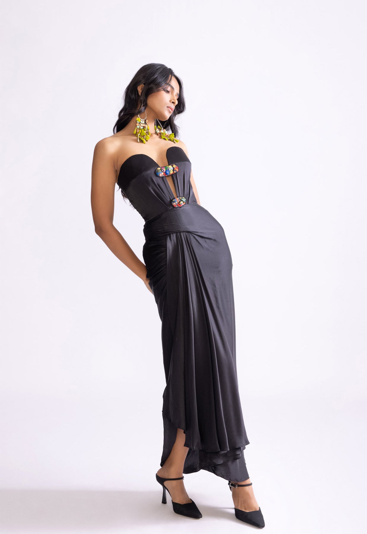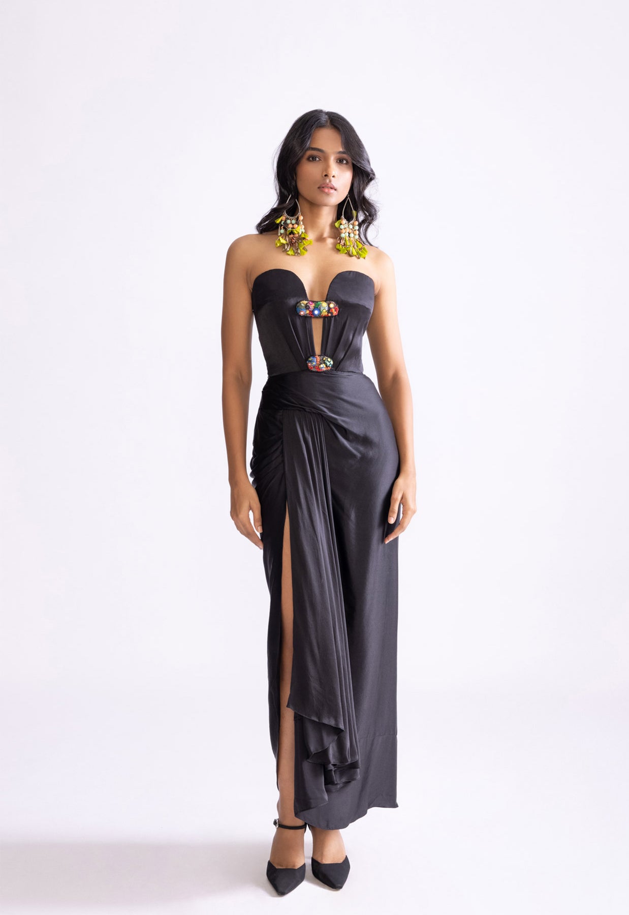 Strapless gown with pleated, side slit drape, keyhole detailing and intricate mirror and thread hand embroidered panels
