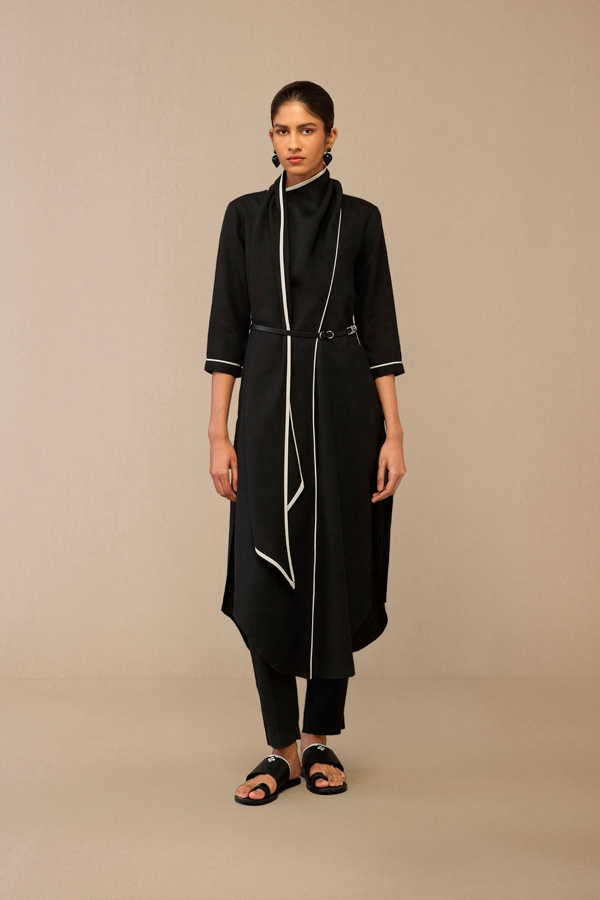 The dilawar tunic set is simplicity at its finest — black linen that feels as soft as it looks. The straight sleeves and gently curved hem give the tunic a clean, crisp silhouette. The soft drape around the neck creates a graceful faux scarf effect, while the ivory piping at the edges adds a quiet contrast. Complete with straight-cut pants and a black faux leather belt with silver hoops, the set is perfect for those days when you want to look polished but still feel at ease