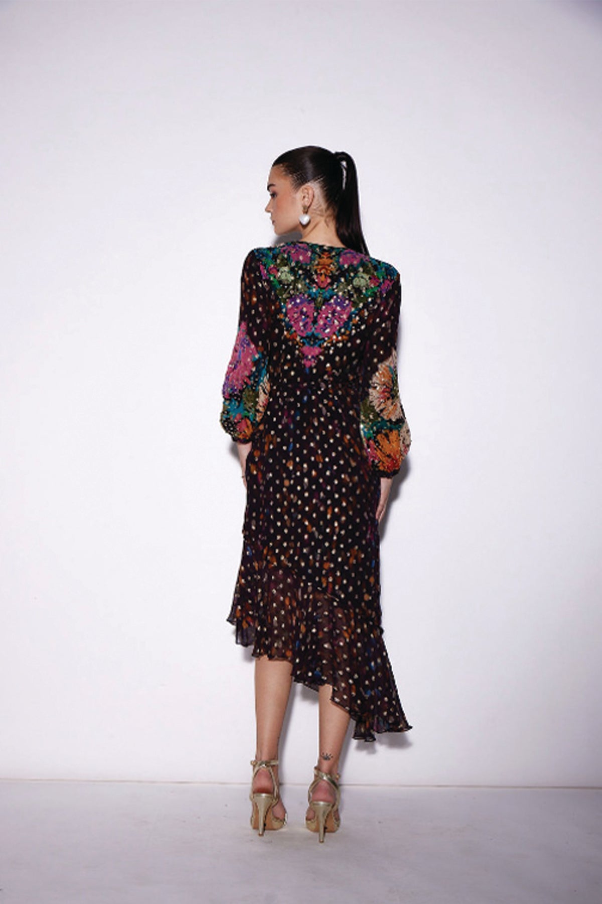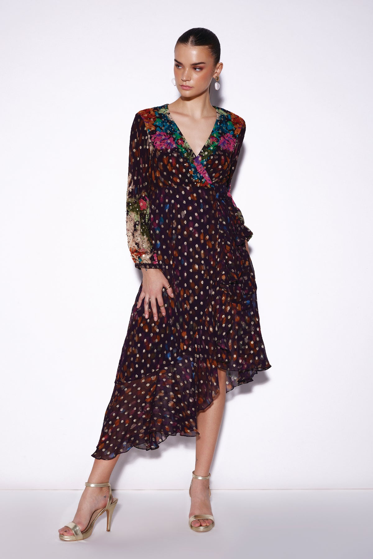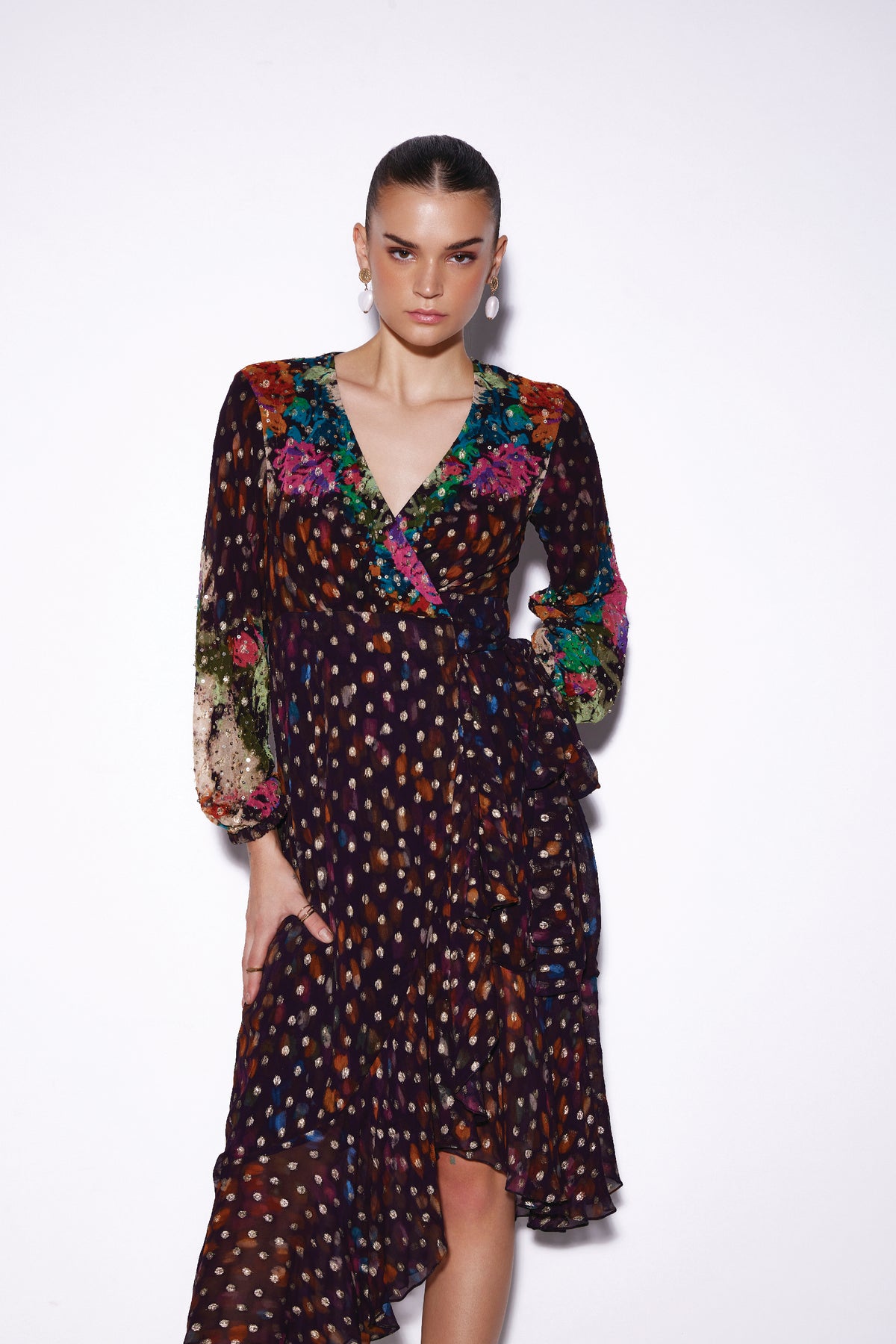 Sequenced embroidered wrap dress ,lurex printed georgette