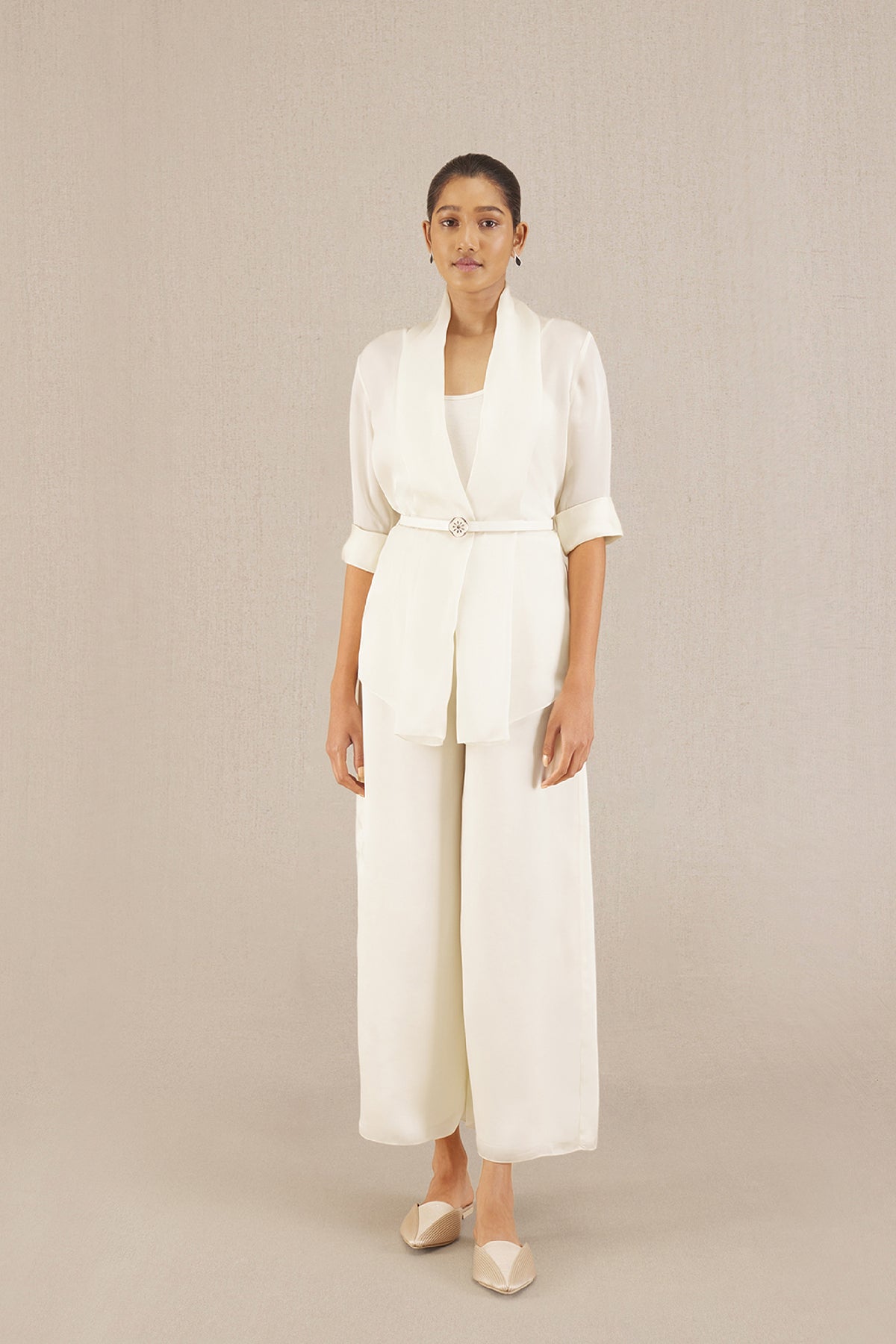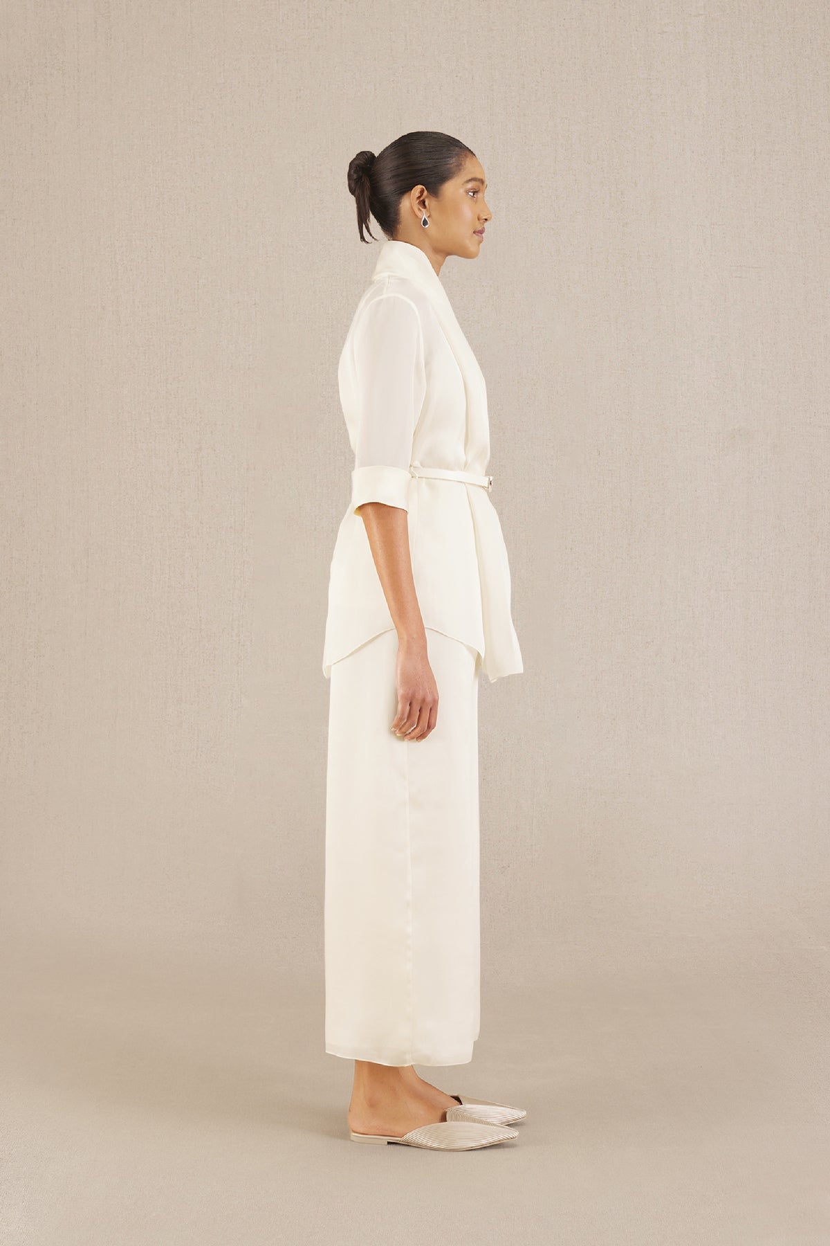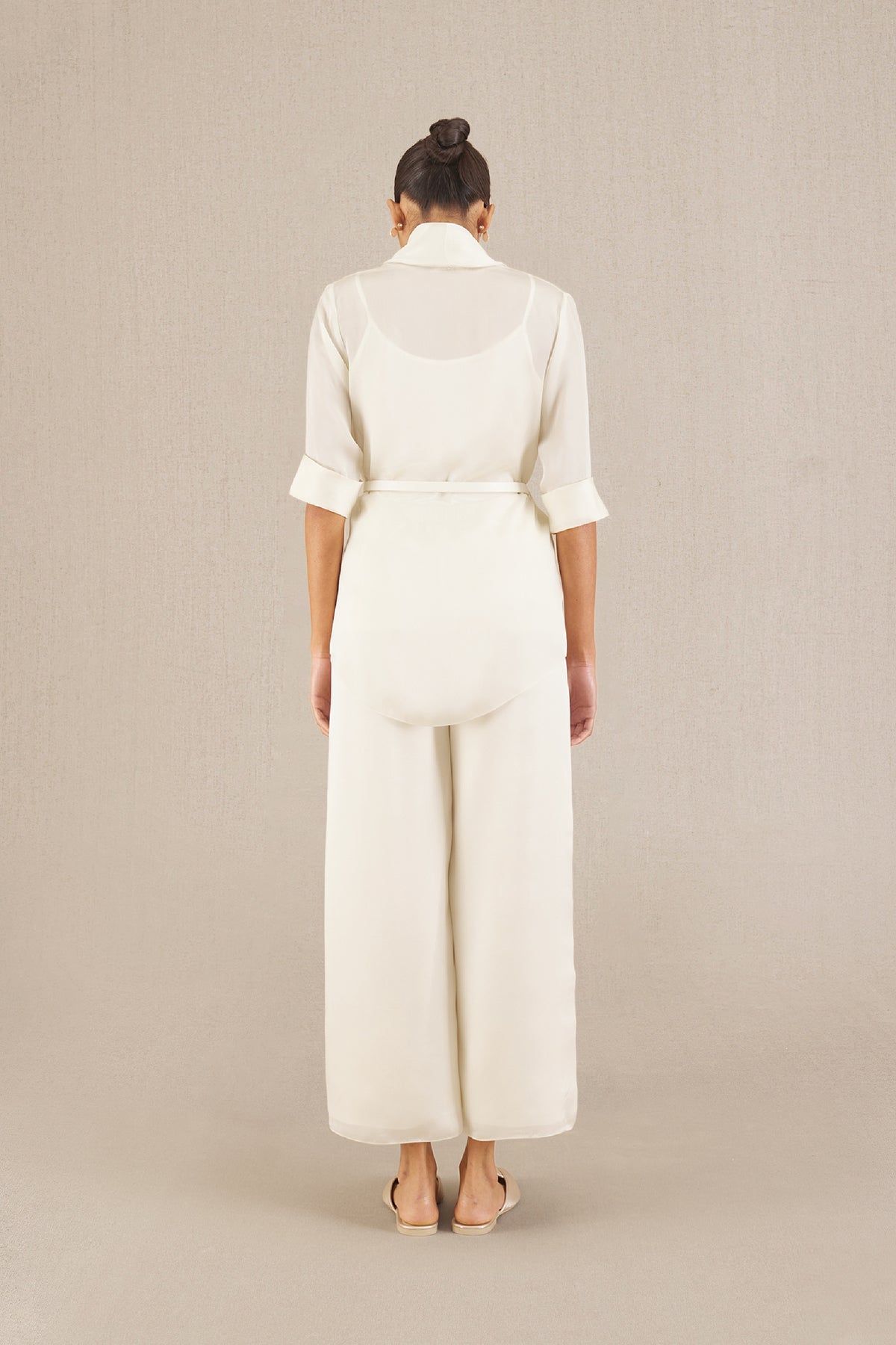 Ivory in satin organza, belted with an enamel buckle; and a breezy silhouette for the summer. Mana is your perfect companion to a friday night out. Inner, palazzo and belt come with.