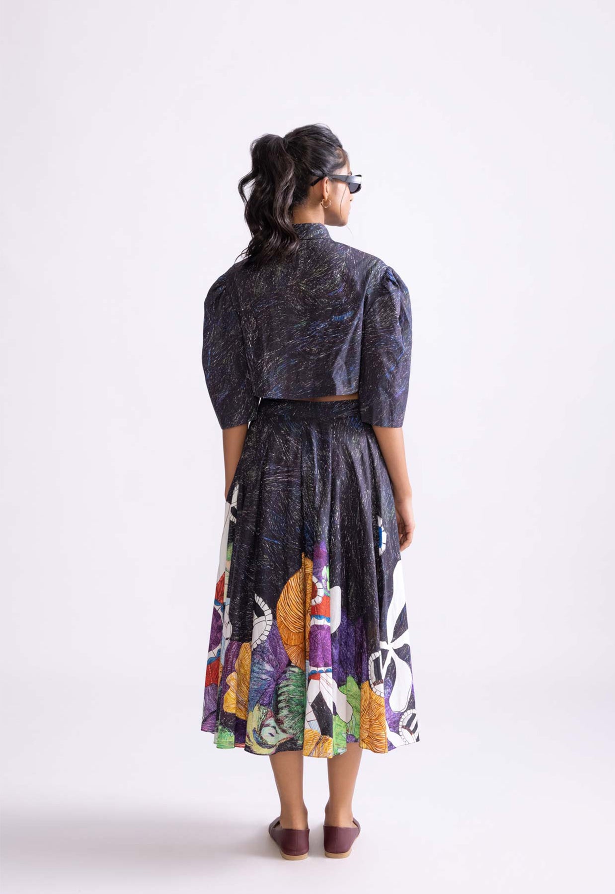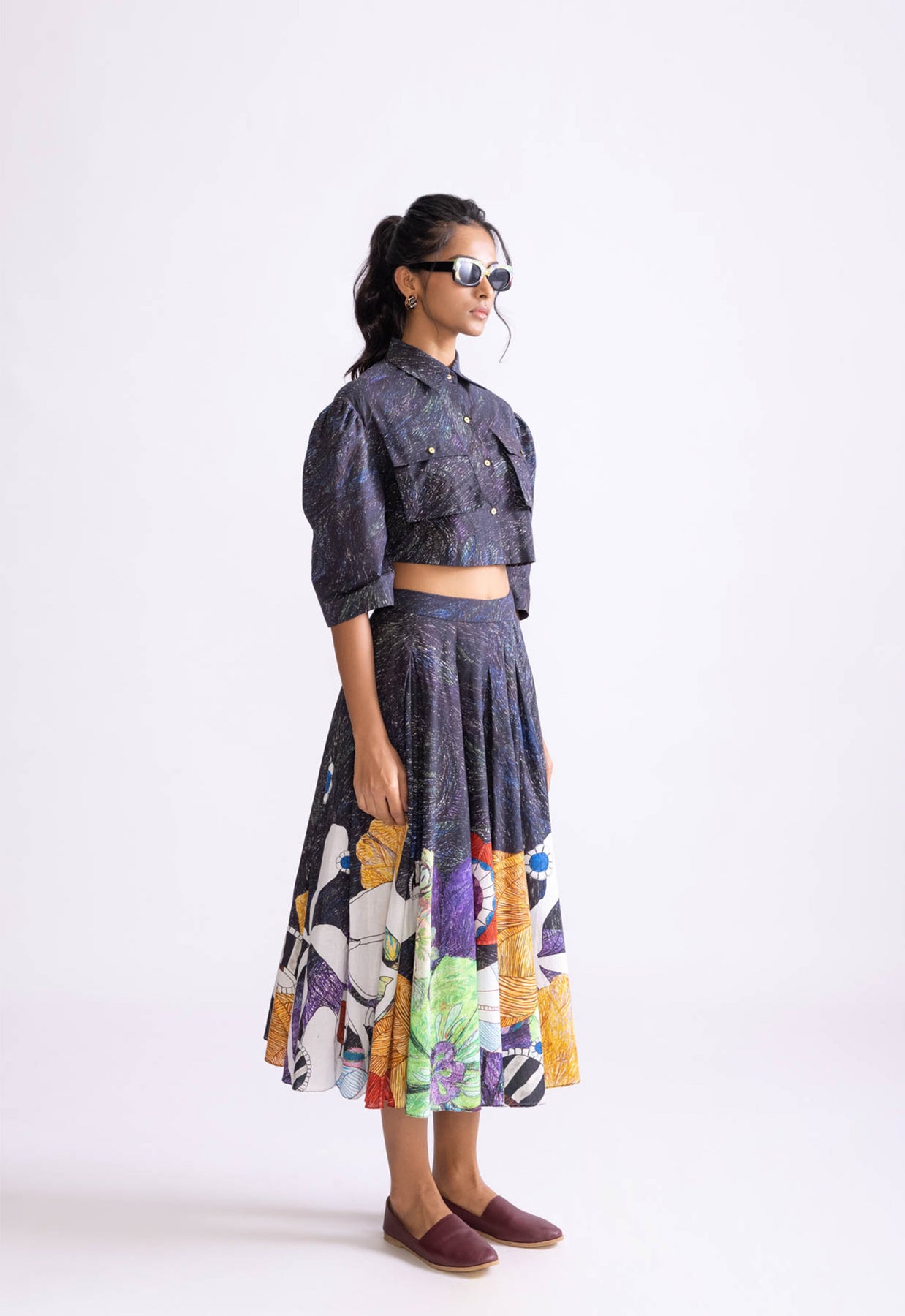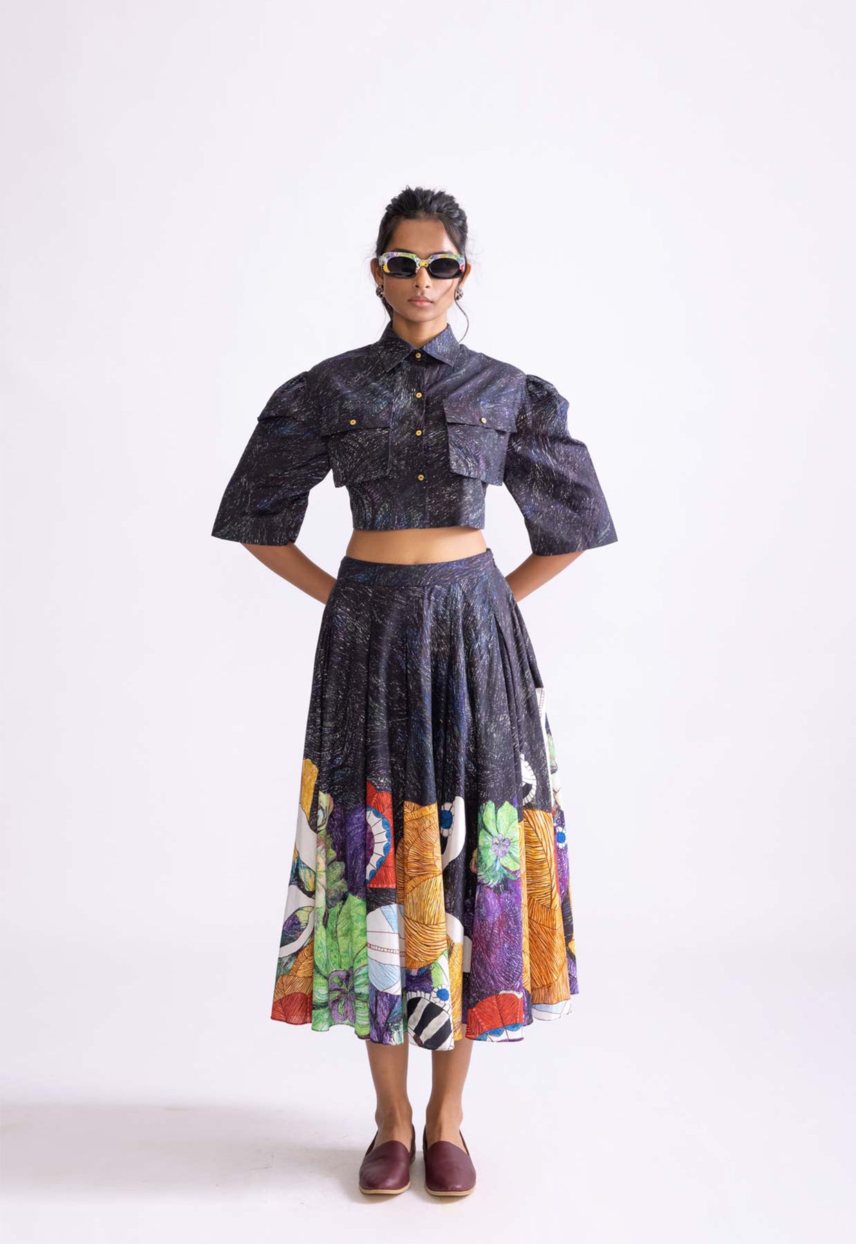 Wave print collared cropped shirt with pocket detailing and puff sleeves