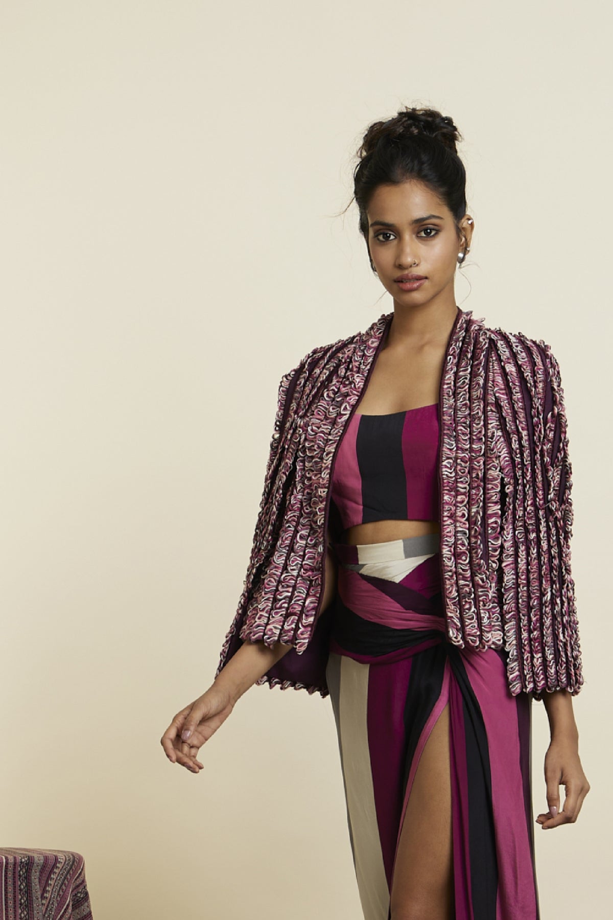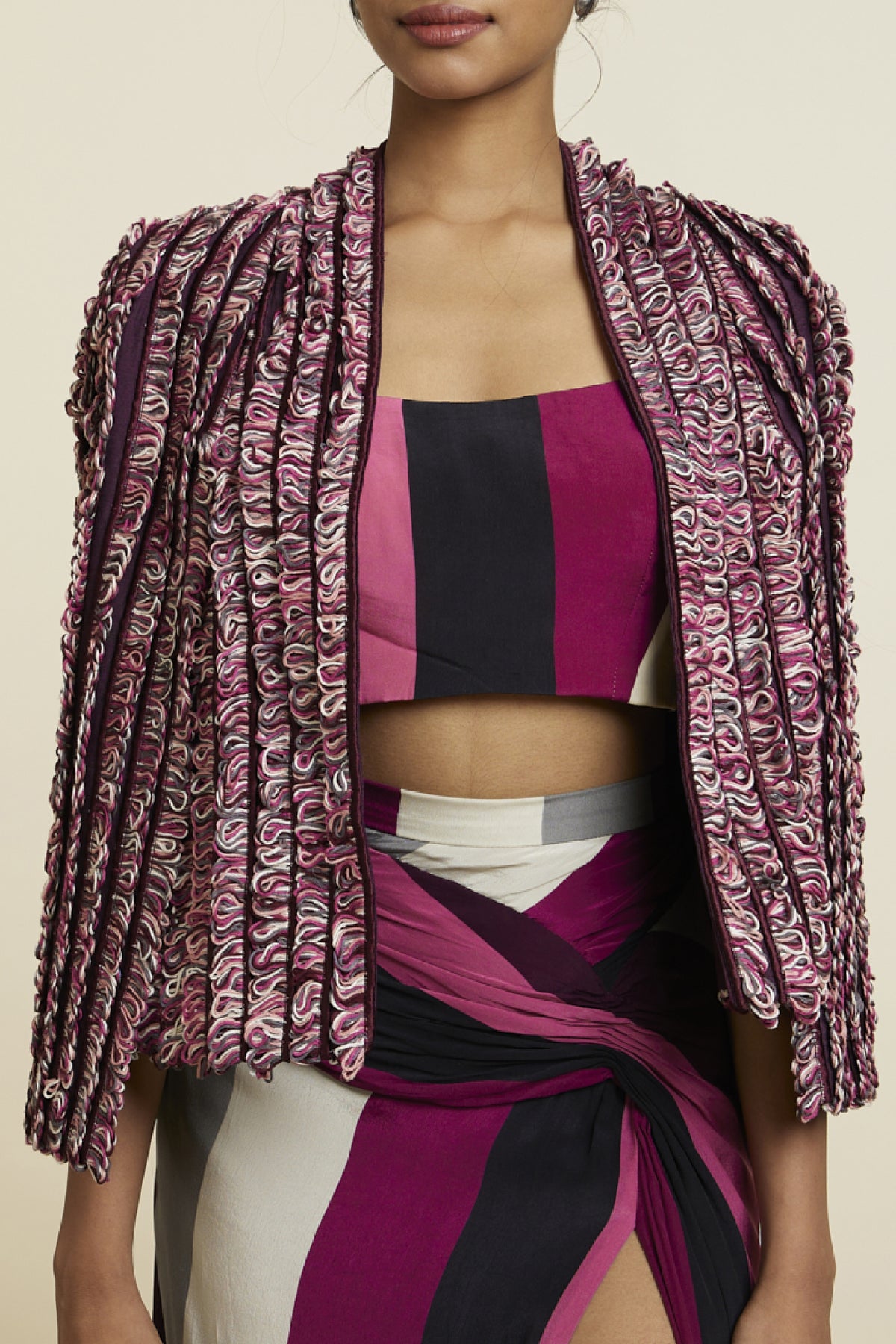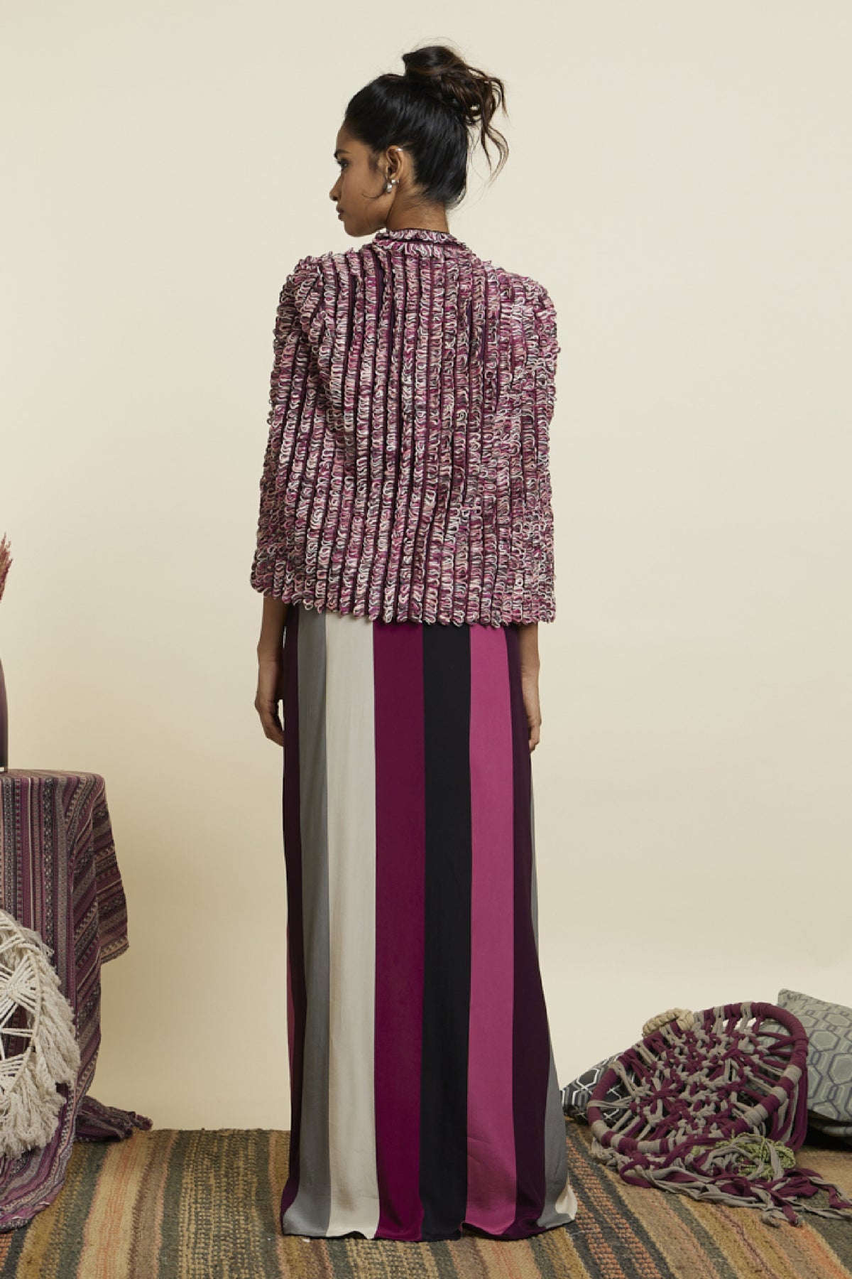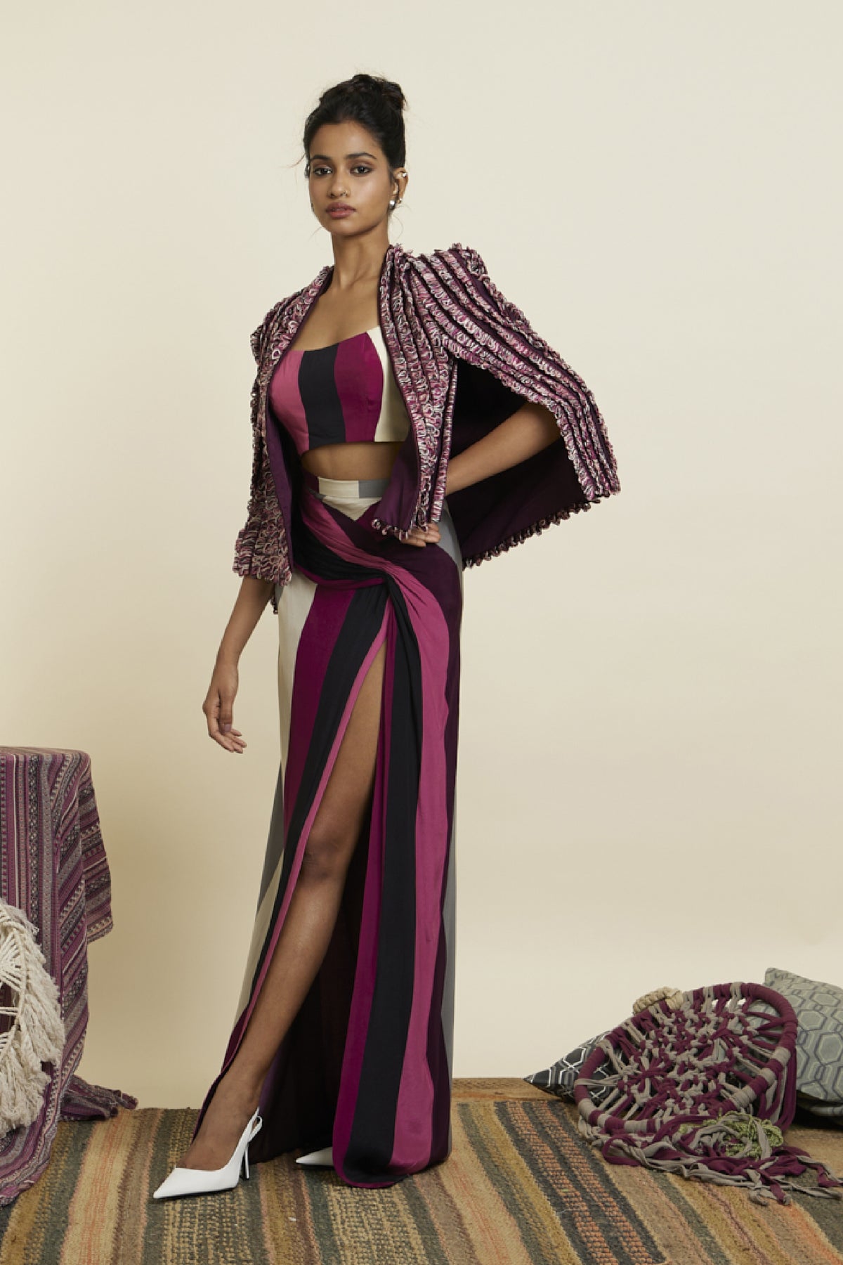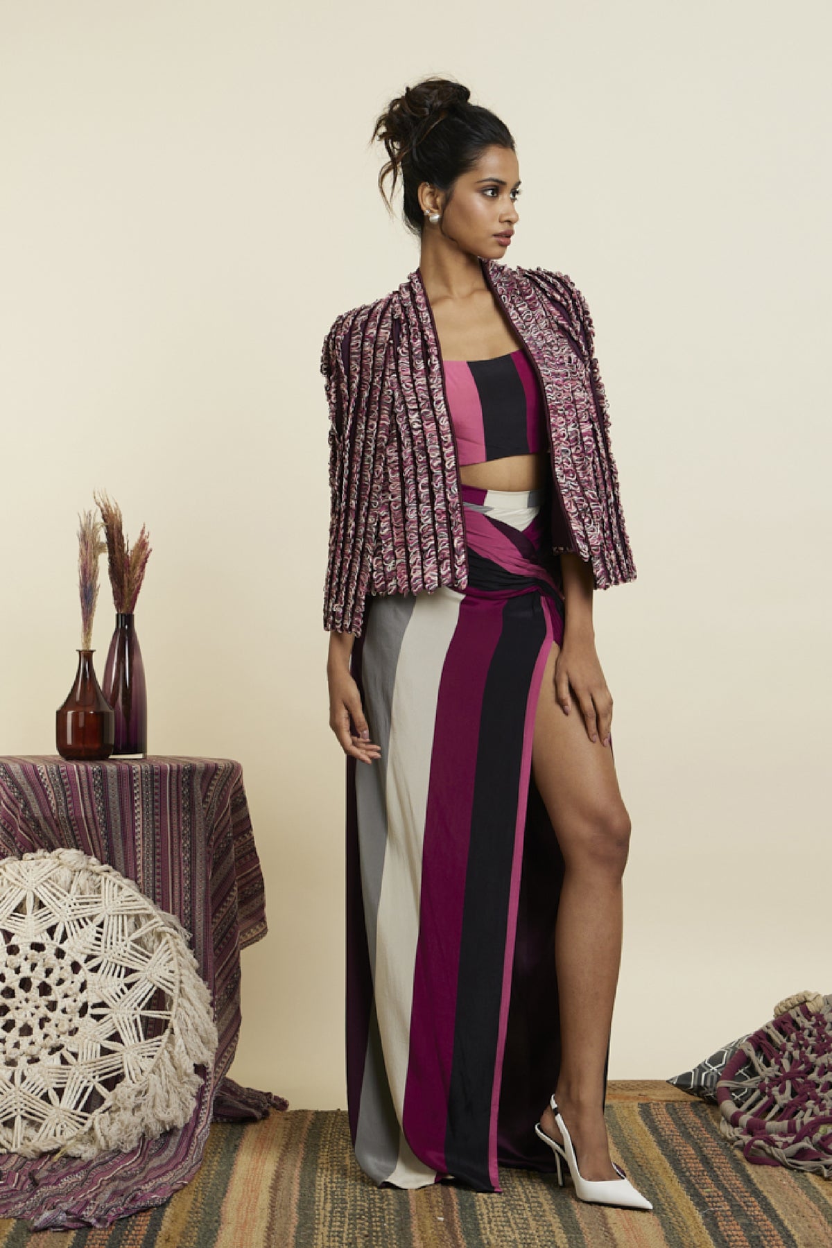 Textured noor jacket with merlot stripe print bustier side slit skirt