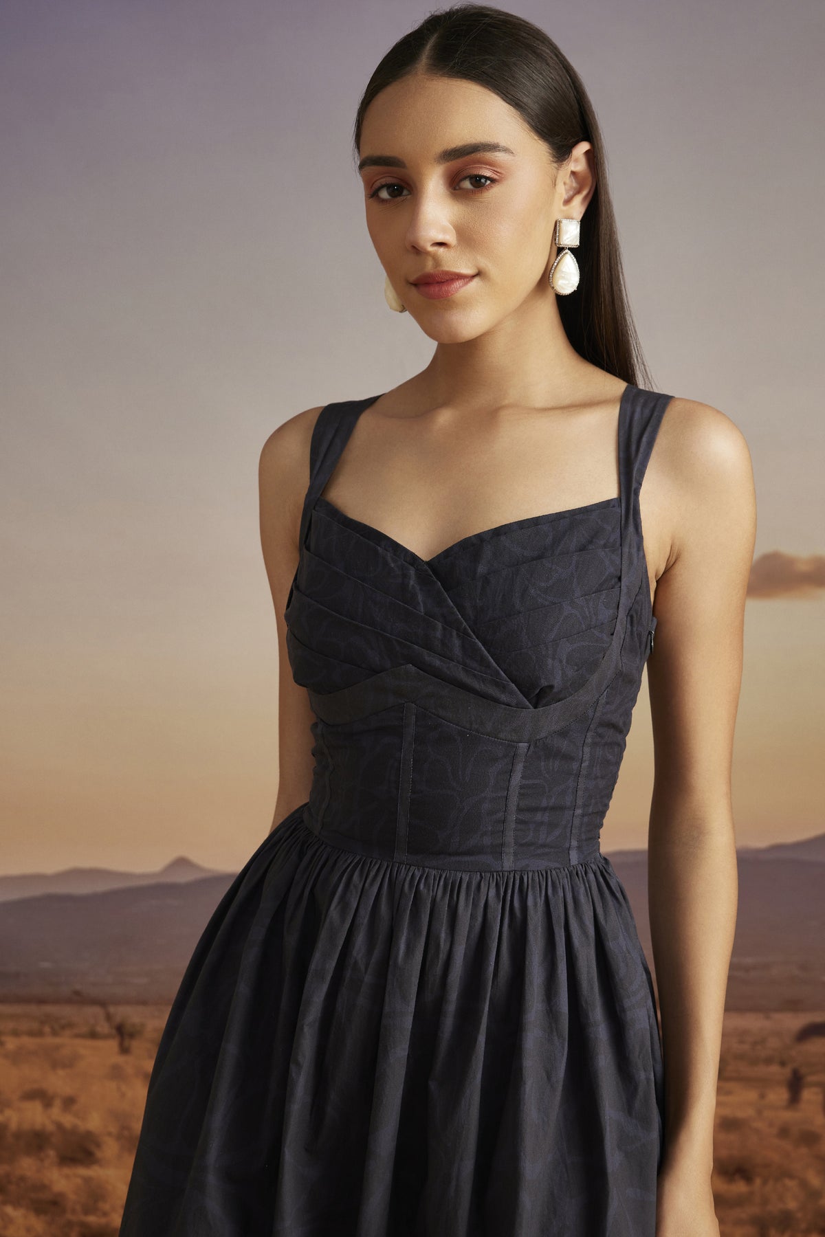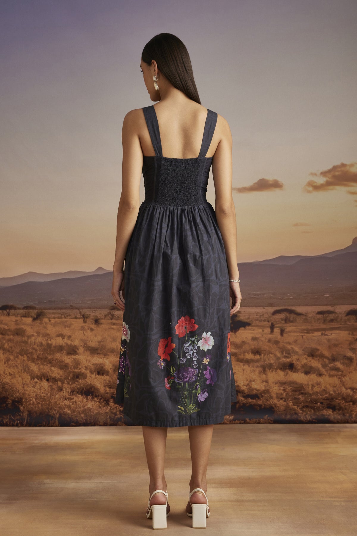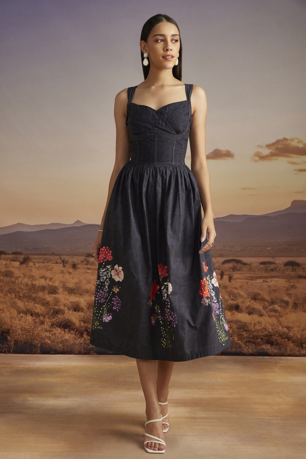 Sweetheart neckline cotton dress with beads detailing on floral print