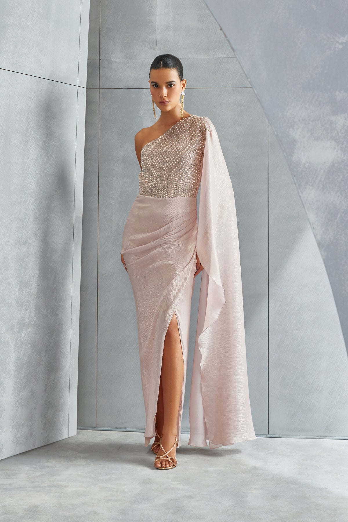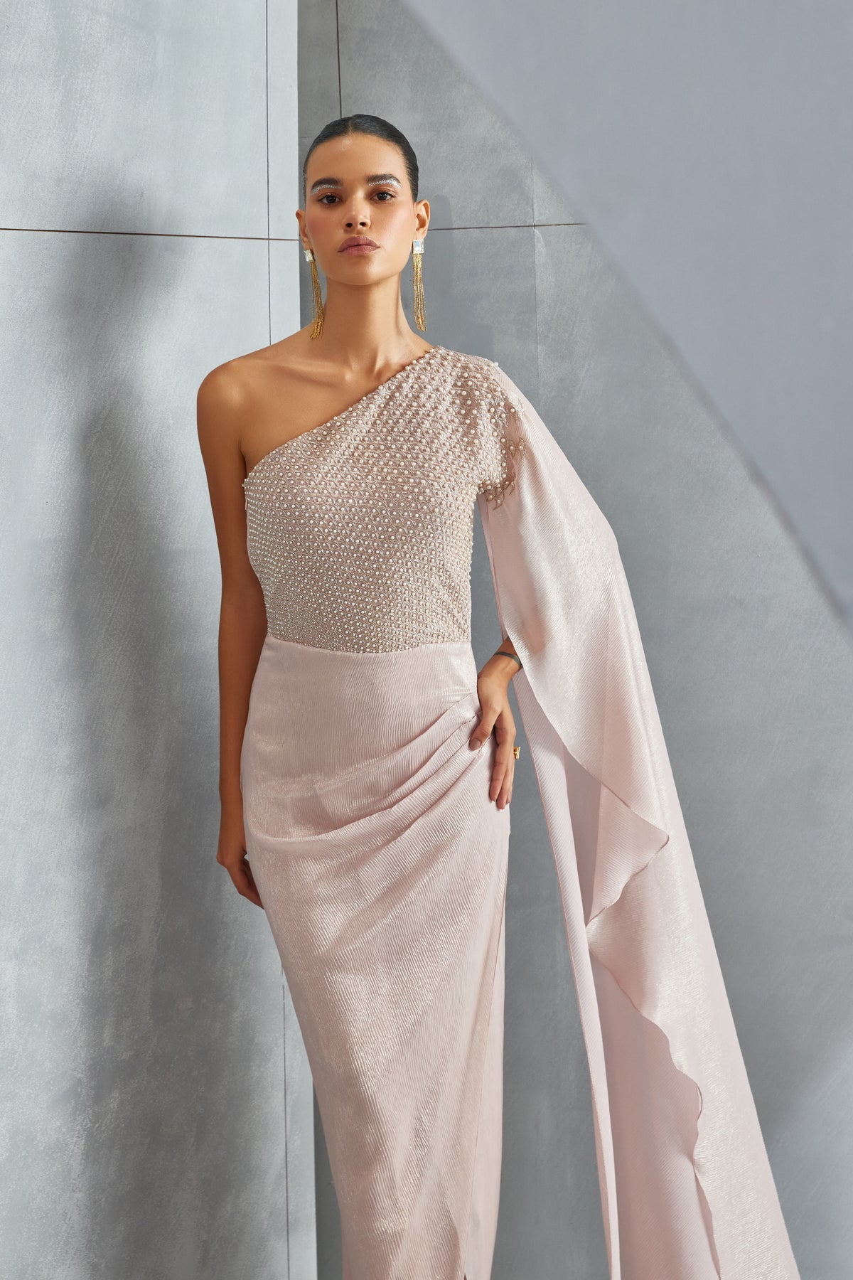 Namrata Joshipura Pearl Drop One Off Shoulder Gown Indian designer wear online shopping melange singapore
