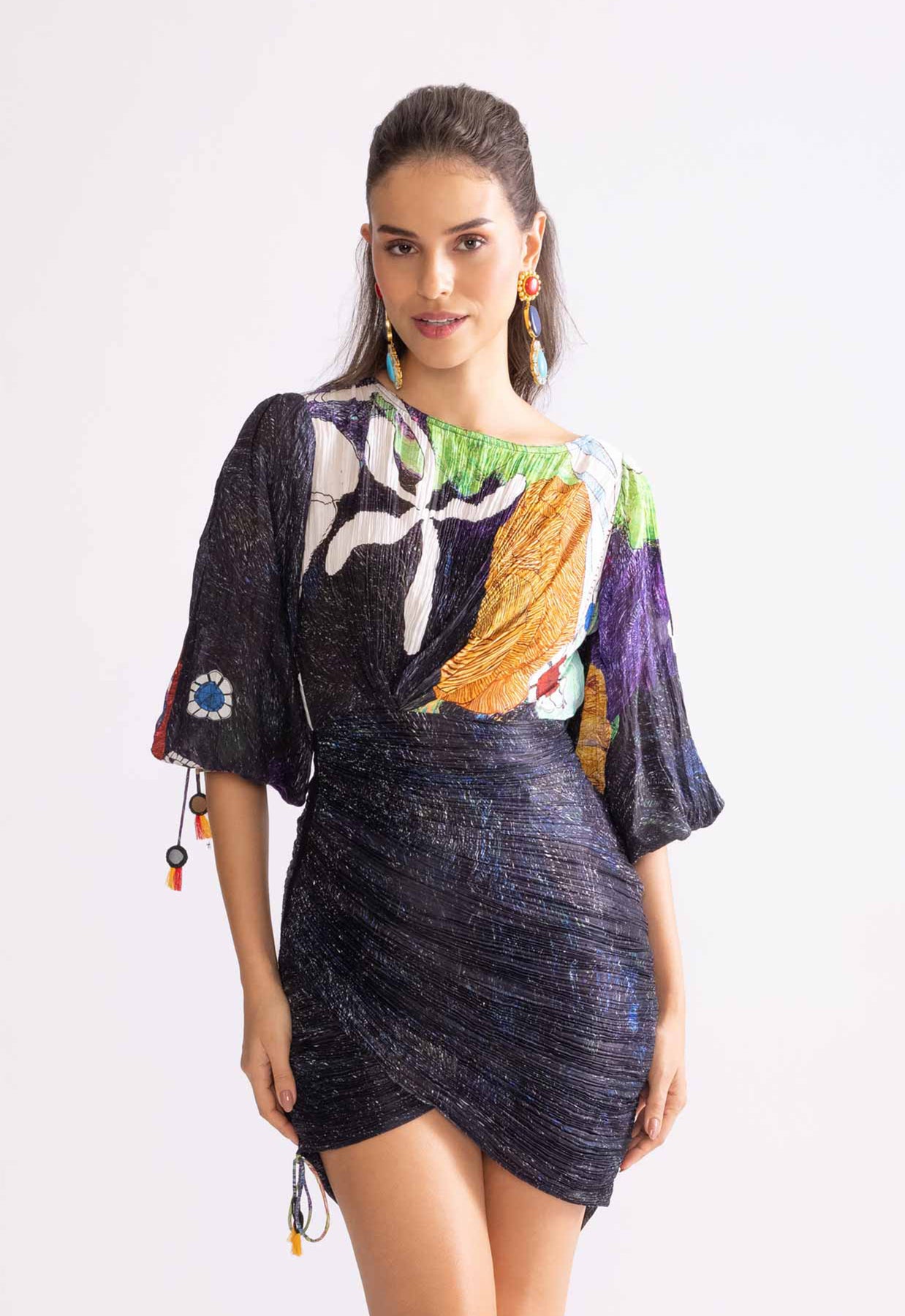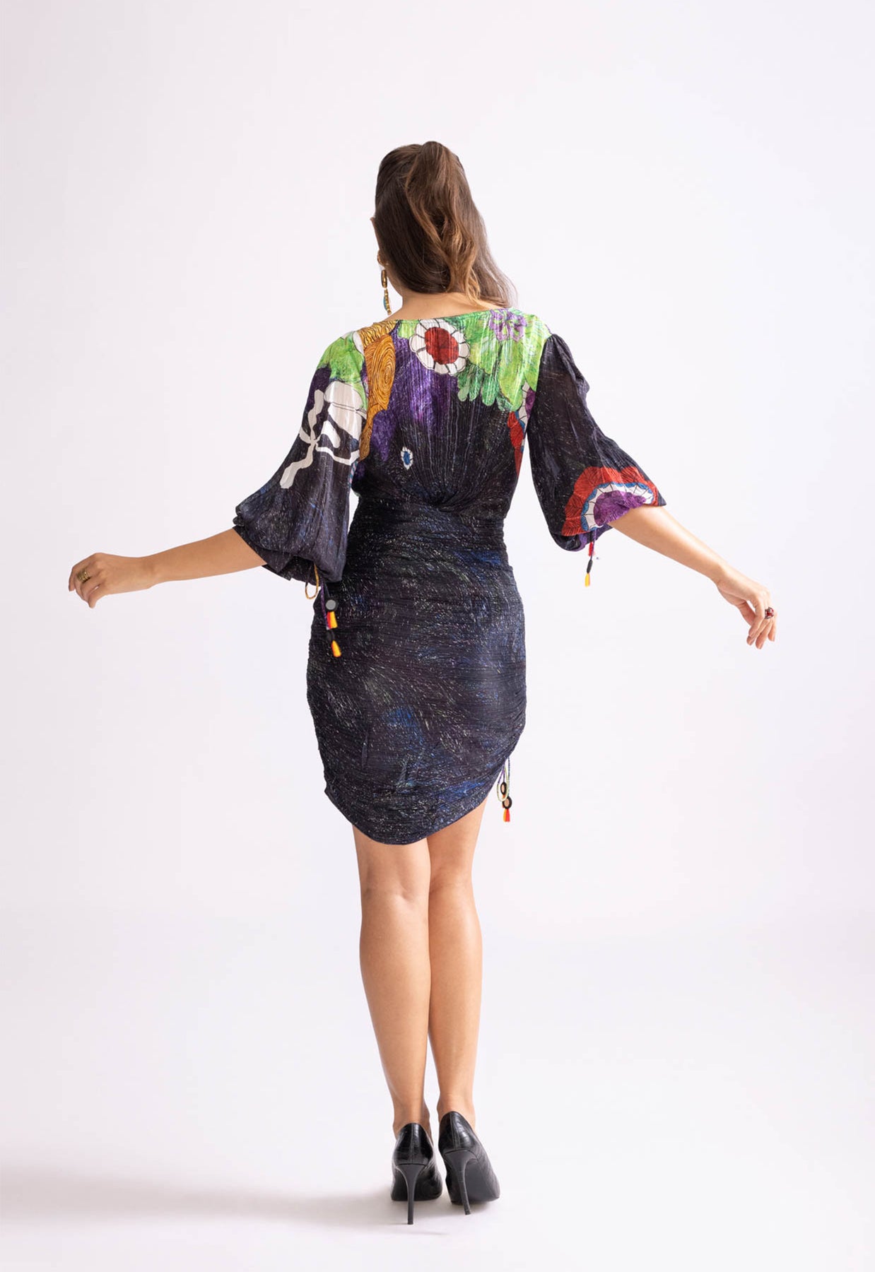 Tribal print hand micro pleat mini dress with overlap skirt and bell sleeves
