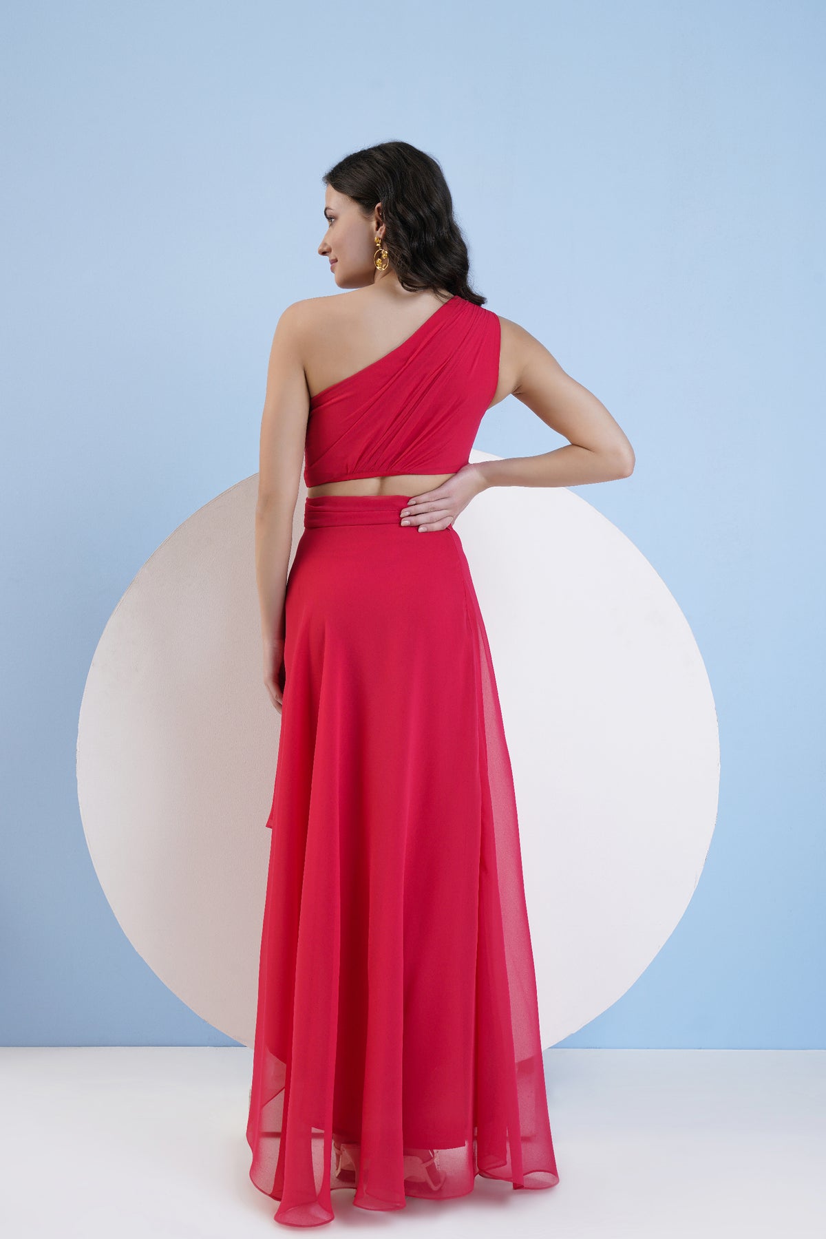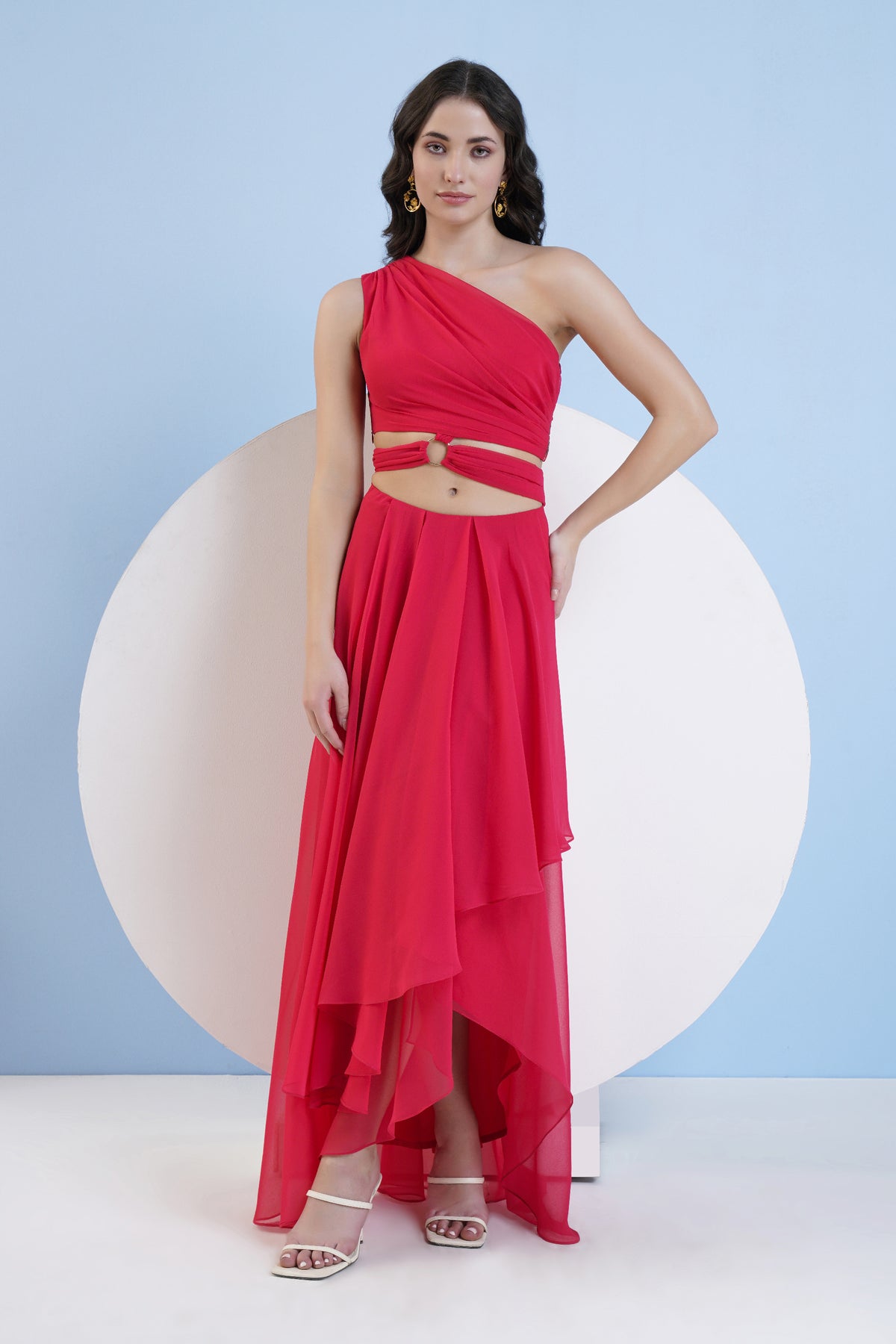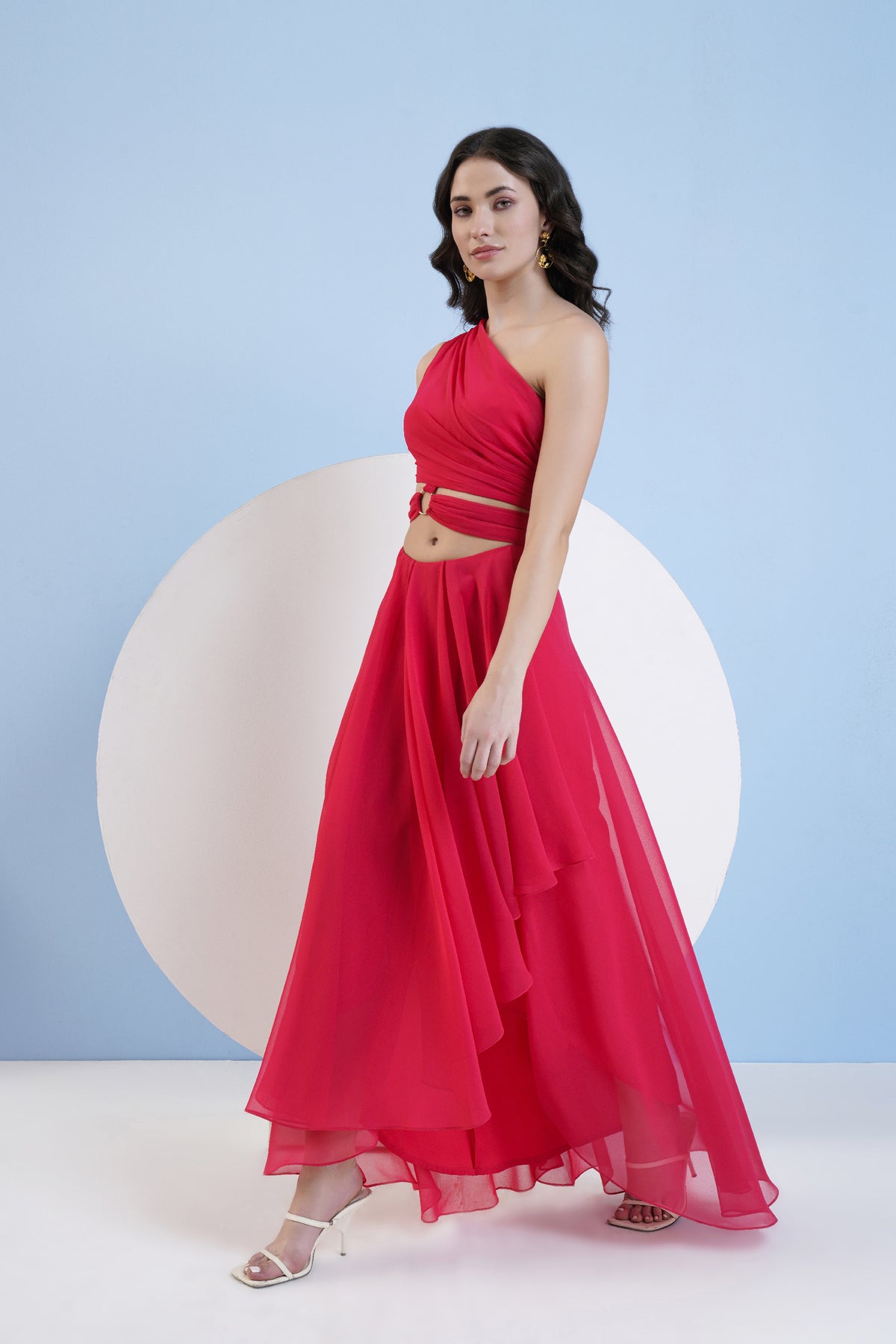 Red dark orchid printed short tiered dress in chiffon featuring waist cutout, frill detail and balloon sleeves