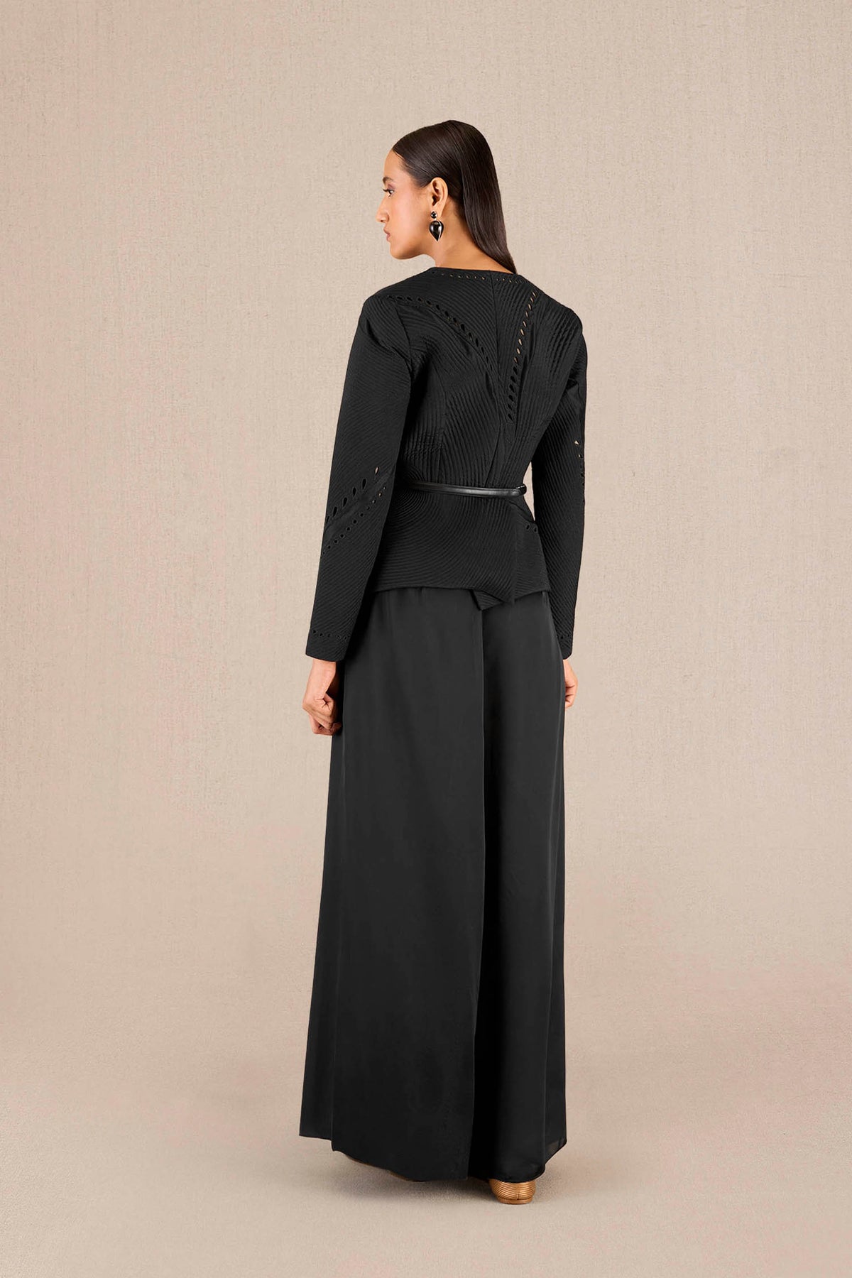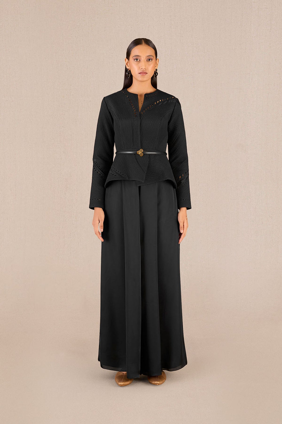 Luxury meets elegance in our rifat jacket set. With a structured peplum-inspired chanderi (cotton silk) jacket and matching chanderi palazzos, this all-black set is the perfect companion for all your work needs. Intricate quilting runs the length of the jacket in curving lines, punctuated by cut-out motifs of leaves and circles. Wear rifat with our aira bag and elena flats.