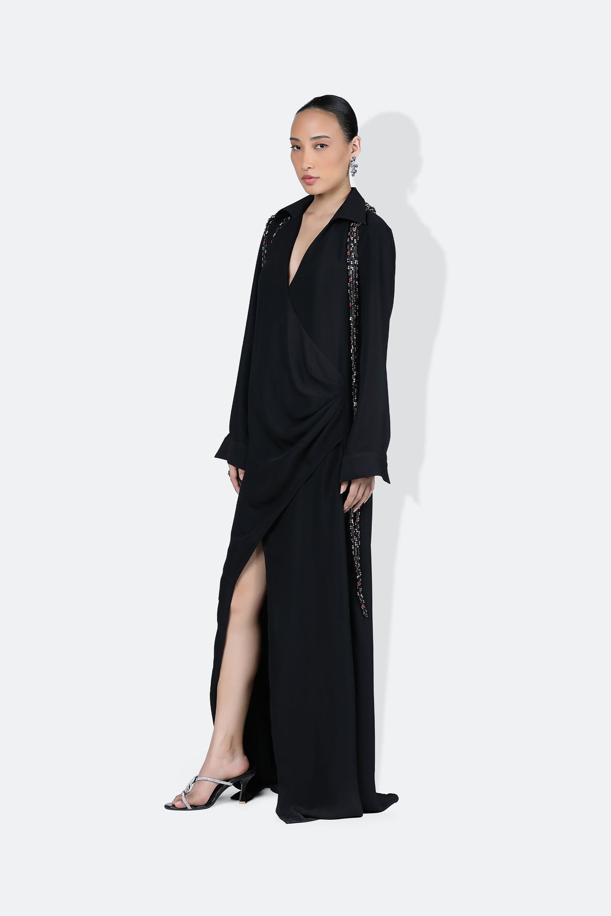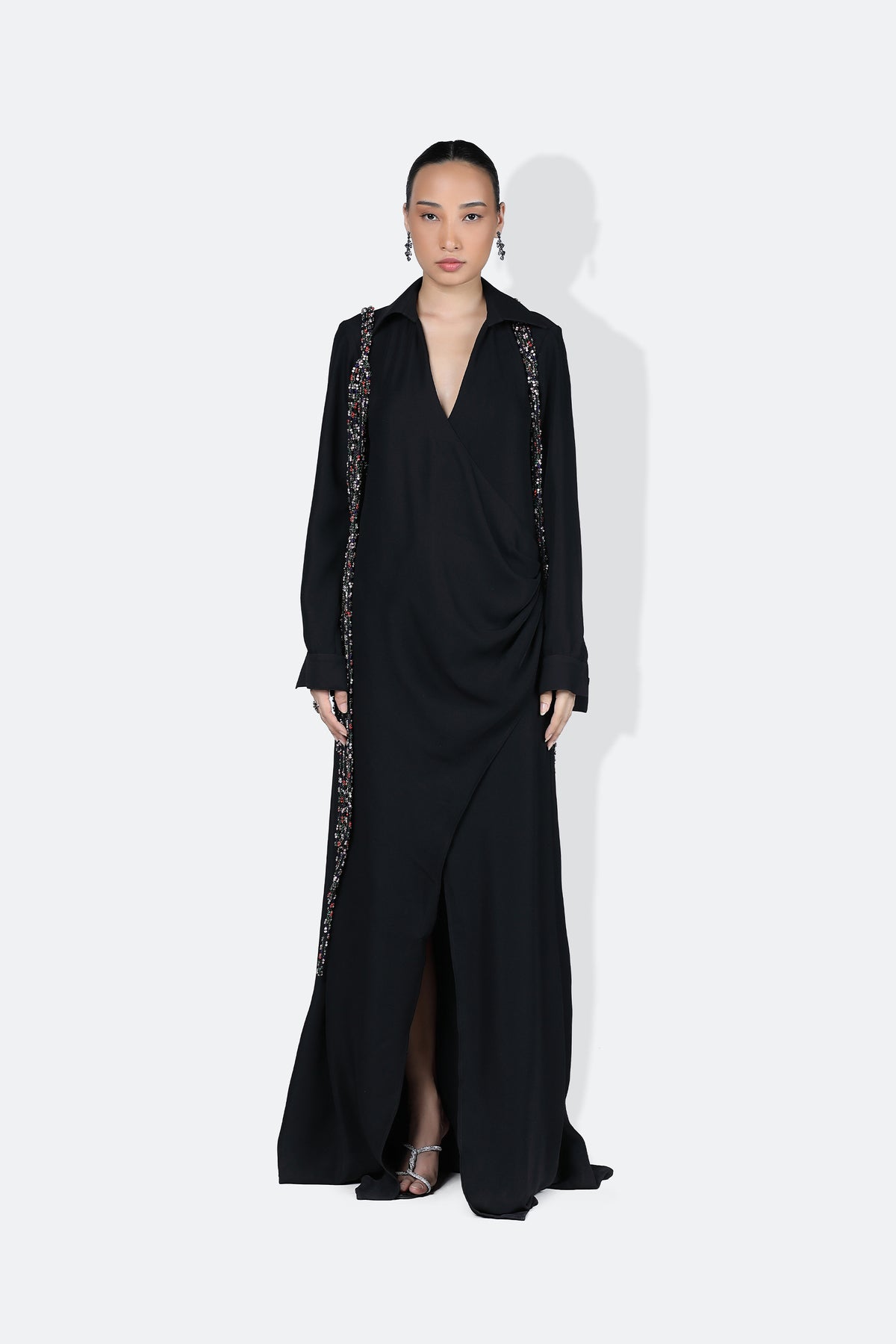 The scarlet dress is delicately crafted in a crepe and is designed with curved panels to fit the body perfectly. It features long sleeves and a slightly flared hem. Enhanced with a slit in the front, that makes it a sexy dress that serves looks..