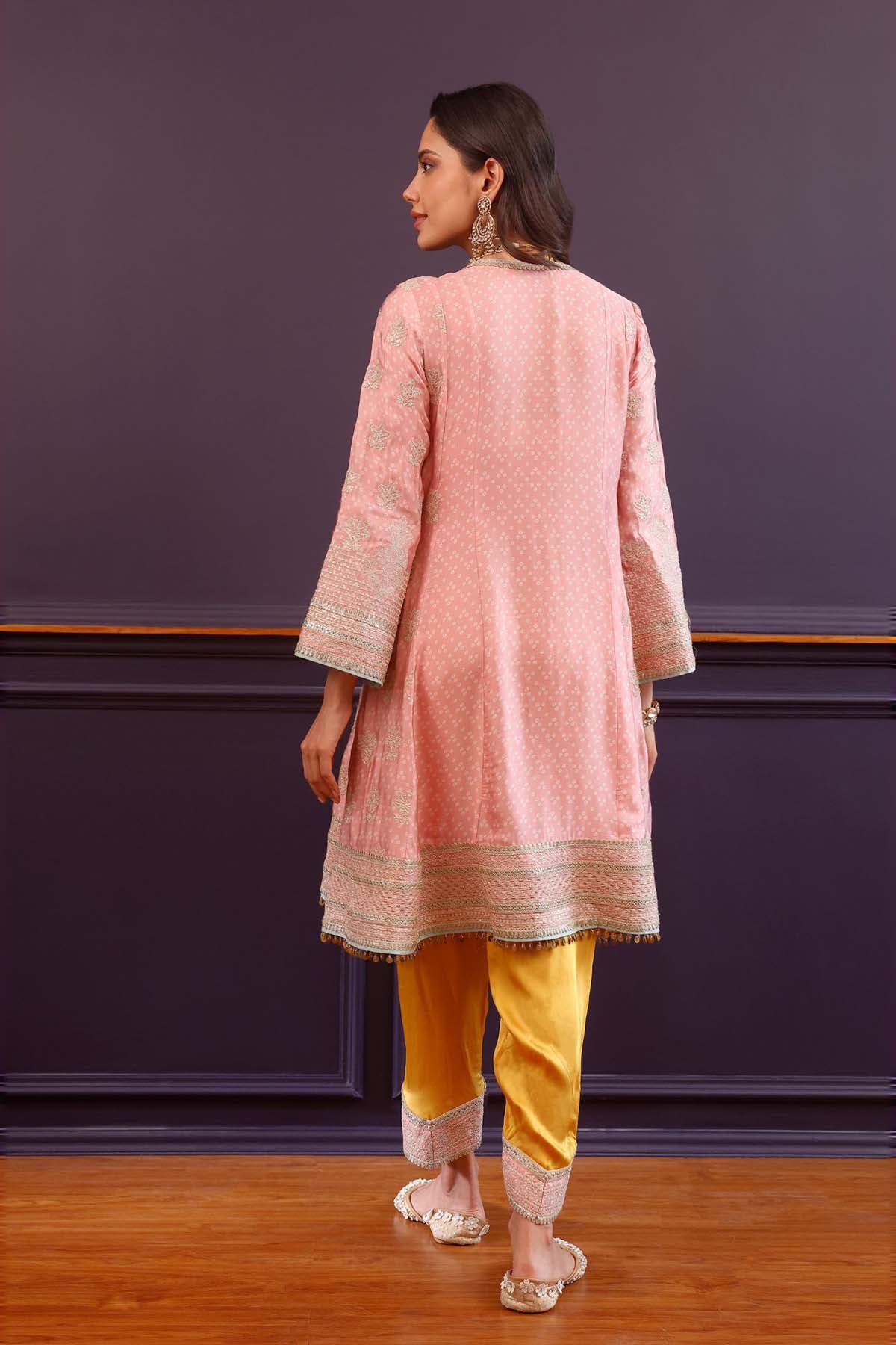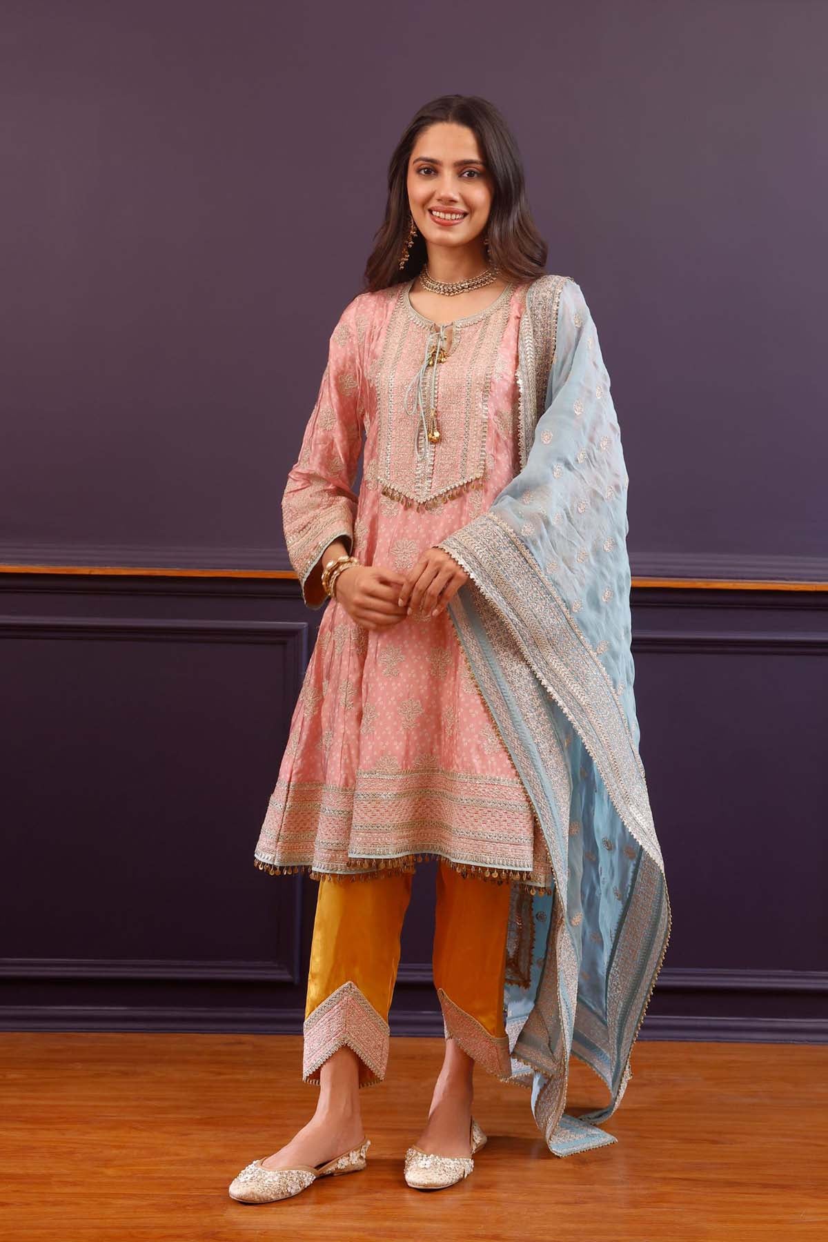 Delicate yet striking, this printed anarkali kurta in soft pink cupro satin brings an understated charm. The breezy anarkali fit moves with grace, complemented by straight satin pants for a grounded finish. Draped with a teal blue tissue dupatta, the set is equal parts playful and poised; a festive essential that feels timeless yet modern. In every size, the top and bottom lengths are an additional half inch.