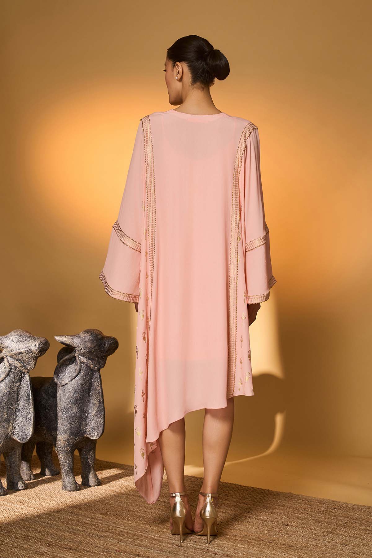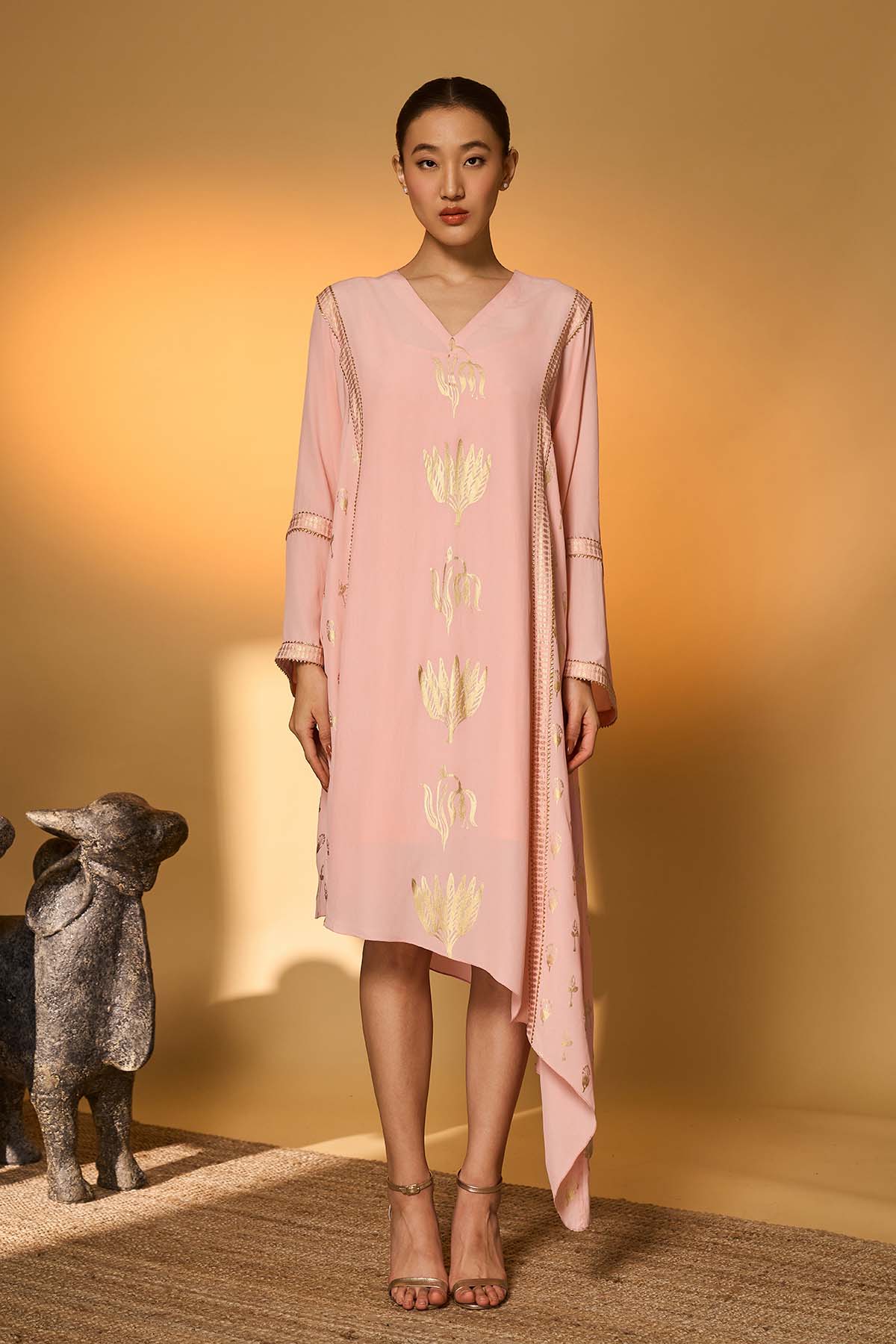 This baby pink kaftan features a clean v-neck silhouette accented with delicate foil motifs placed along the center front. Subtle lace detailing runs along the seams and sleeve edges, adding refined texture. The asymmetrical hemline creates a modern drape, enhancing movement and ease. Designed with full-length sleeves and a relaxed fit, this piece balances minimal elegance with understated detailing. The kaftan comes with a solid shantoon slip. unique visual interest.