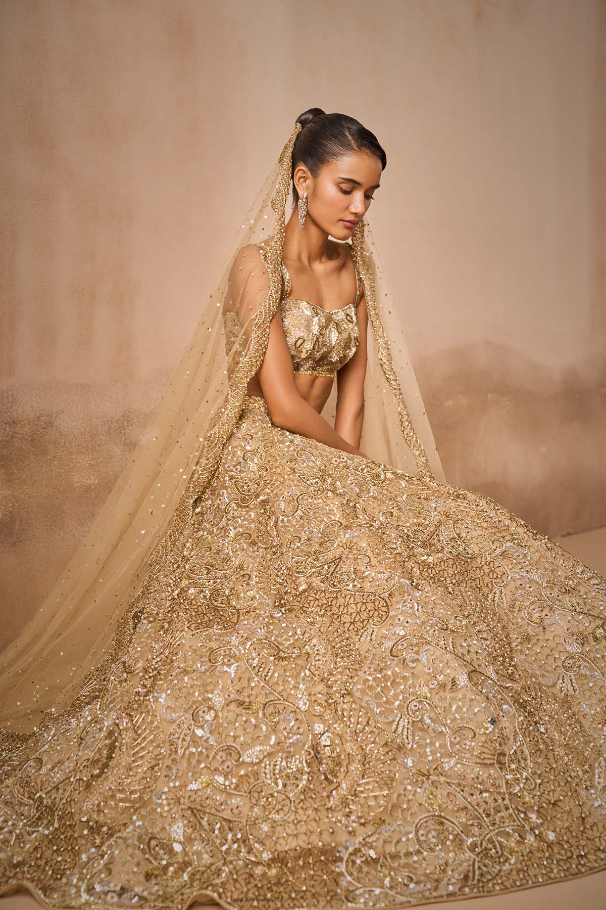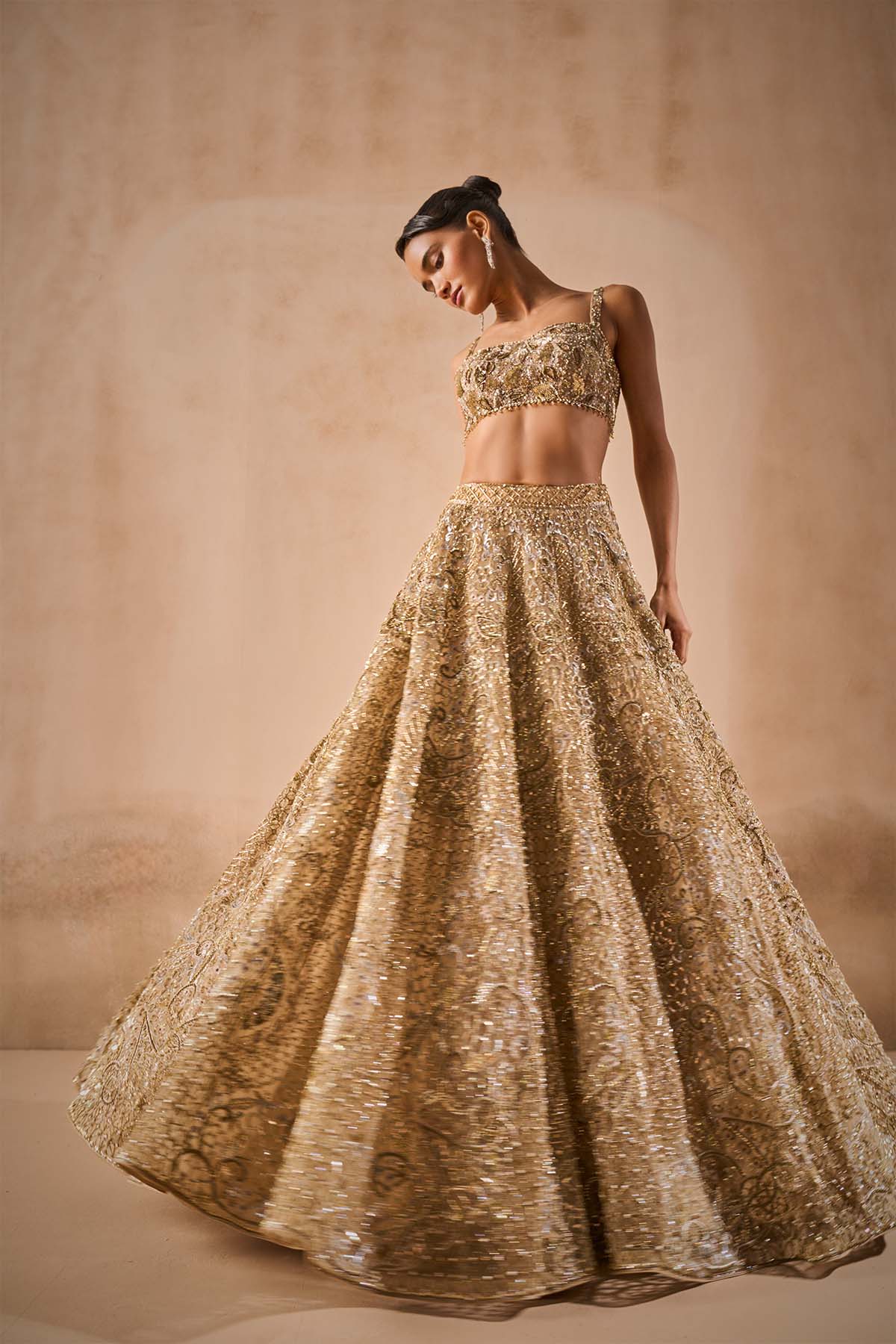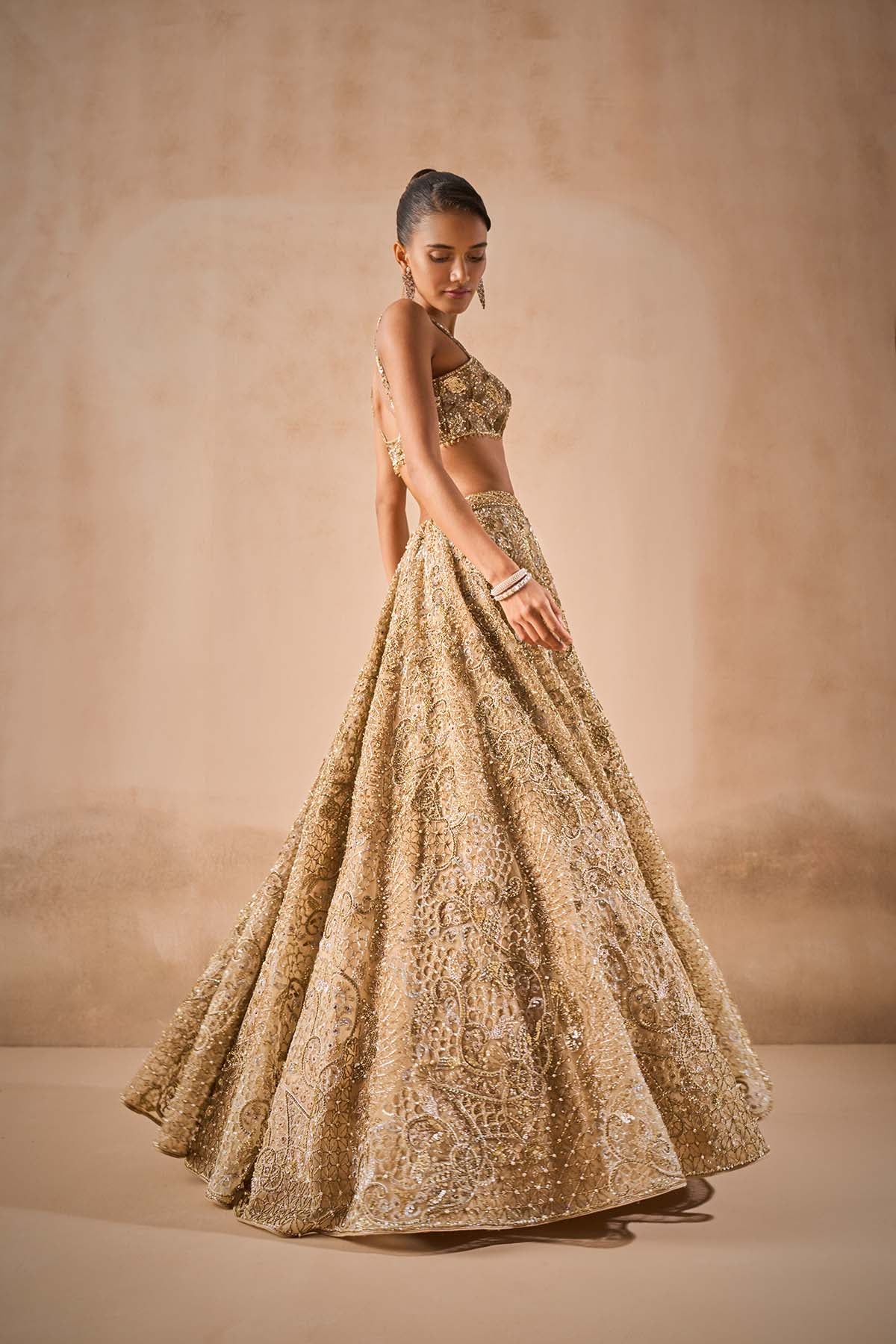 Beige gold tulle lehenga set with a sleeveless blouse and tulle dupatta with embroidery in sequin, cutdana, pearls and beads