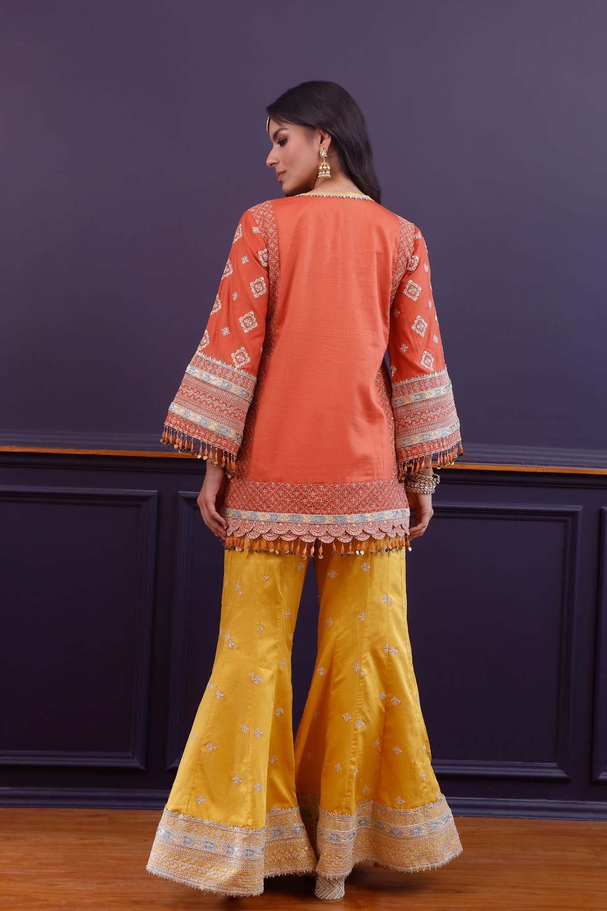 A bold orange kurta in soft pima satin, styled with mustard sharara pants for a striking contrast. This set feels vibrant, youthful, and perfect for celebratory dressing. In every size, the top and bottom lengths are an additional half inch.
