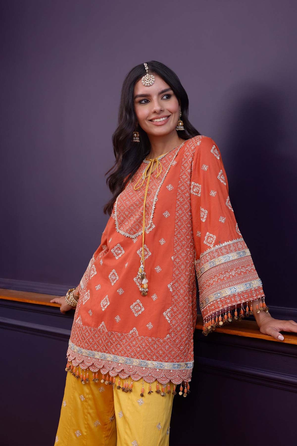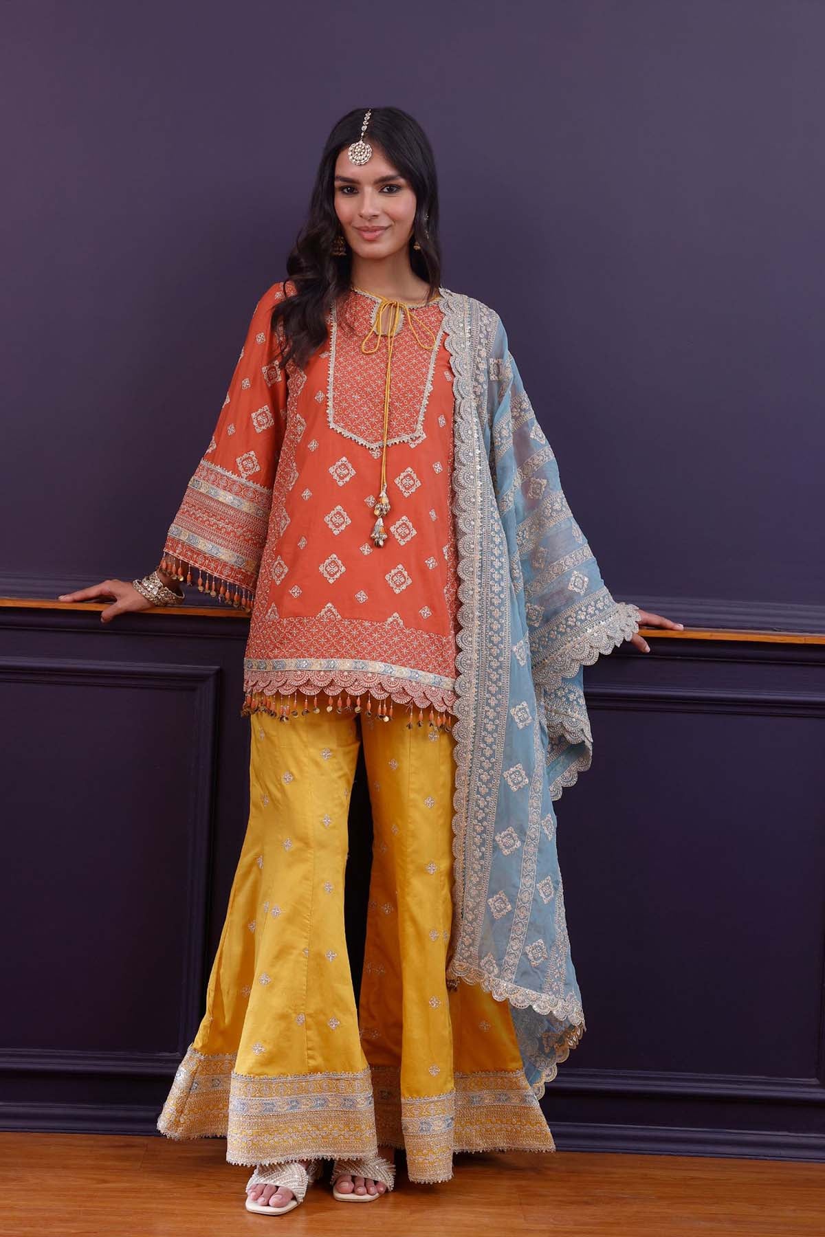 A bold orange kurta in soft pima satin, styled with mustard sharara pants for a striking contrast. Draped with a sky blue organza dupatta, this set feels vibrant, youthful, and perfect for celebratory dressing. In every size, the top and bottom lengths are an additional half inch.