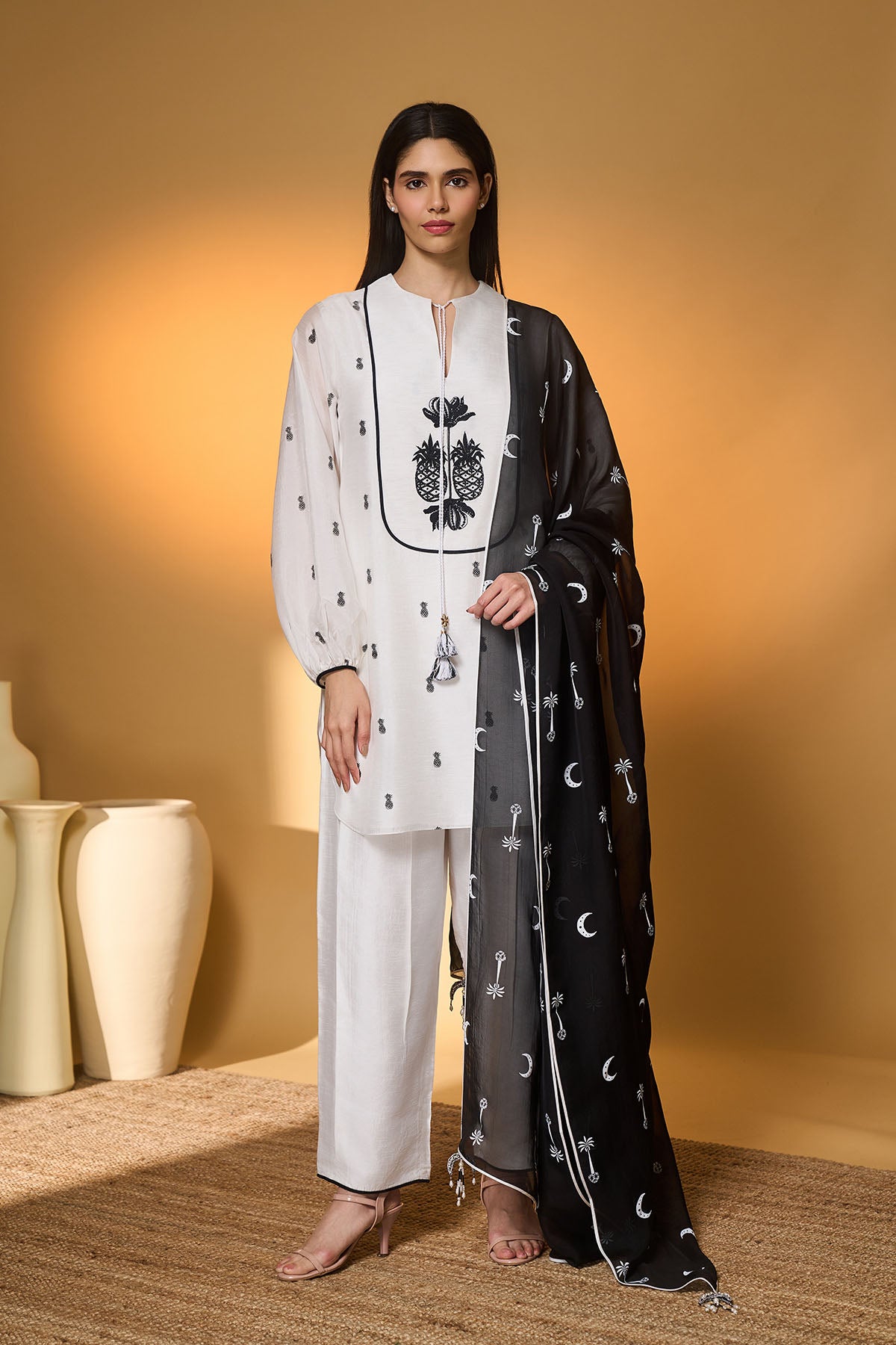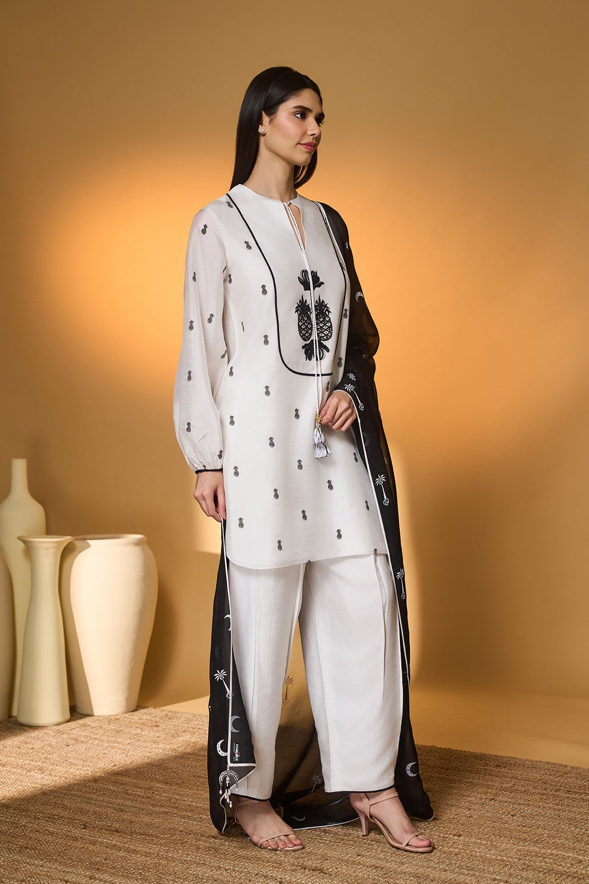 Kurta- split neckliine with tie-up closure adorned with contrast tassels | yoke embellished with 'pine-code' embroidery | all-over khadi print | contrast piping detail | subtle balloon sleeves with cuff closure pants- pleat detail | contrast piping detail | side seam zipper closure dupatta- 'lunar aisle' khadi all-over | contrast piping detail | adorned with tassels