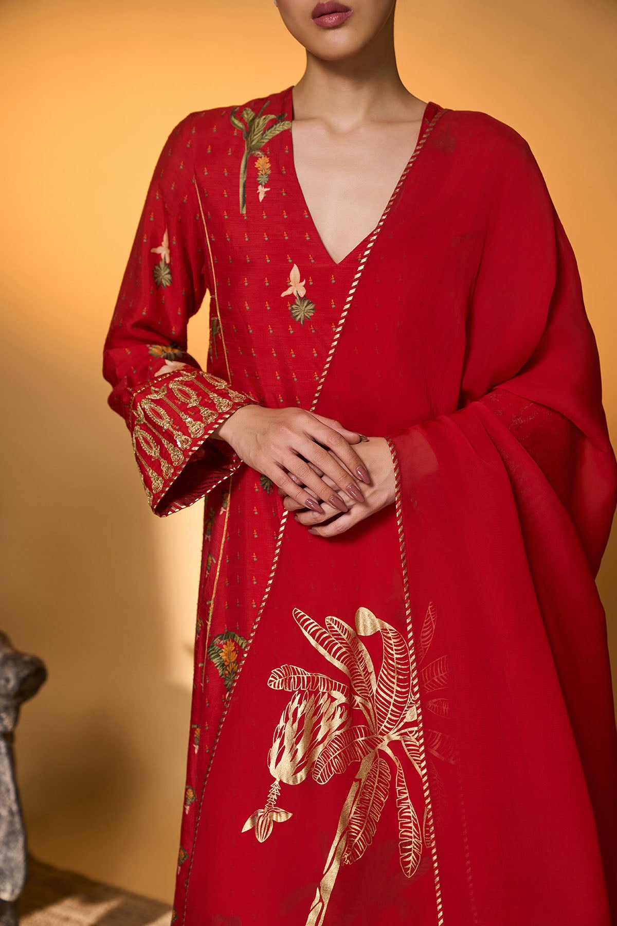 Kurta – the kurta has a digital print placement at the front and back | the sides have a repeat tropical print finished with kinari | the sleeves have an embroidered border. Pants – the pants are made in raw silk. Dupatta – the dupatta has a tropical nandi foil print placement finished with kinari..